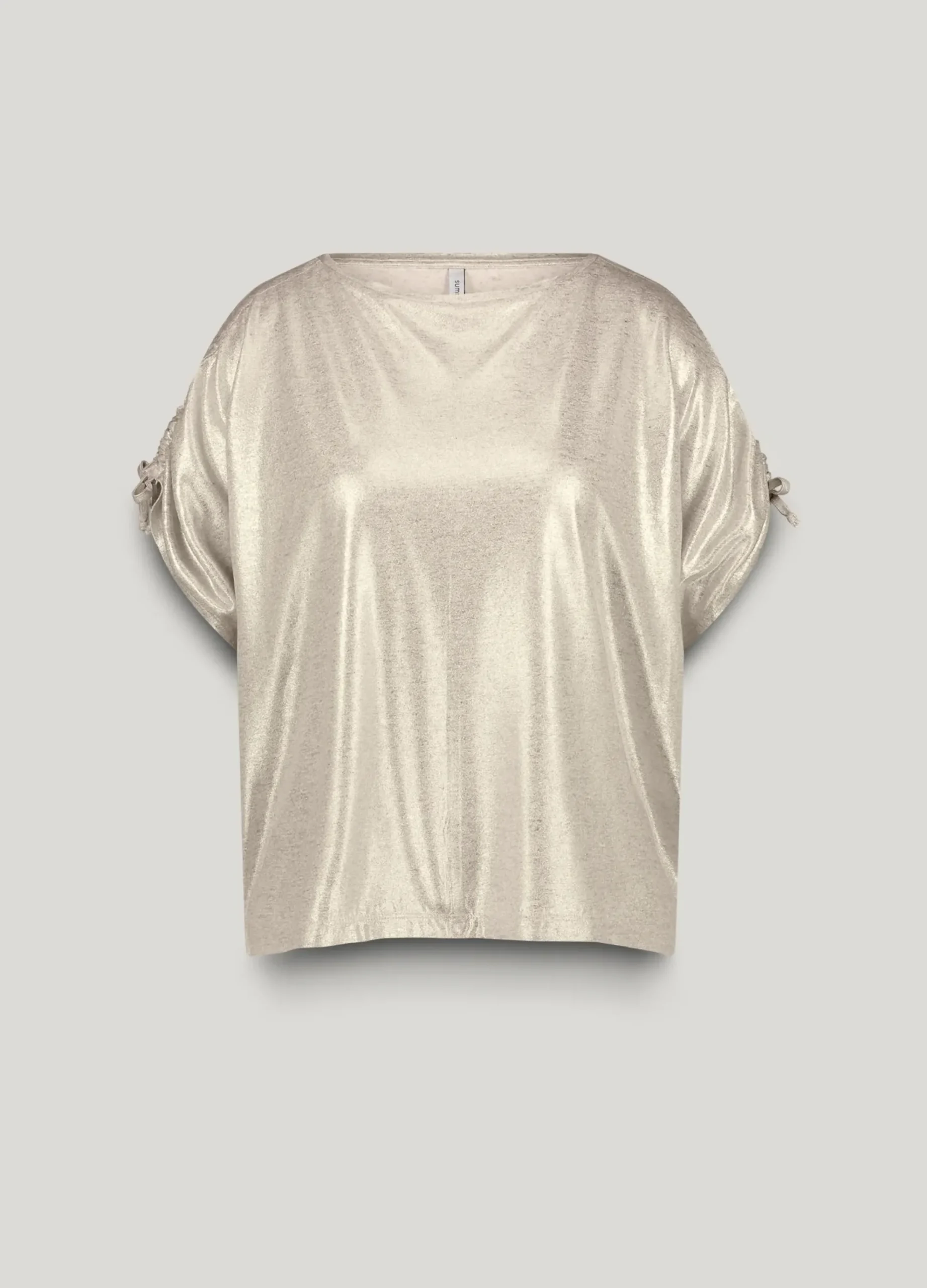 This metallic top is made of a linen-viscose jersey with shiny foil coating. Thanks to the adjustable cord on the shoulder, you can opt for a sleeve or sleeveless look.