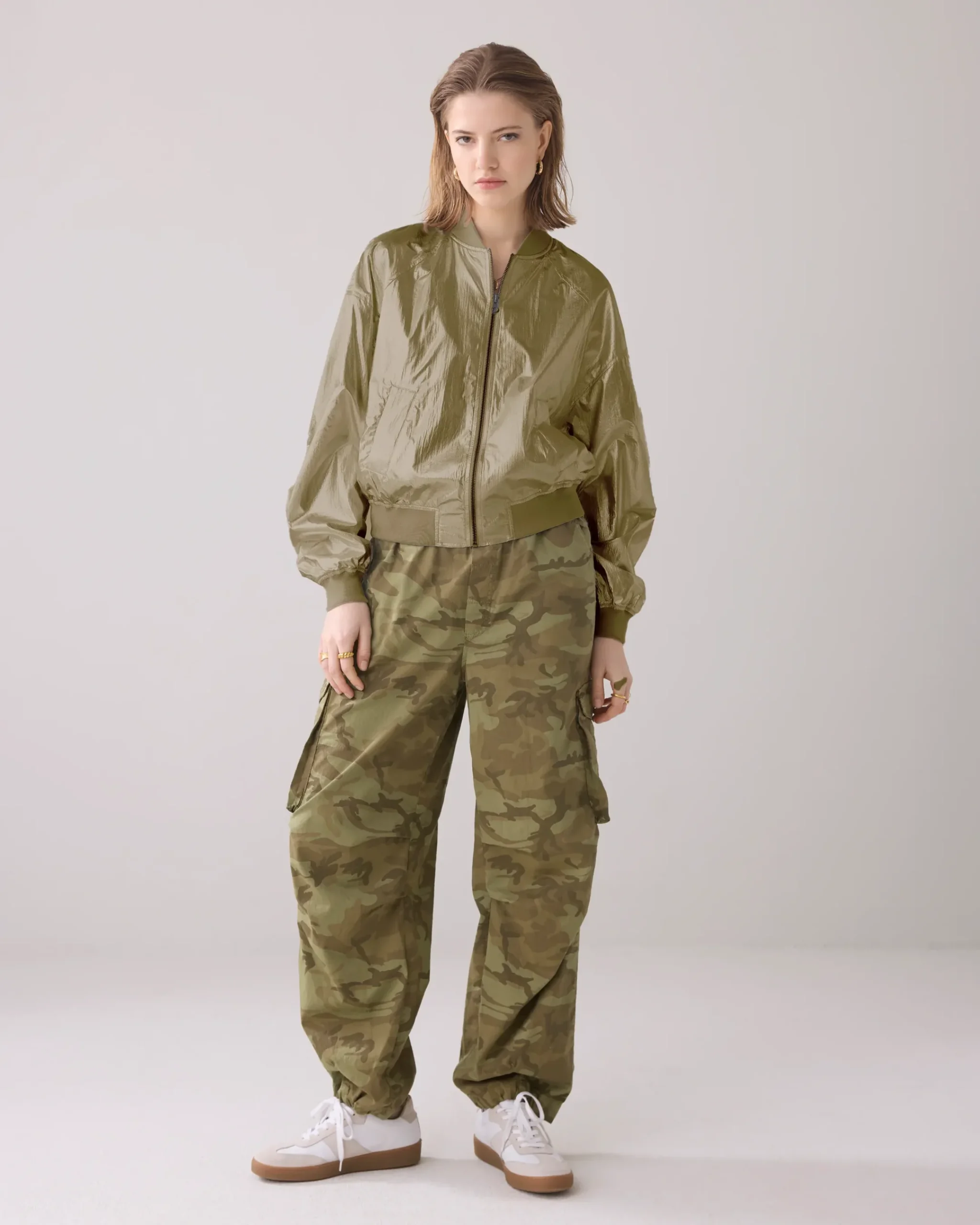 bomber jacket in a shiny metallic fabric. The jacket has ribbed cuffs, hem and collar.
