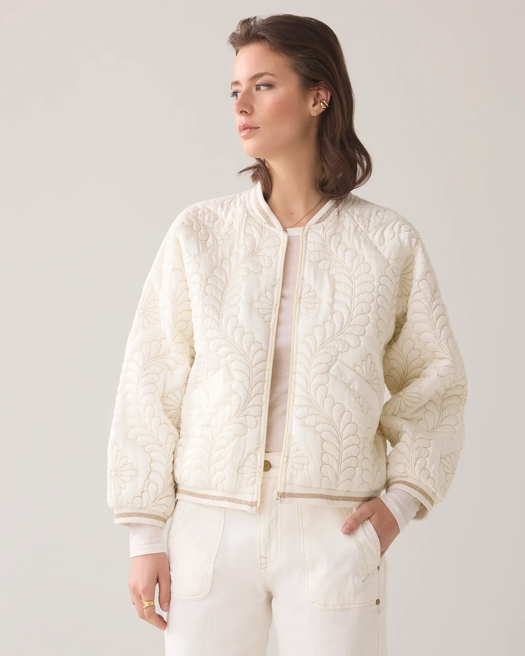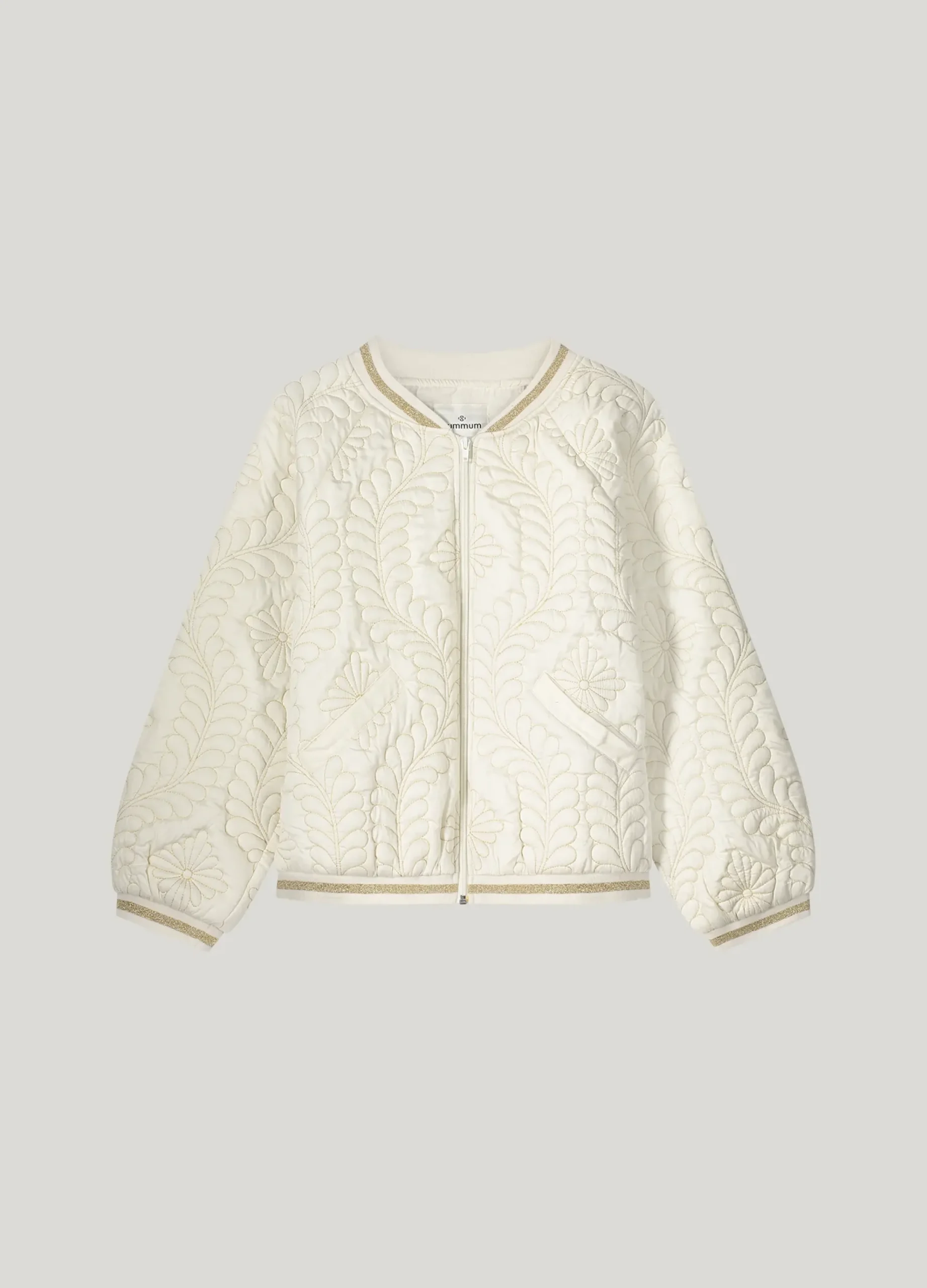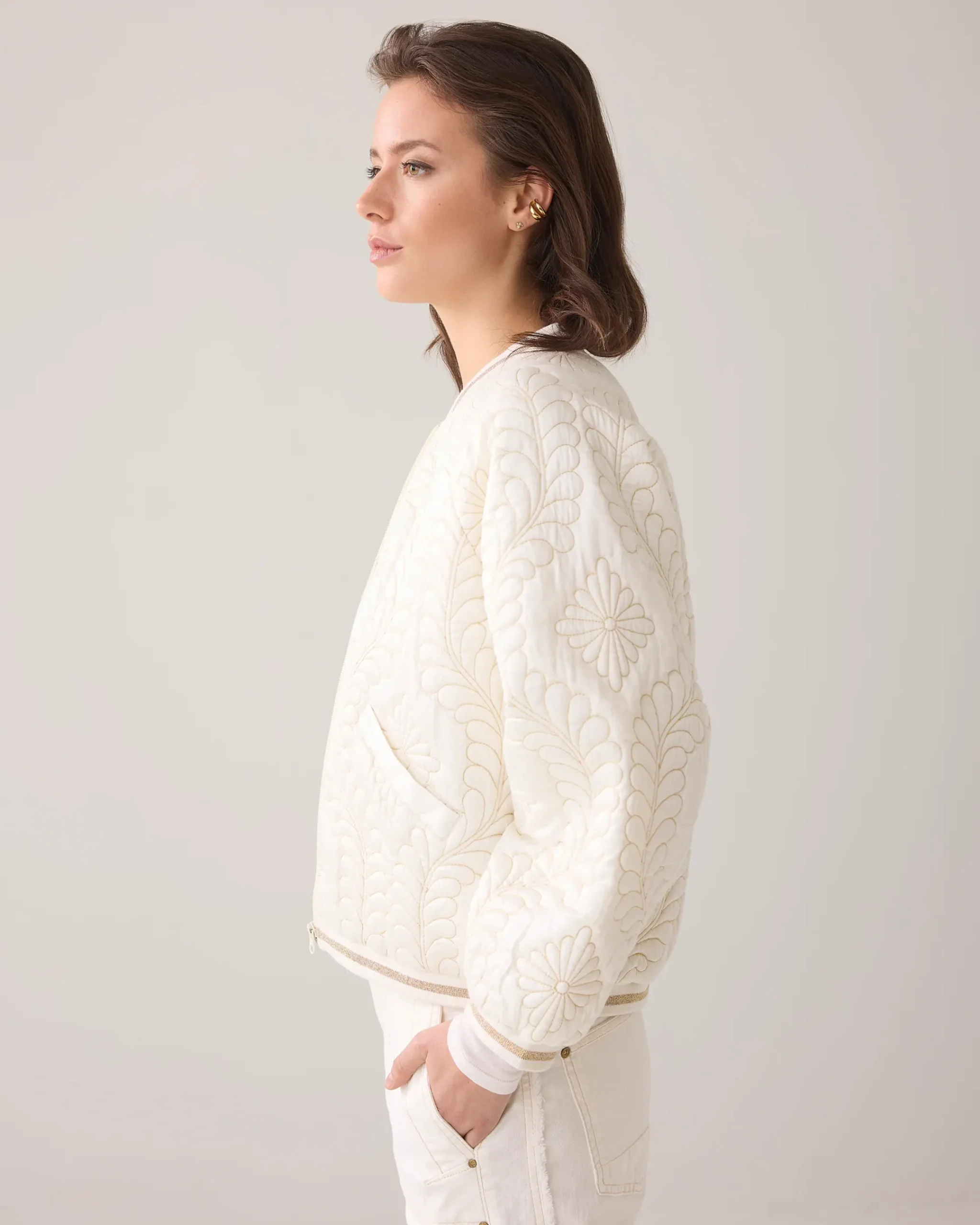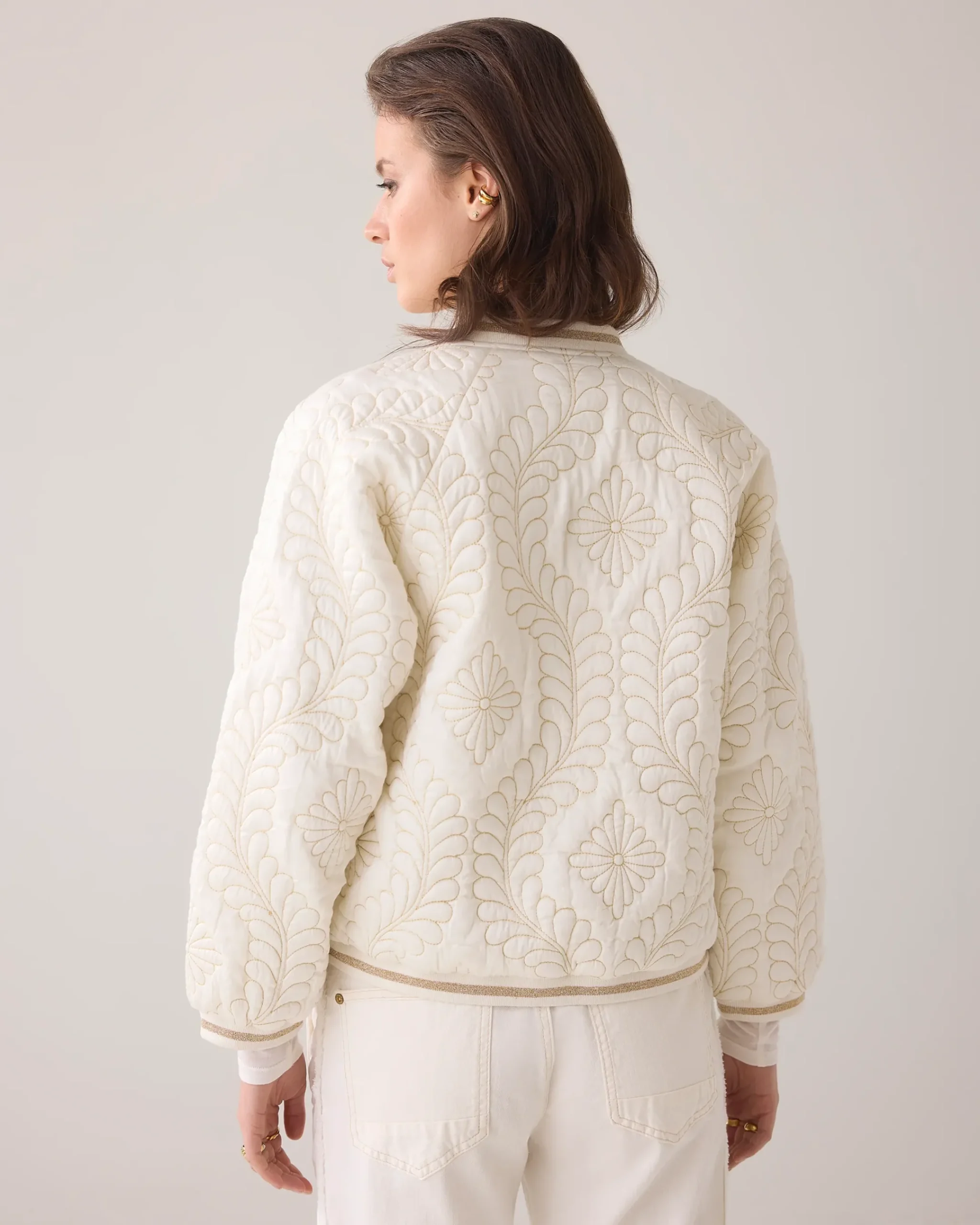 This quilted bomber jacket is made of satin and lined with cotton voile. The gold lurex thread and botanical pattern give the jacket a luxurious touch.