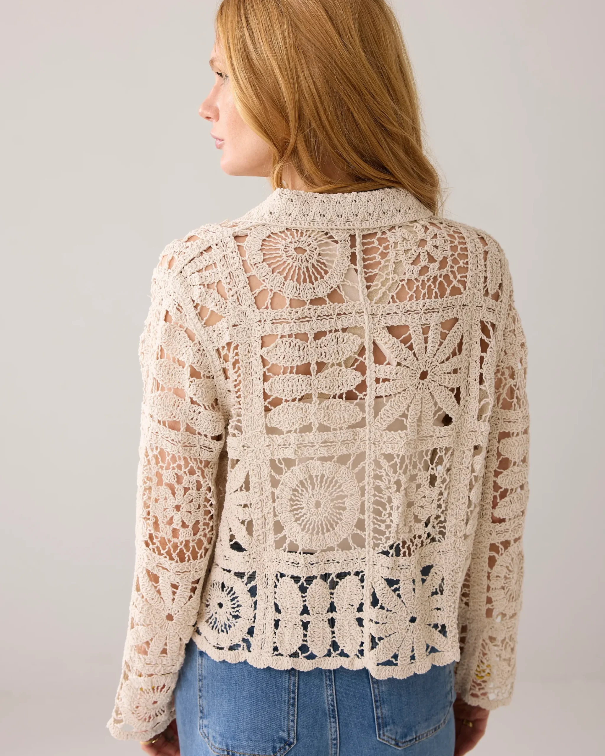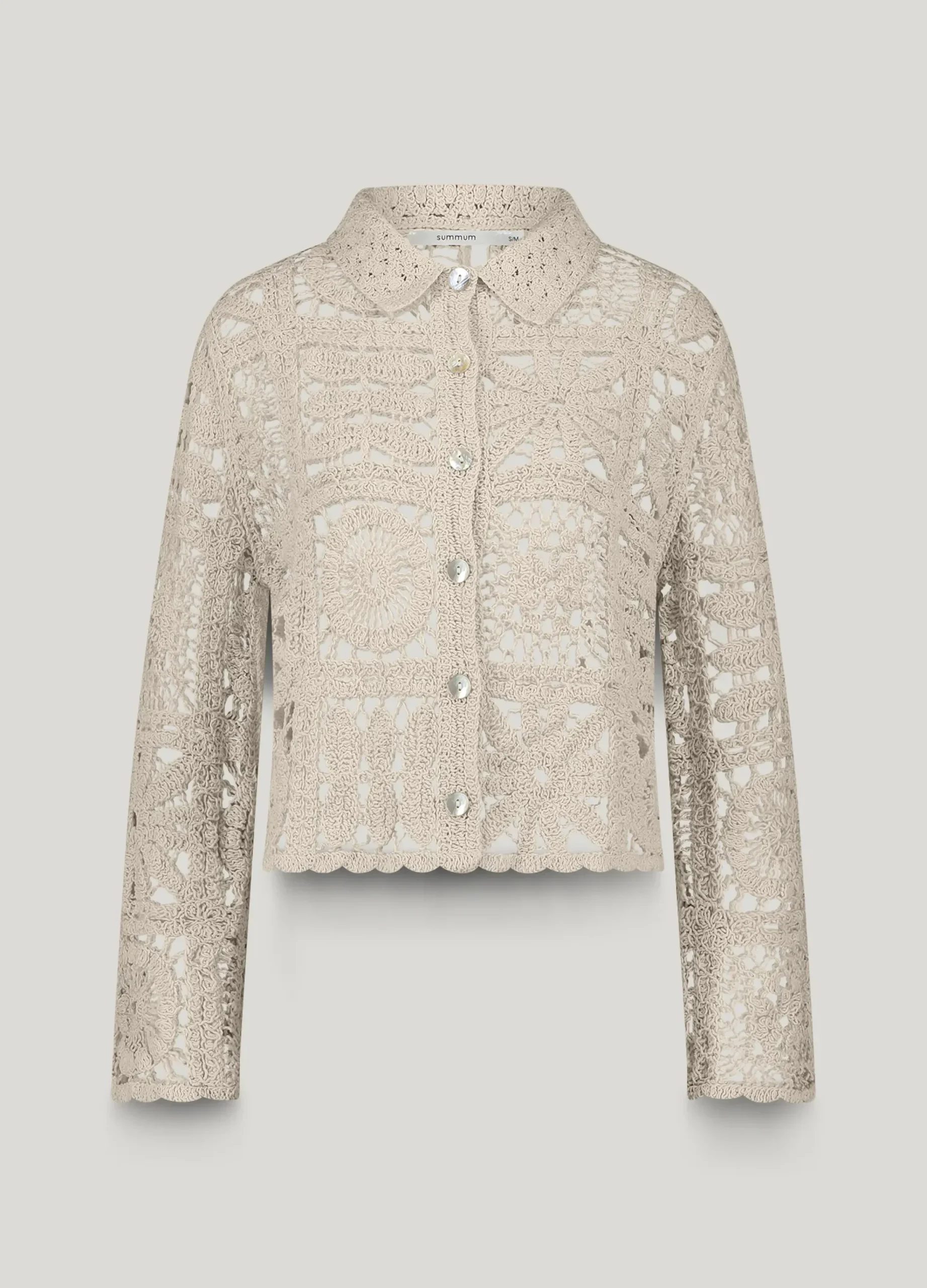 This crochet cardigan of various crochet patterns has a straight fit and is made of 100% cotton. The top has a mother-of-pearl button fastening.