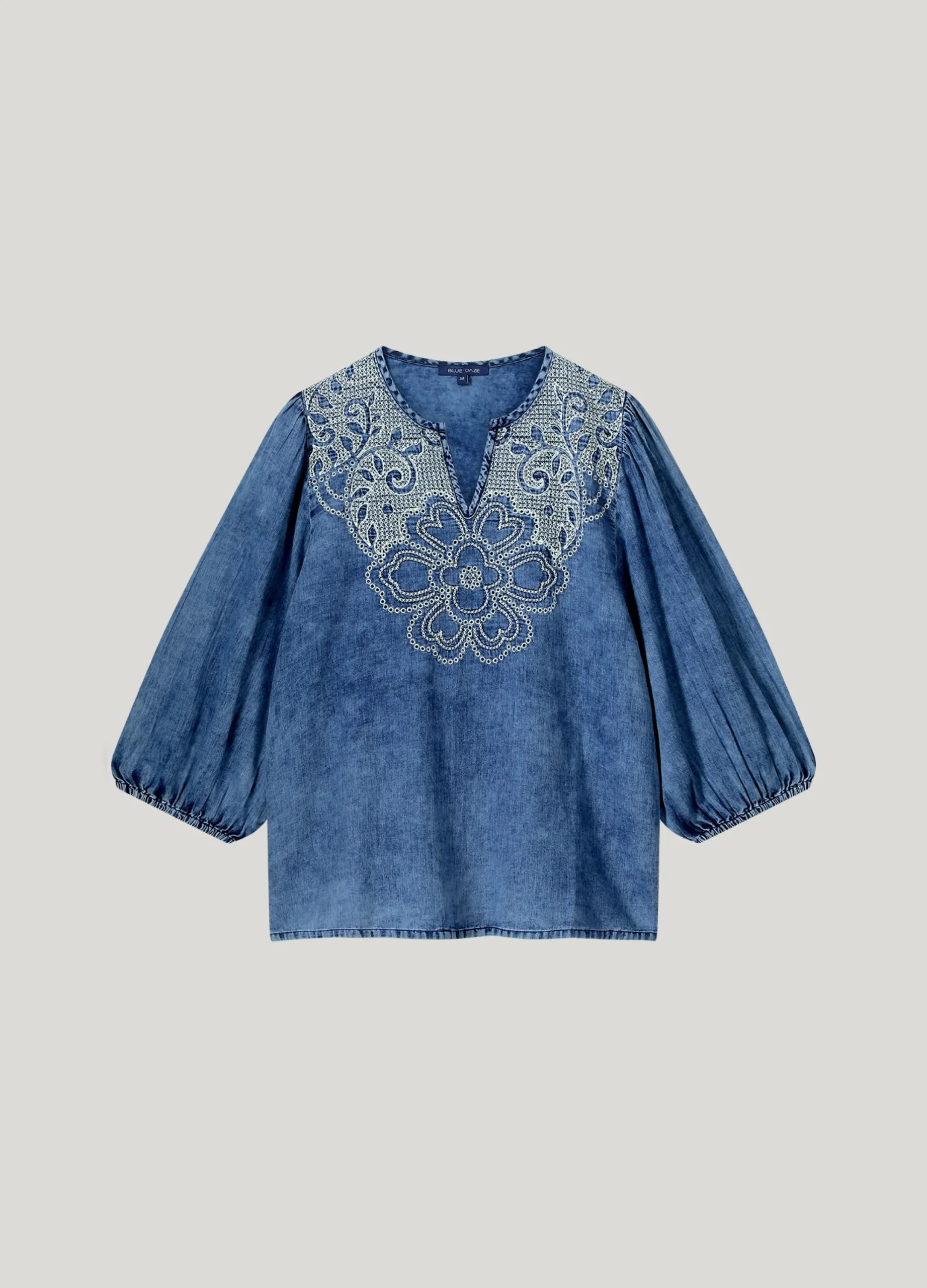 This loose-fitting top with embroidery in a stone wash denim look with puff sleeves down to the elbow. Made of a soft, supple denim for an airy fit.