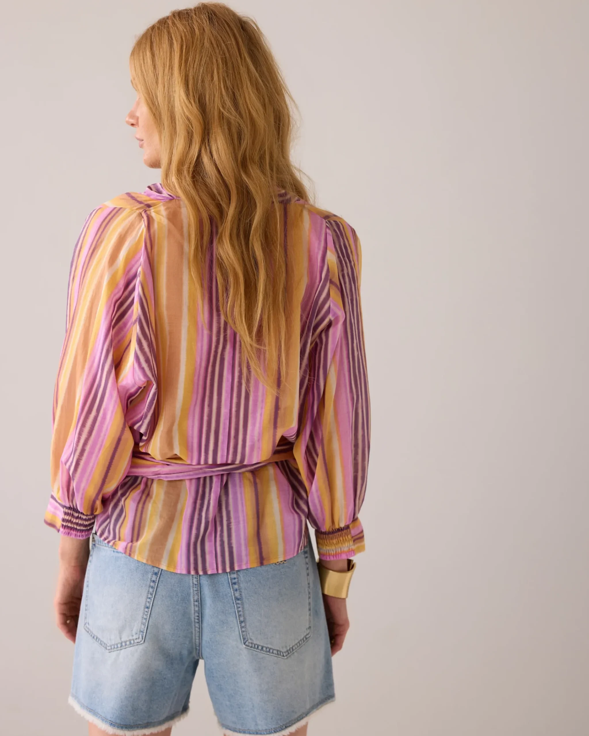 This wrap-around blouse can be worn two ways: as a classic wrap-around blouse or knotted at the front for a relaxed fit. The blouse is made of a semi-transparent cotton fabric and has partially smocked cuffs.