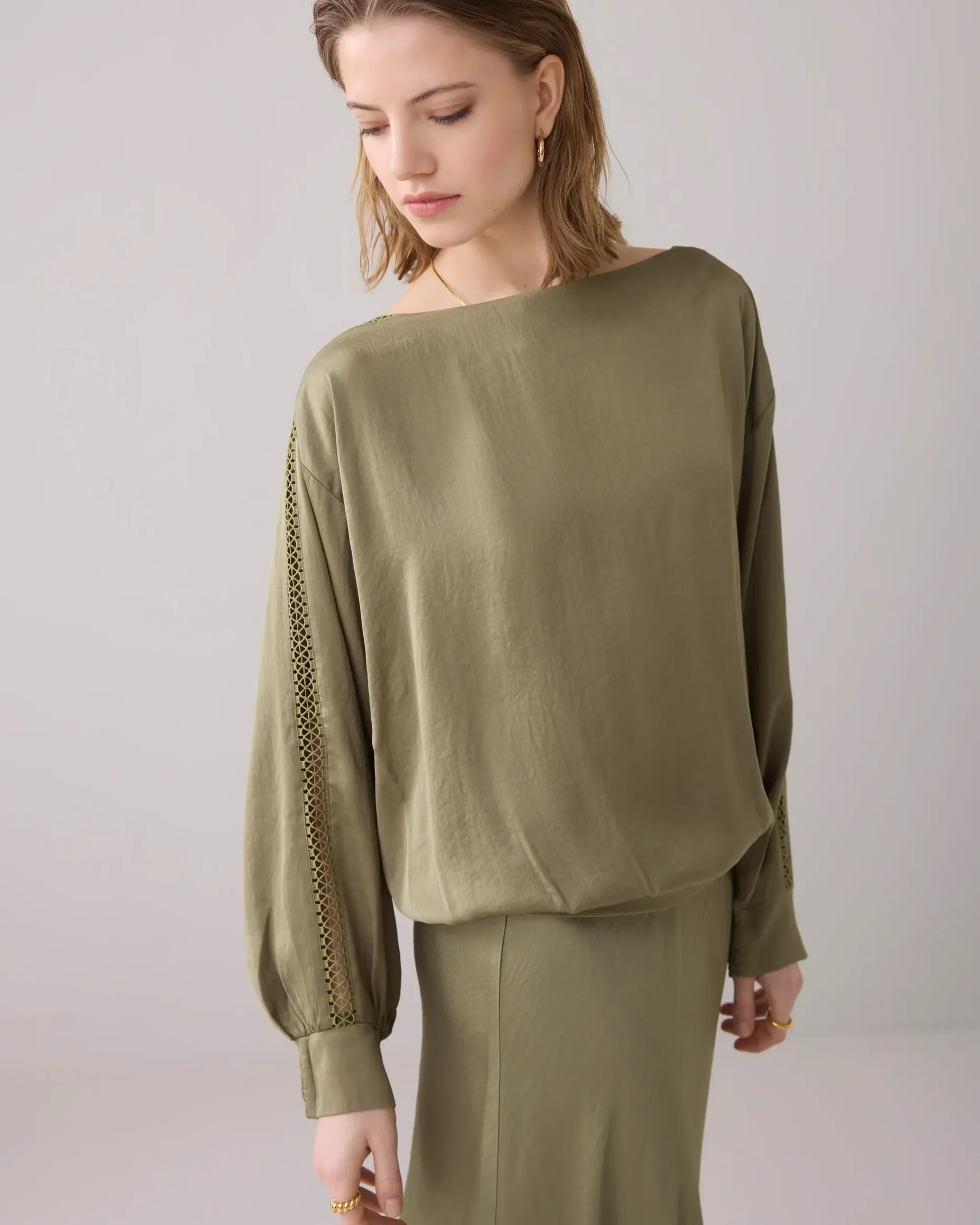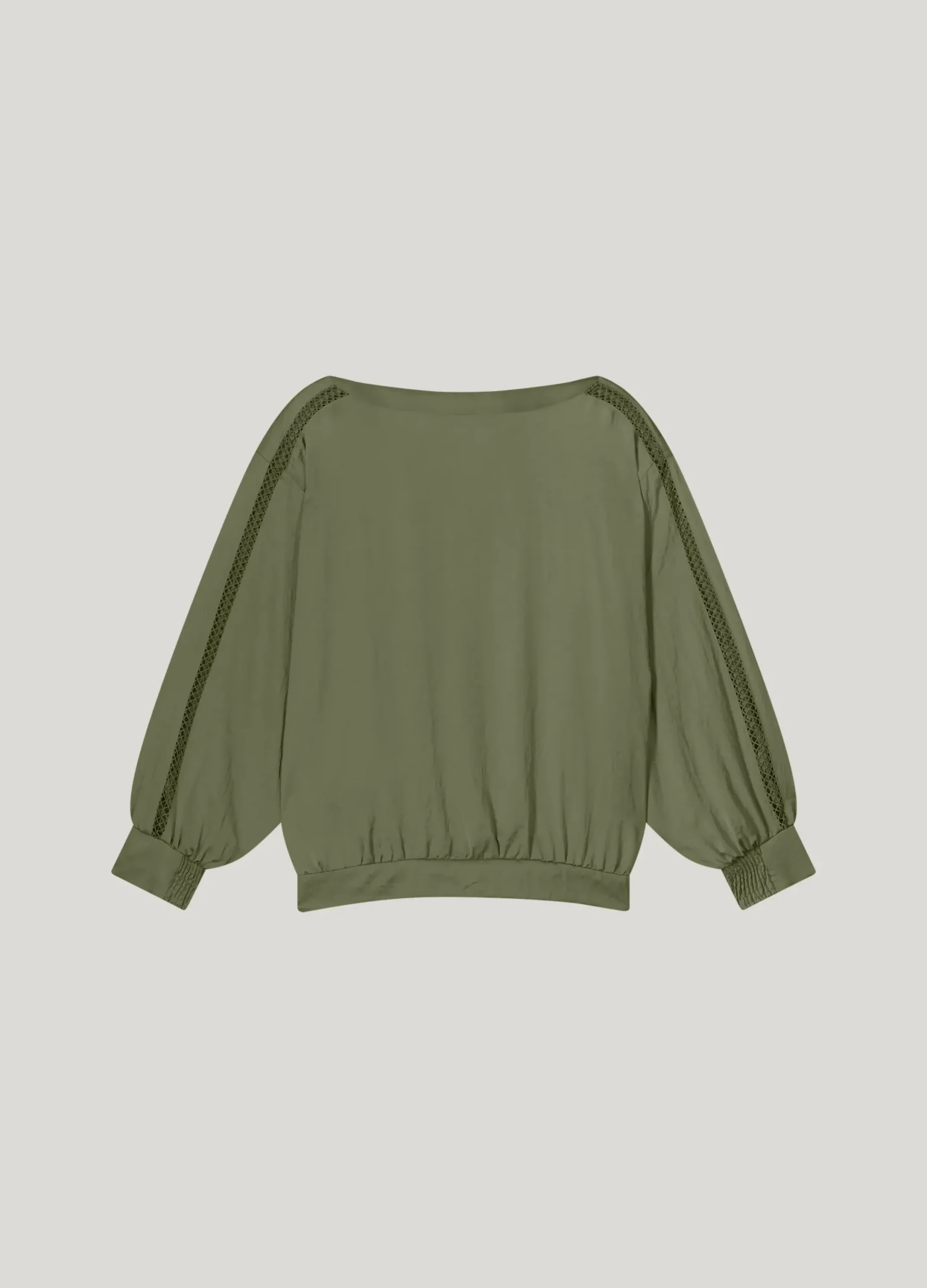 This top has batwing sleeves with an openwork lace trim. The cuffs of the sleeves and at the bottom are partially smocked.