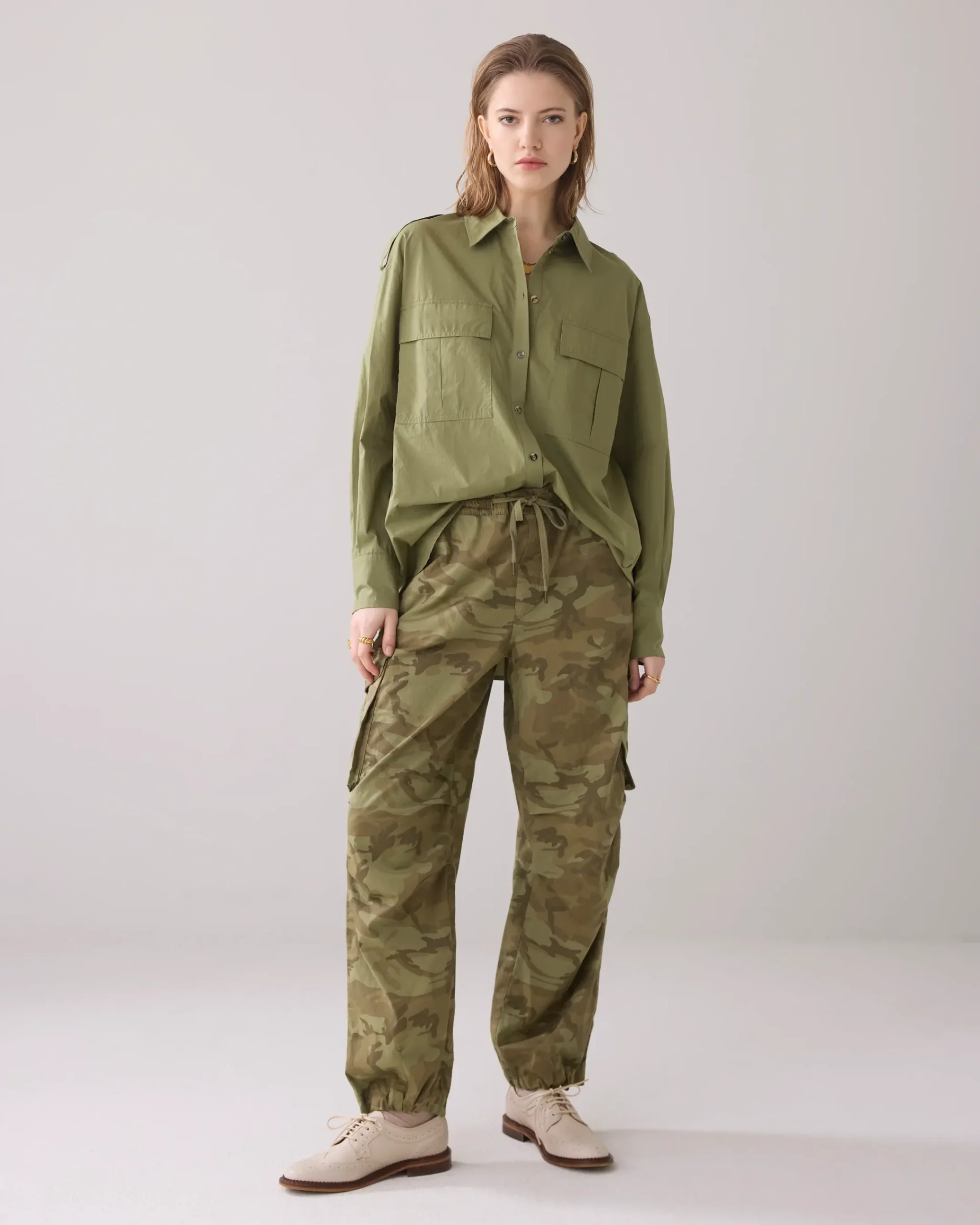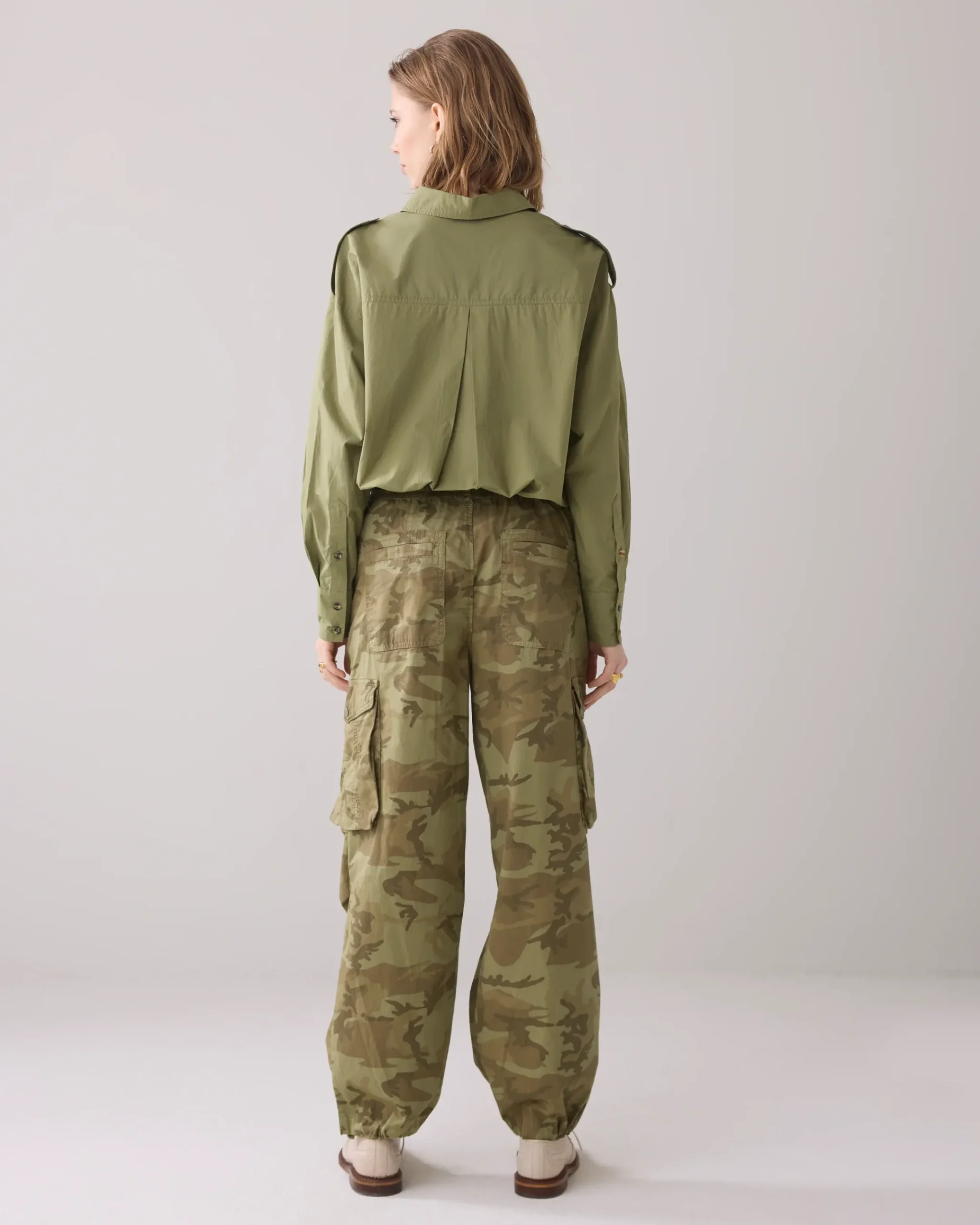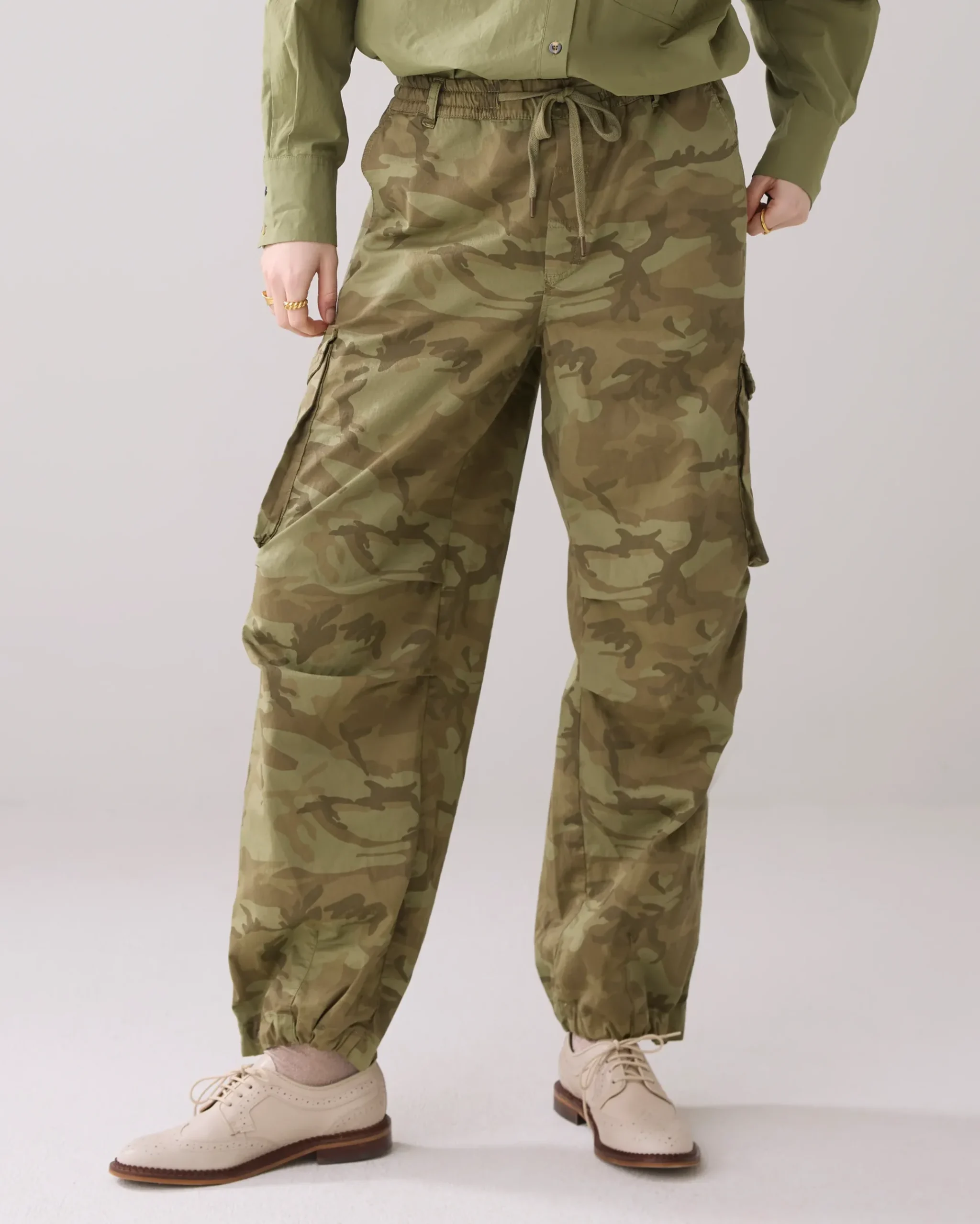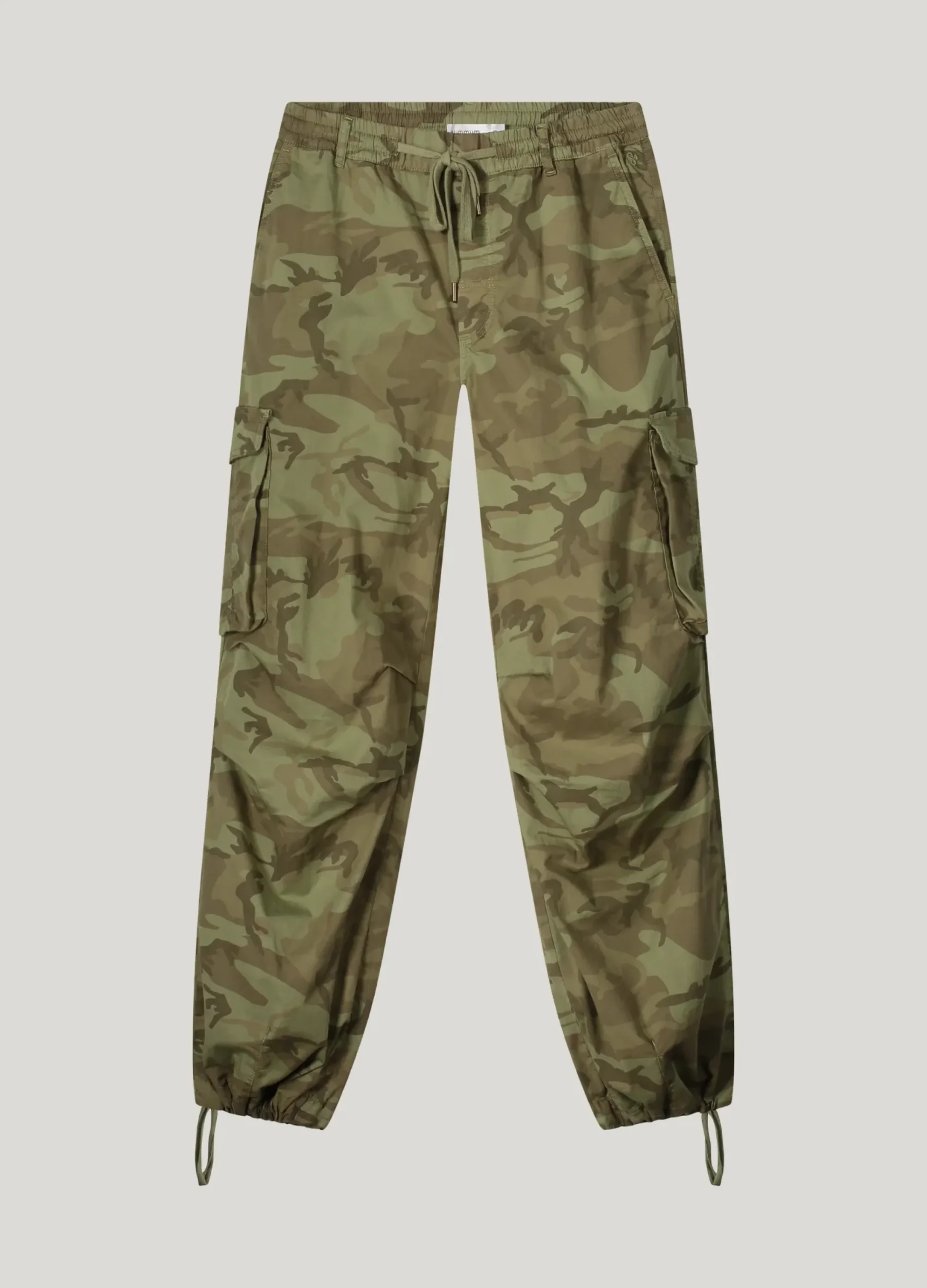 These loose-fitting trousers are made of crispy cotton with a camouflage print. The legs can be worn both straight and tapered by the adjustable drawstring at the hem.