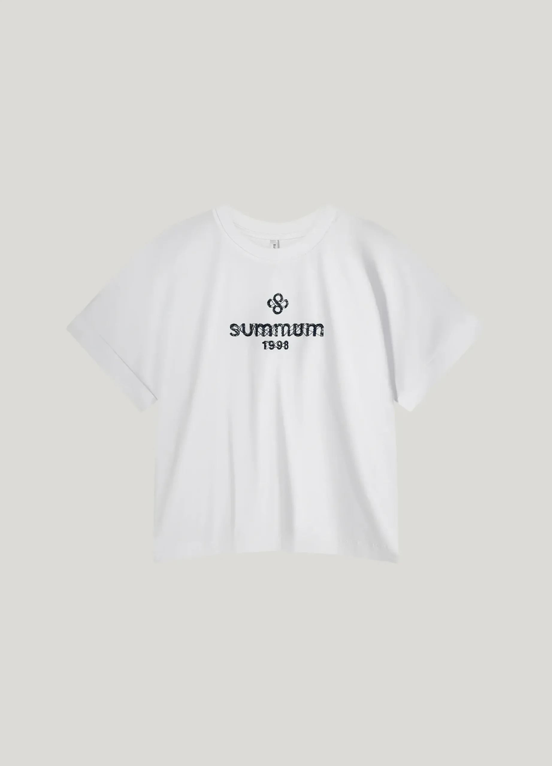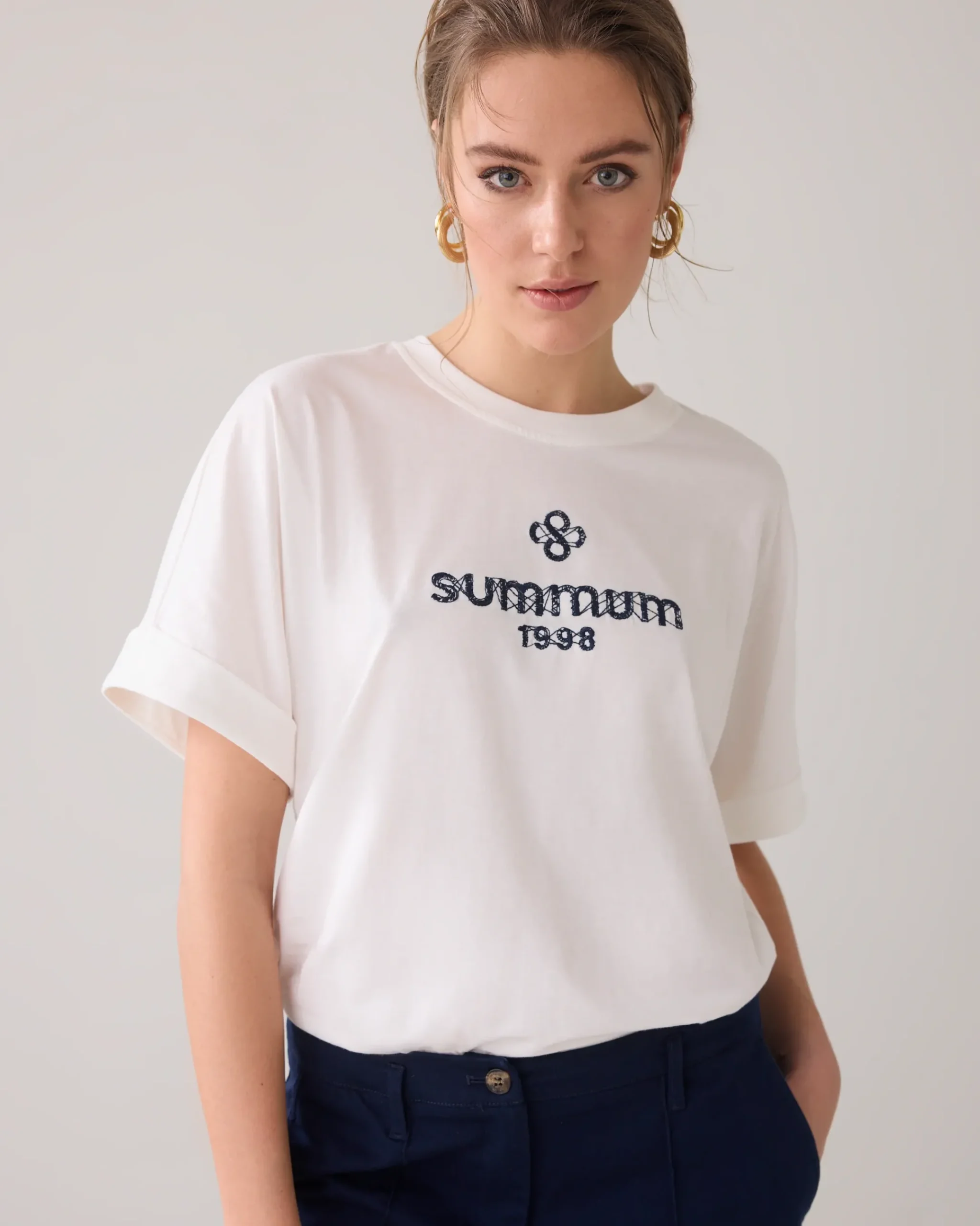 Boxy T-shirt in soft cotton jersey and with cropped sleeves featuring a fixed turn-up. The T-shirt has an embroidered logo on the front.