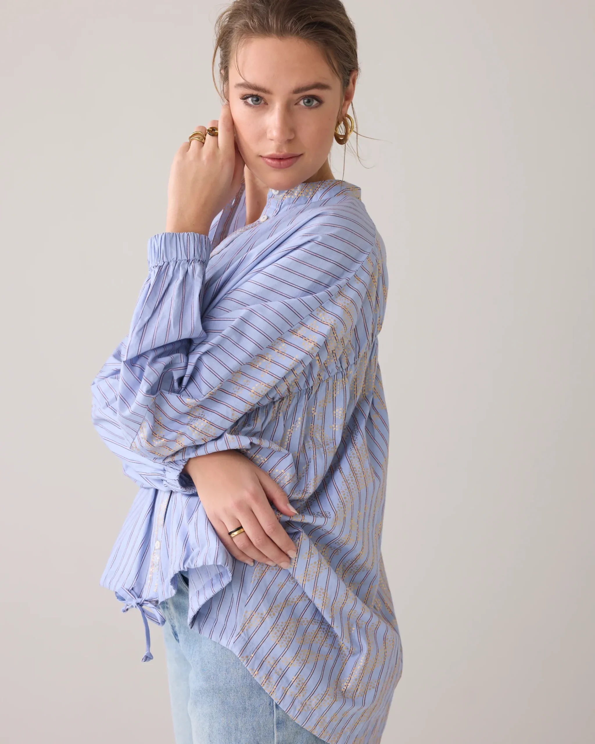 This oversized stripe blouse has long balloon sleeves with elasticated cuffs. The neckline and button placket is printed with a metallic pattern and there is a drawstring at the hem.