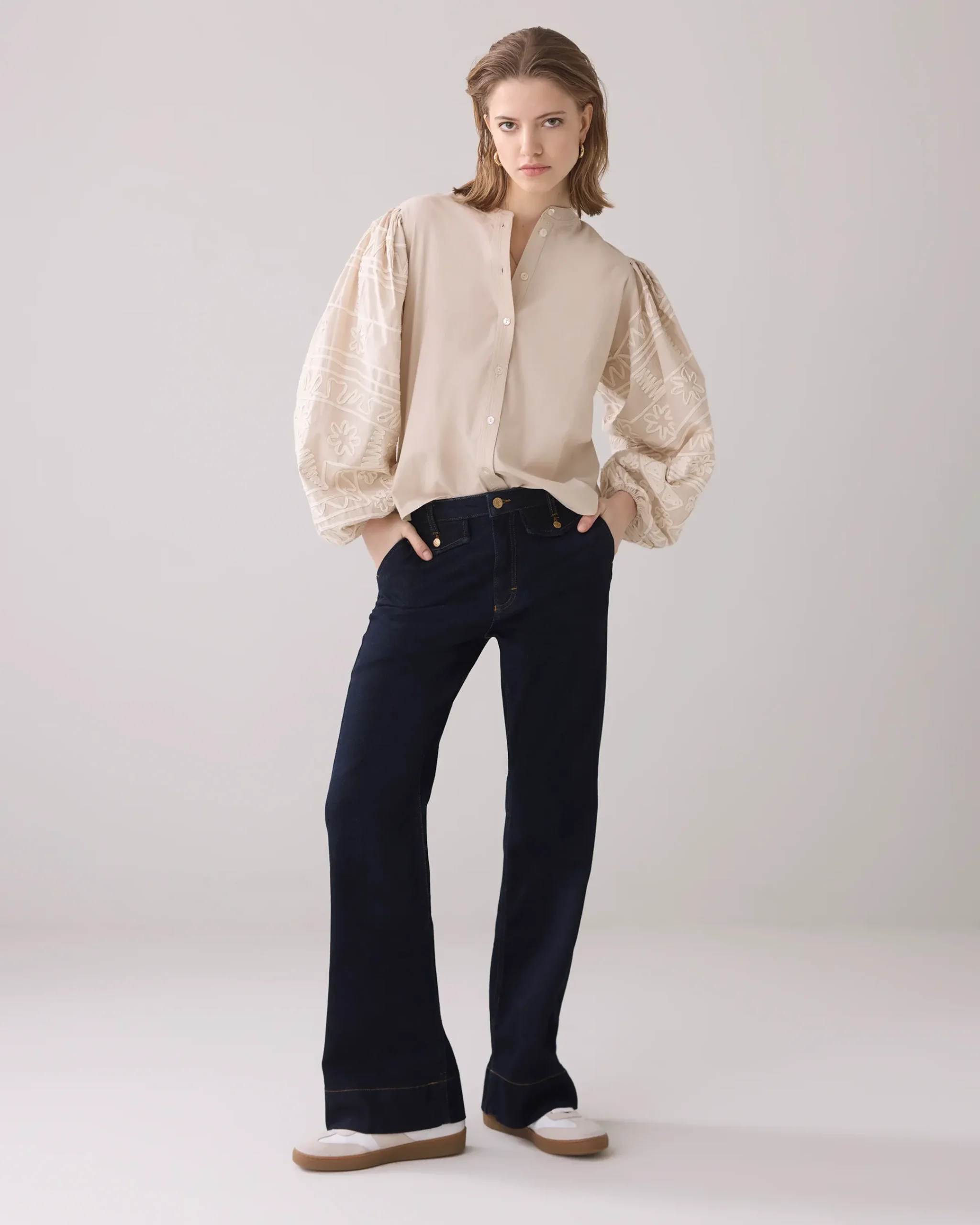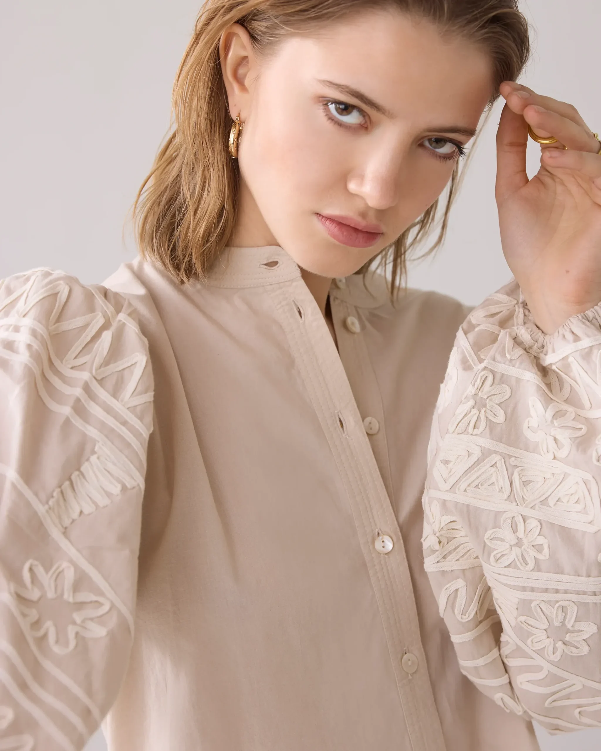 This blouse has balloon sleeves with rich embroidery and elastic at the bottom. The blouse has a round neckline and button fastening with small shell buttons.
