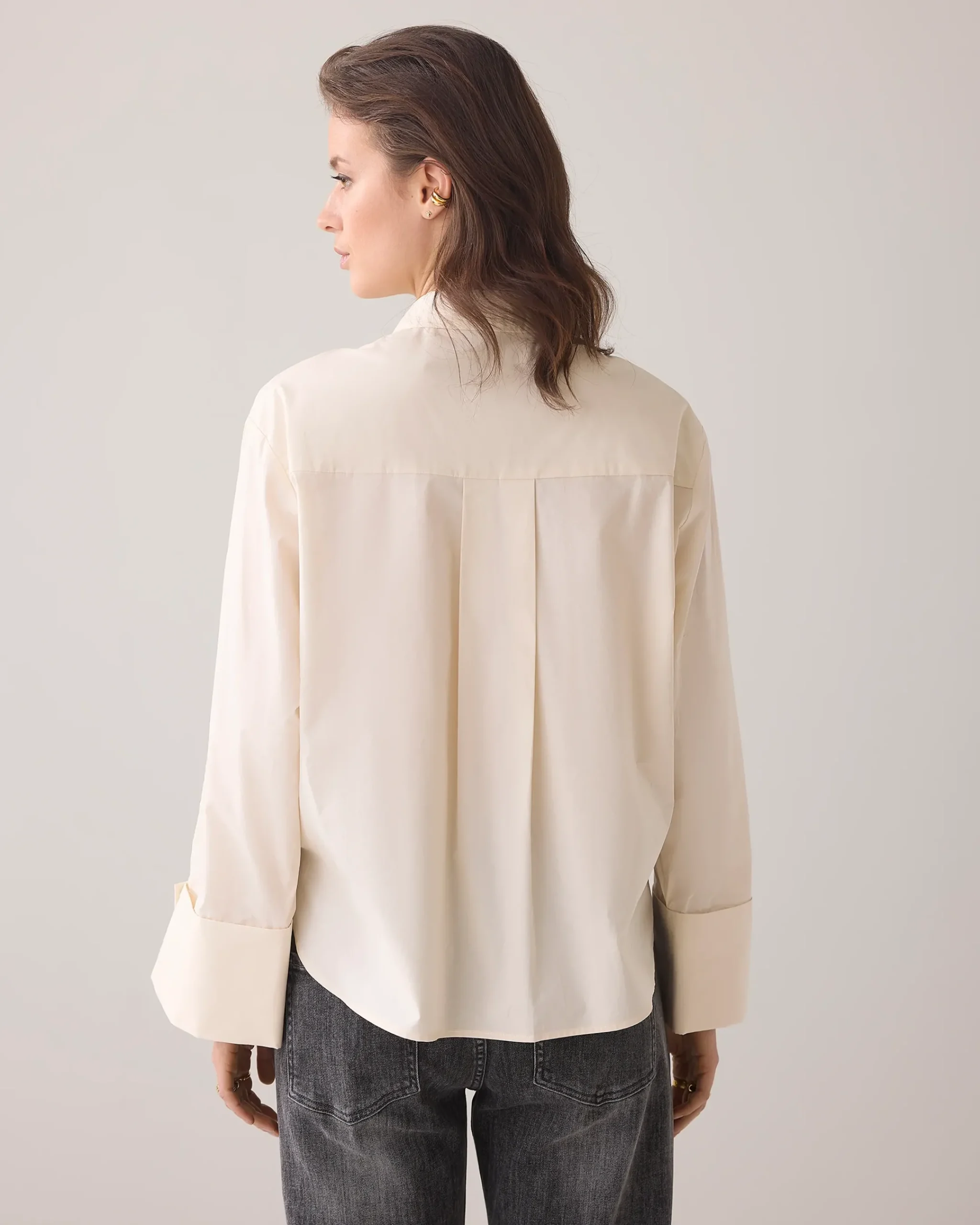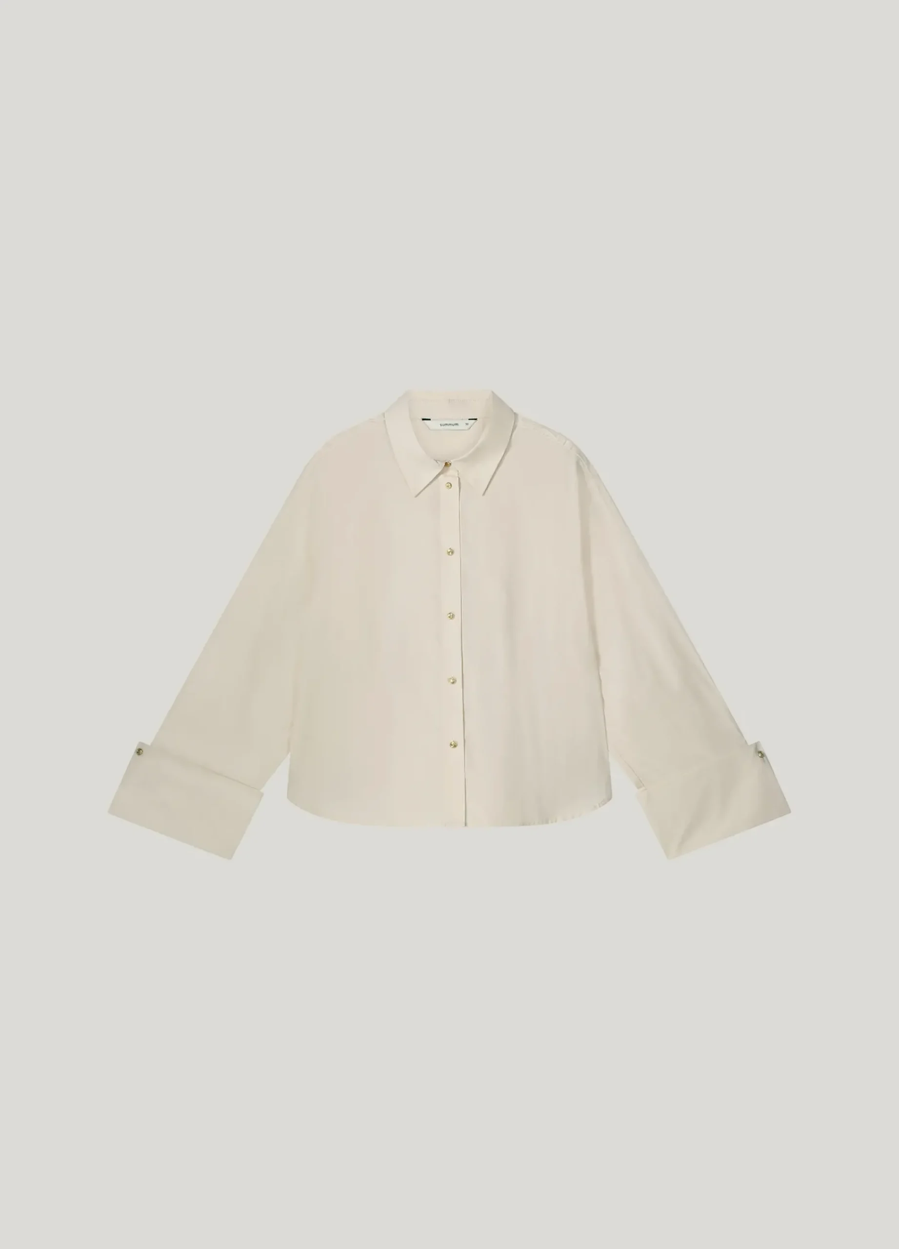 This blouse has a boxy cut with long sleeves and a rounded bottom. The wide cuffs are finished with small gold buttons. The cotton material provides comfort and a fresh look.