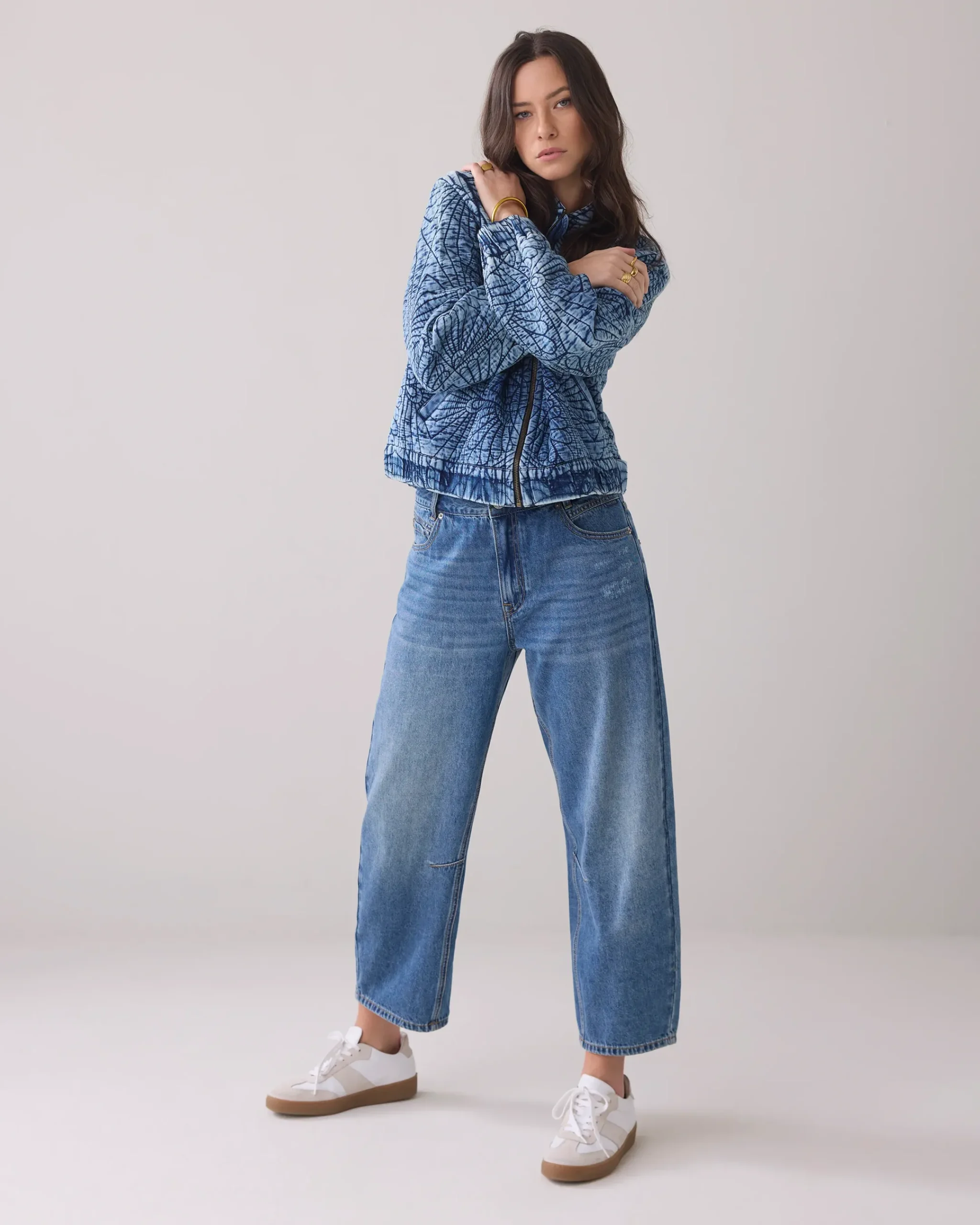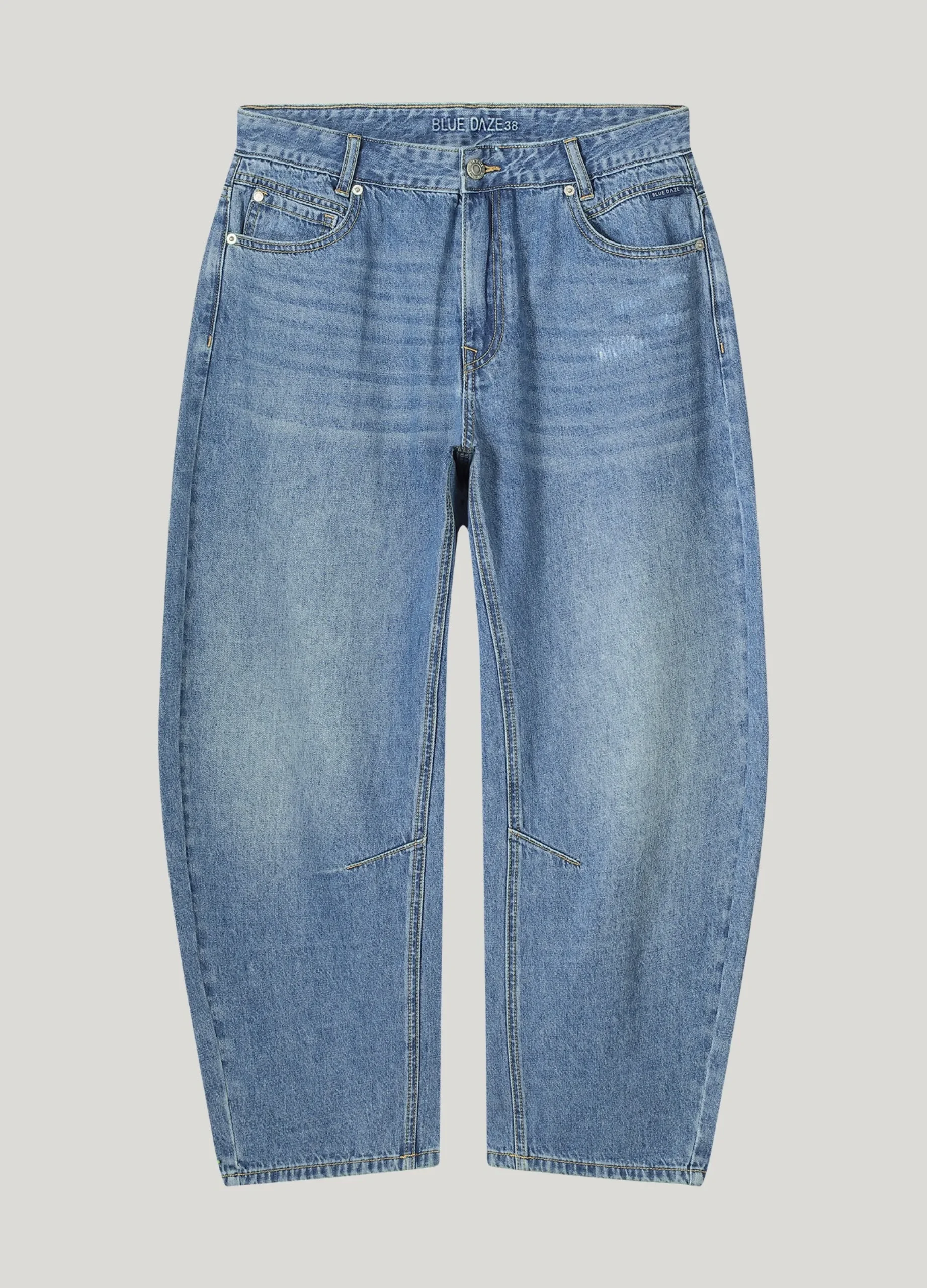 These jeans come in a stone wash. They have a relaxed fit at the hips and a cocoon-shaped leg at the ankle.