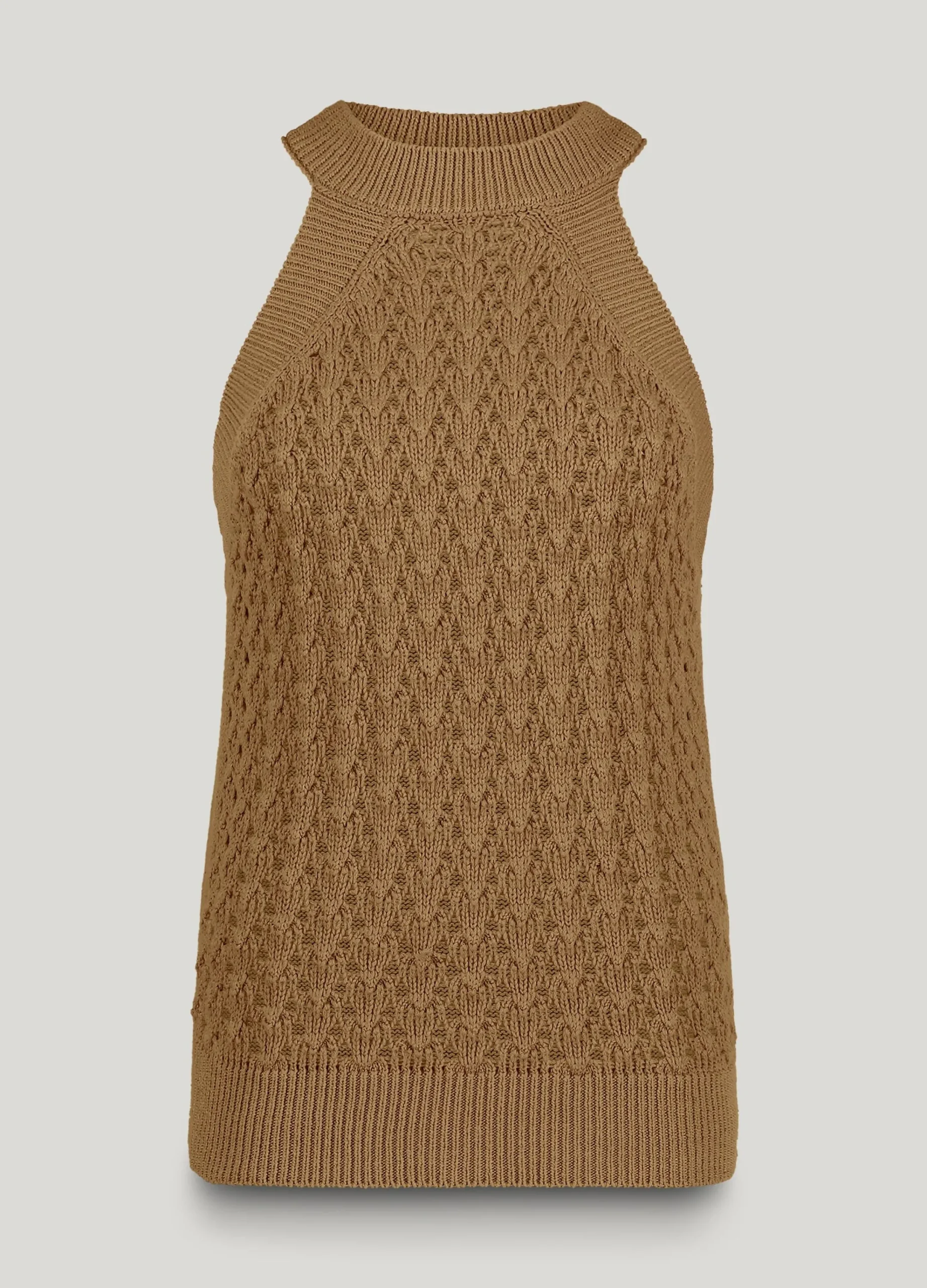 Made of 100% luxurious Italian firm cotton yarn, this halter top features a unique ajour knit pattern on the front. The top has a slim fit.