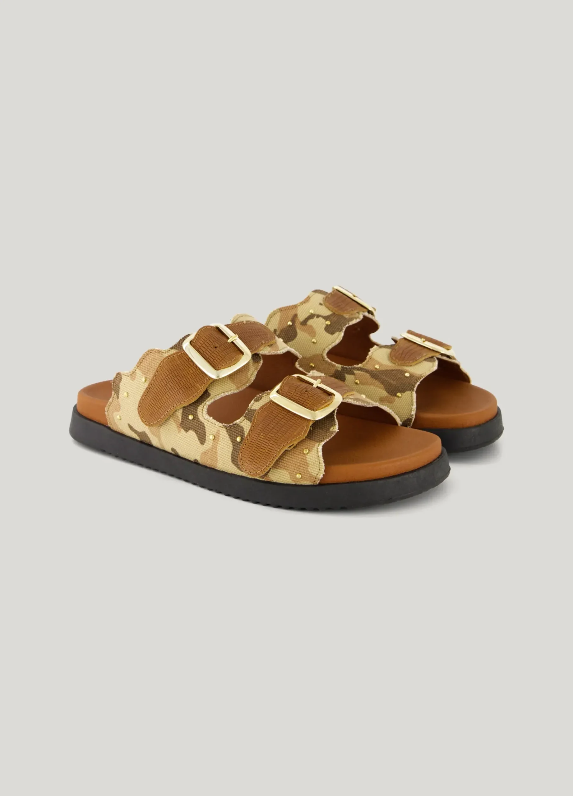 These sandals have a canvas camouflage print with a reptile texture and leather details. The sandals are finished with gold-tone studs and rippled edges.