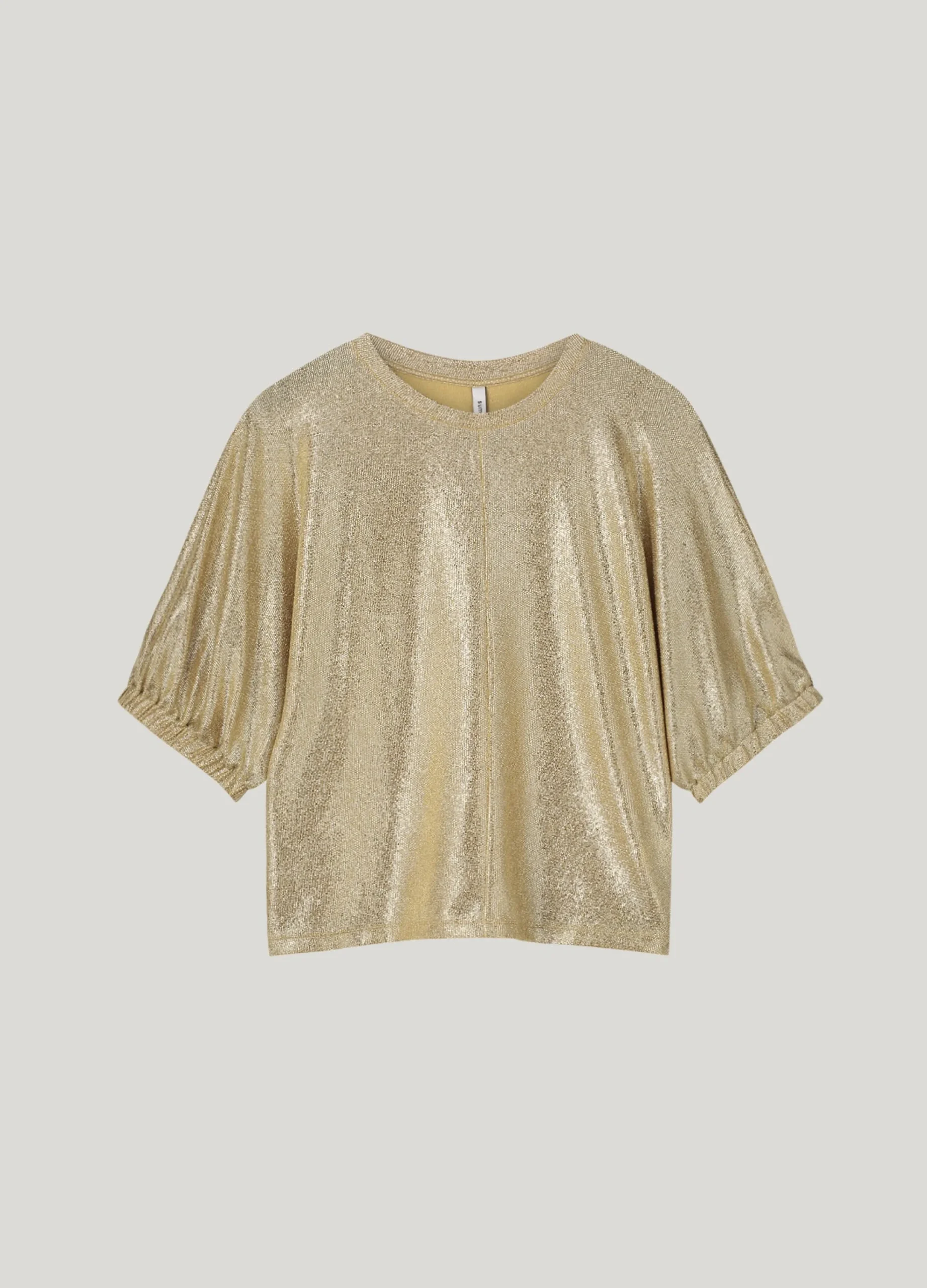 This top is made of a supple glittery fabric with a metallic finish and a soft interior. The cropped sleeves fall at the elbow and the top falls smoothly along the body for a comfortable fit.