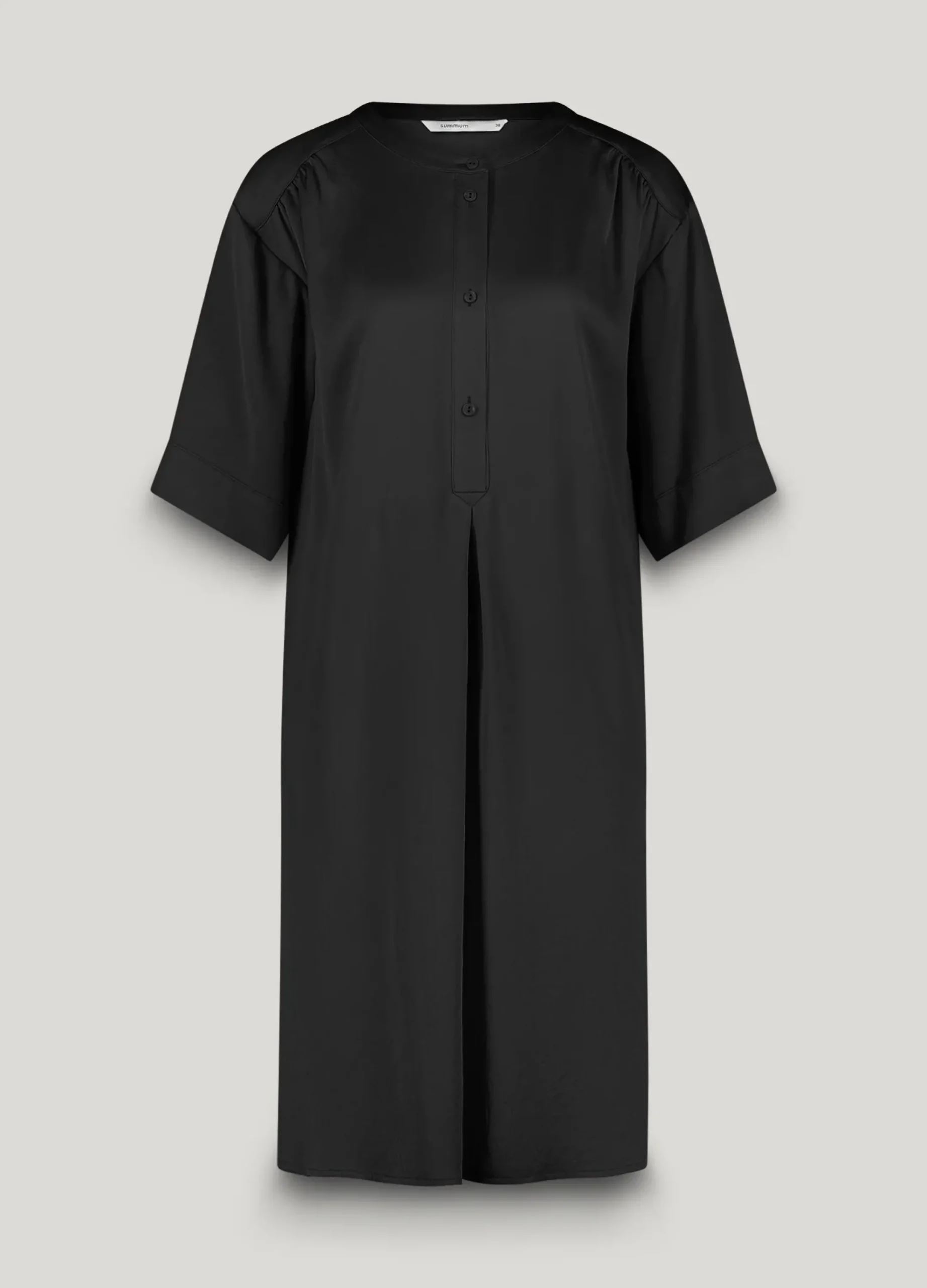 This tunic dress has a stand-up collar and a button fastening halfway down the front. The dress has a rounded hem and slit sleeves.