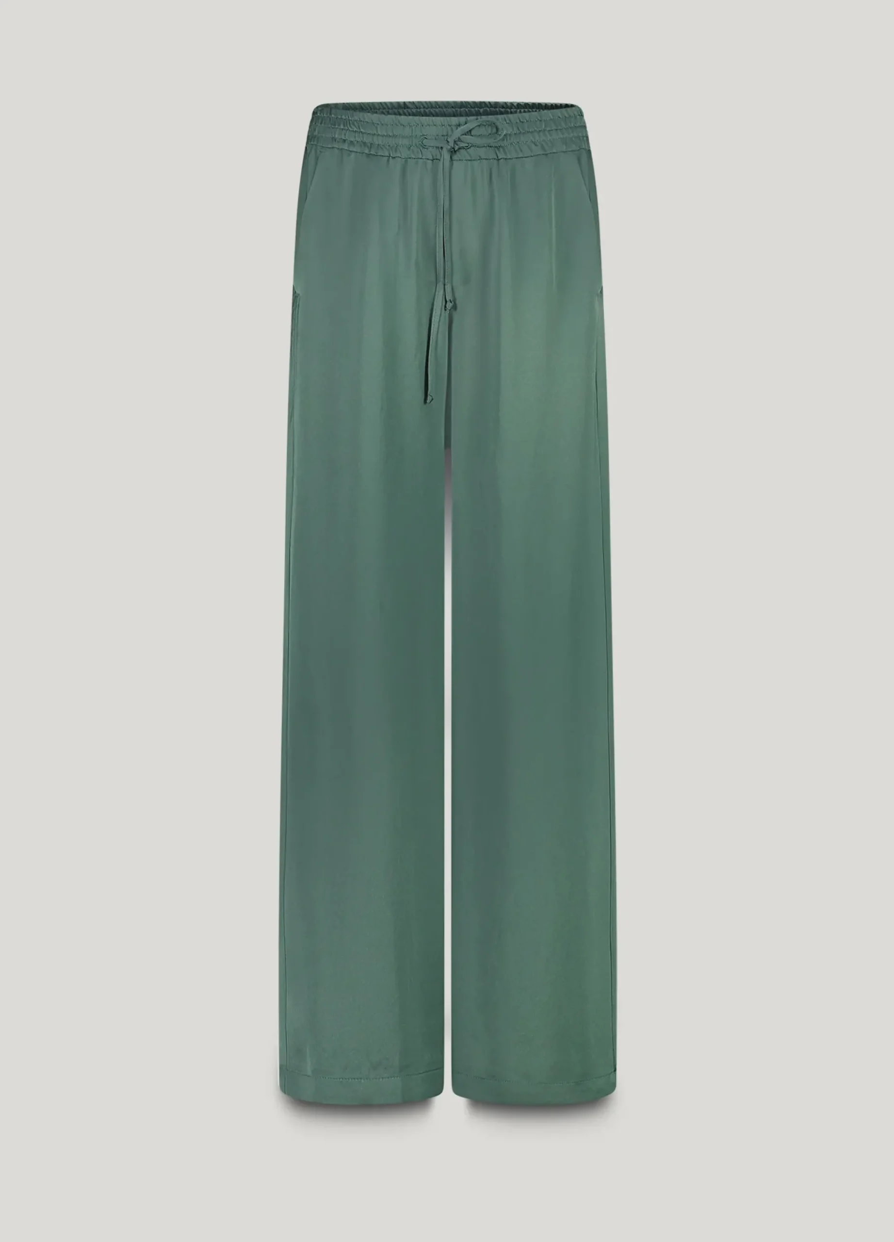 Deze lange broek is gemaakt van een glanzende stof en heeft een relaxte fit. De broek heeft een elastische tailleband met stoffen koordsluiting en fake paspelzakken achter.