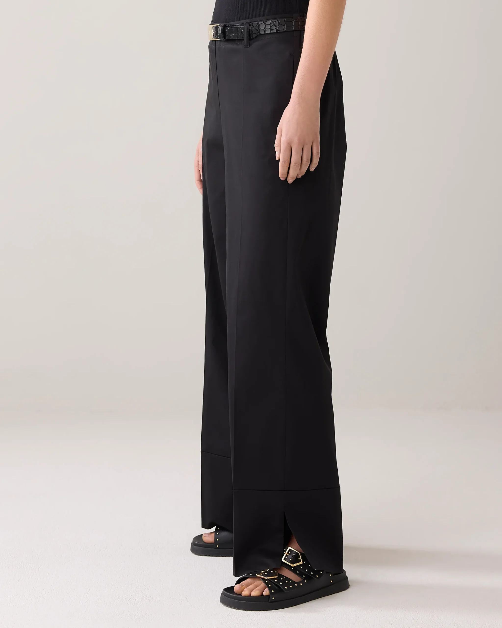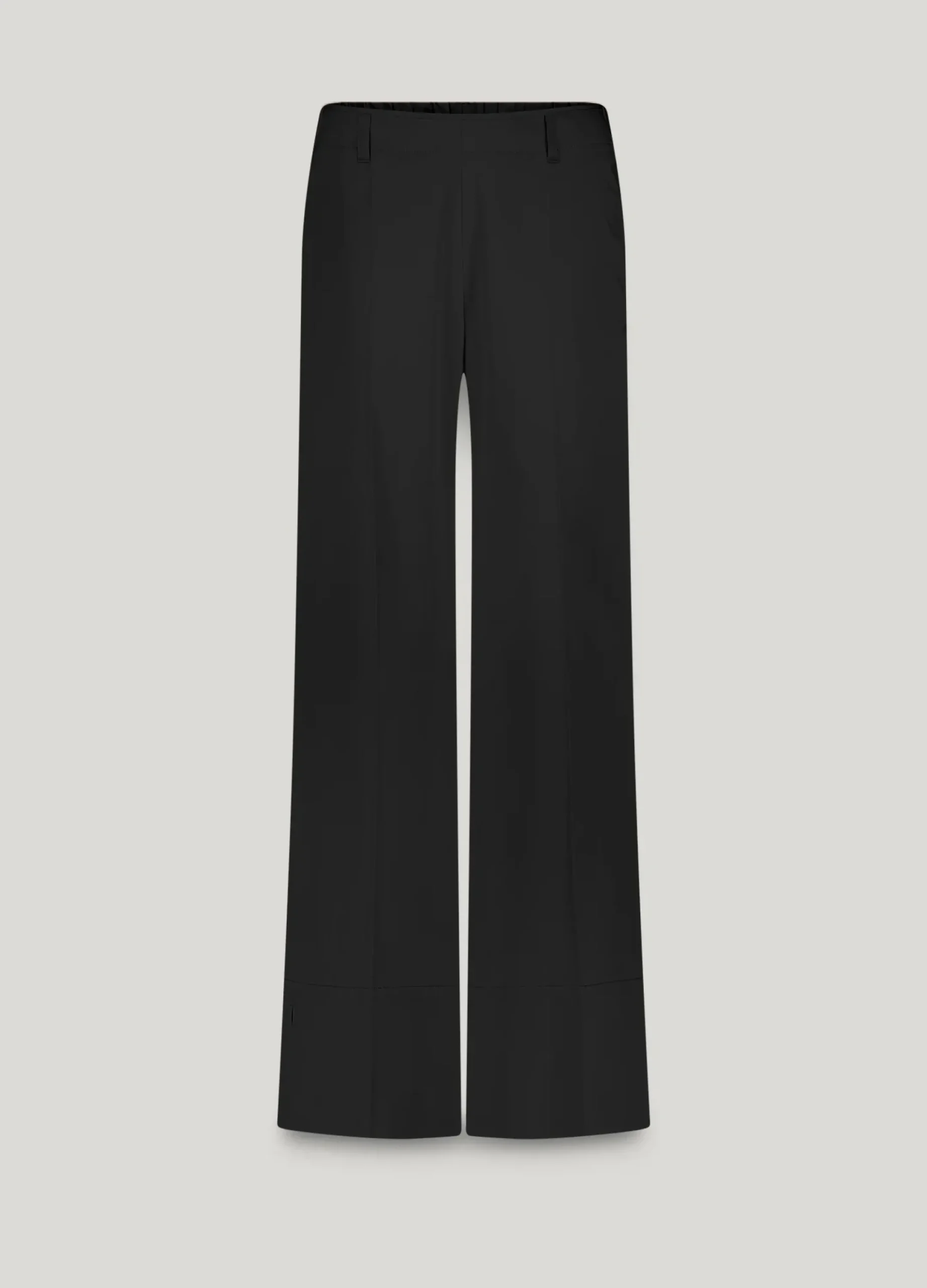 These straight-leg trousers have a straight fit with a wide hem and side slits. The trousers have an elasticated waistband at the back and smooth waistband at the front.