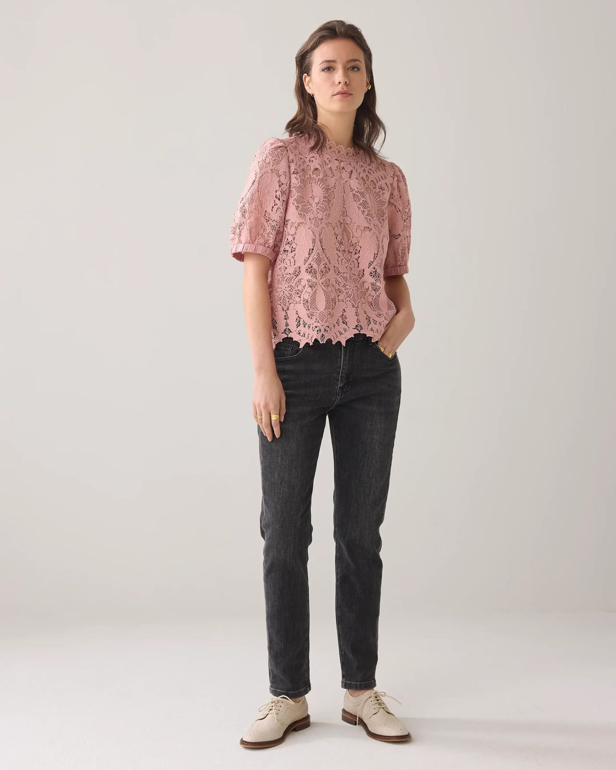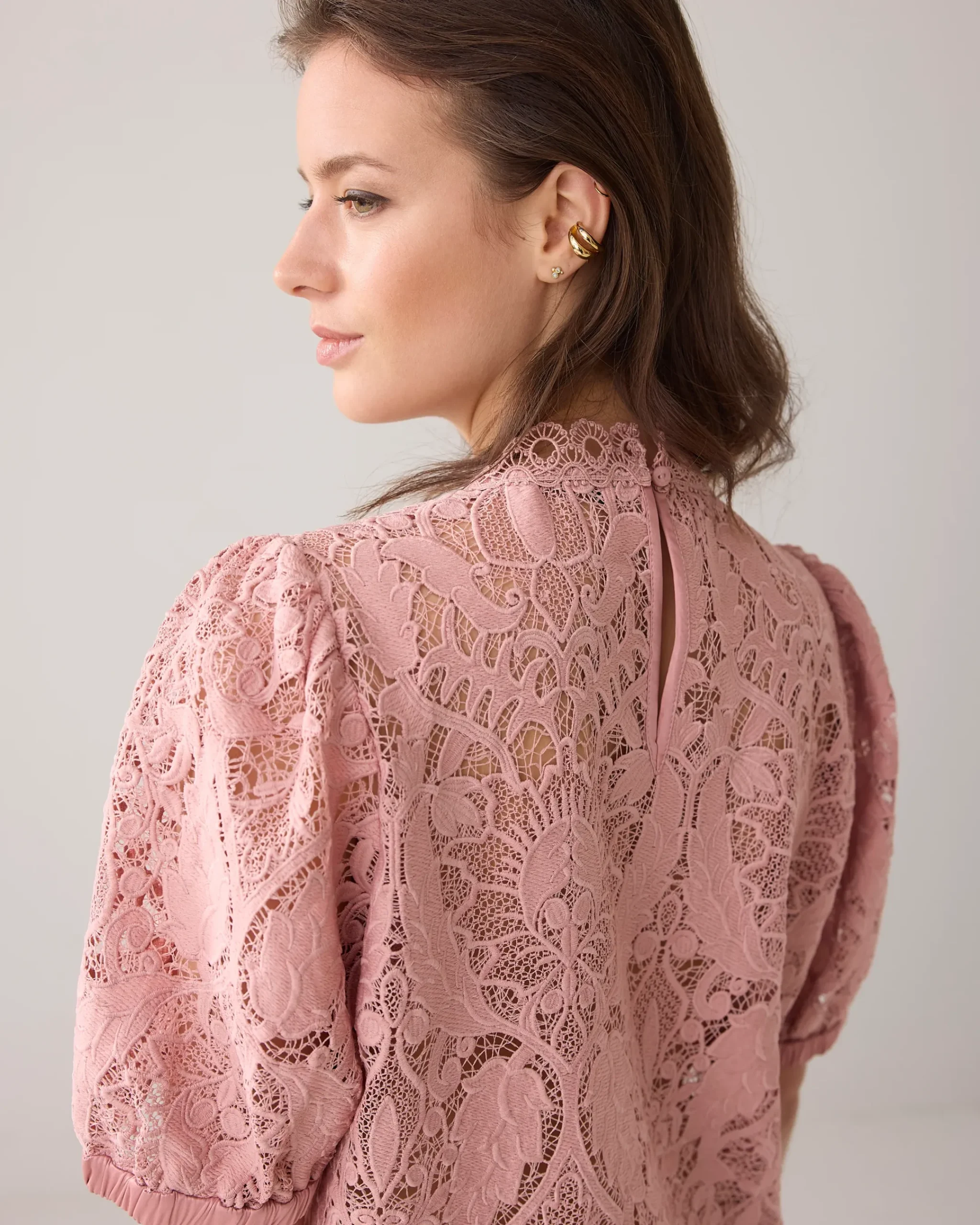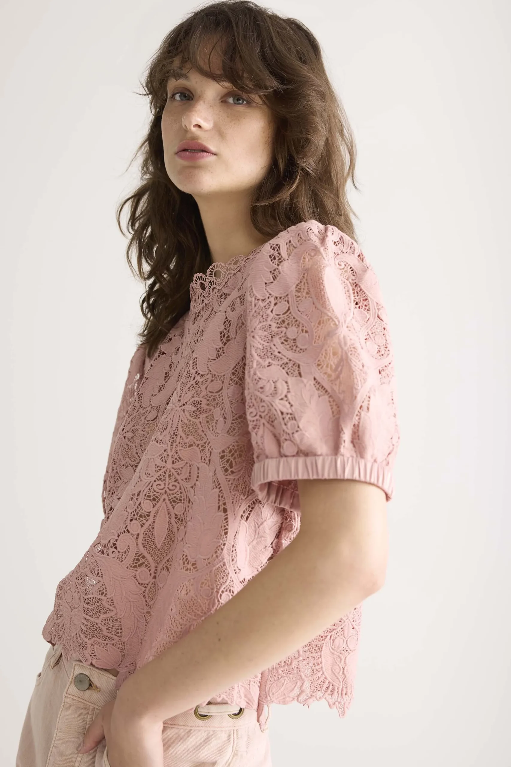 This top is made of transparent lace and has a scalloped finish at the neckline and bottom. The top has short puff sleeves and a round neckline with a zip fastening at the back.