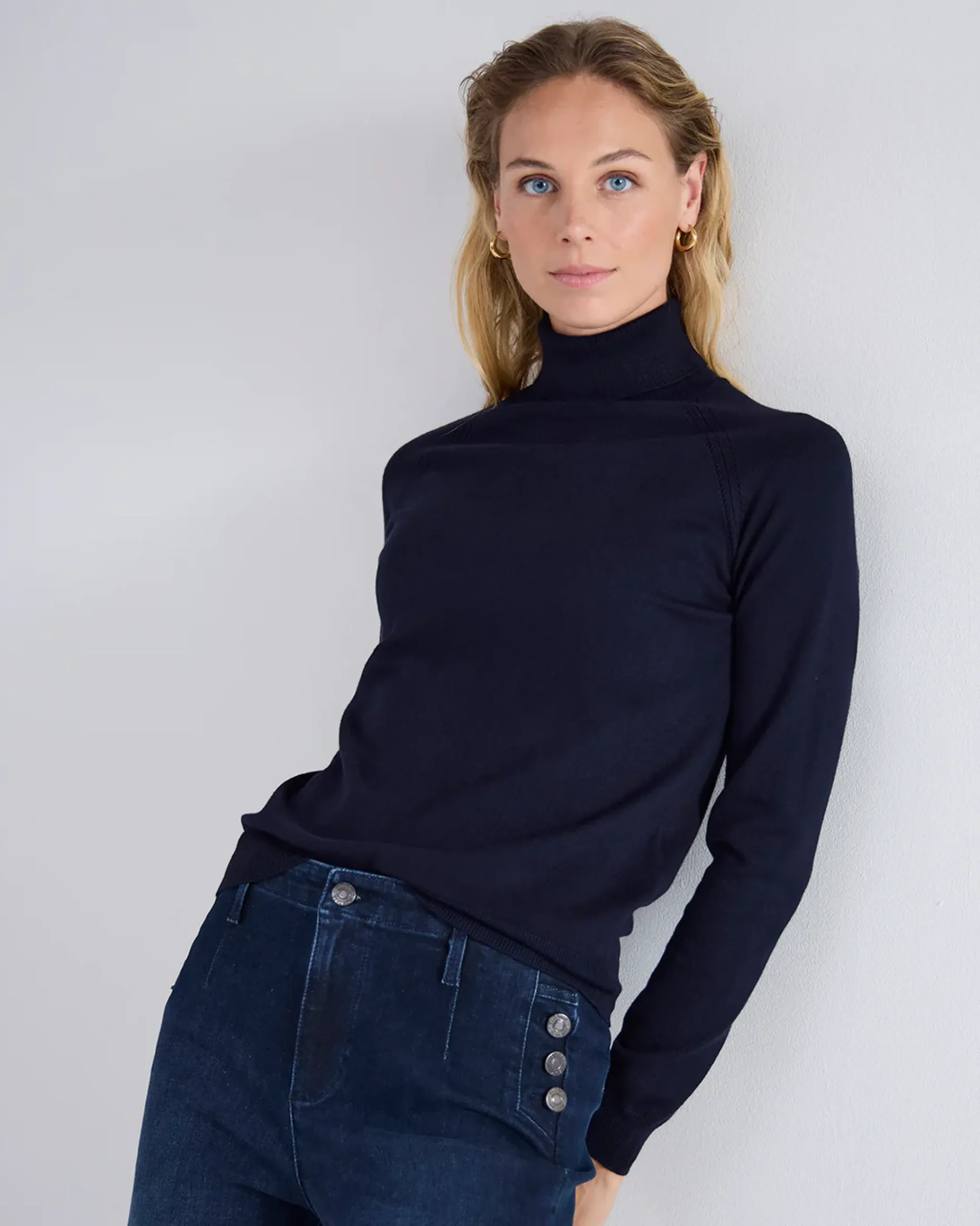 A slim fit polo neck jumper made from soft fabric with long raglan sleeves.