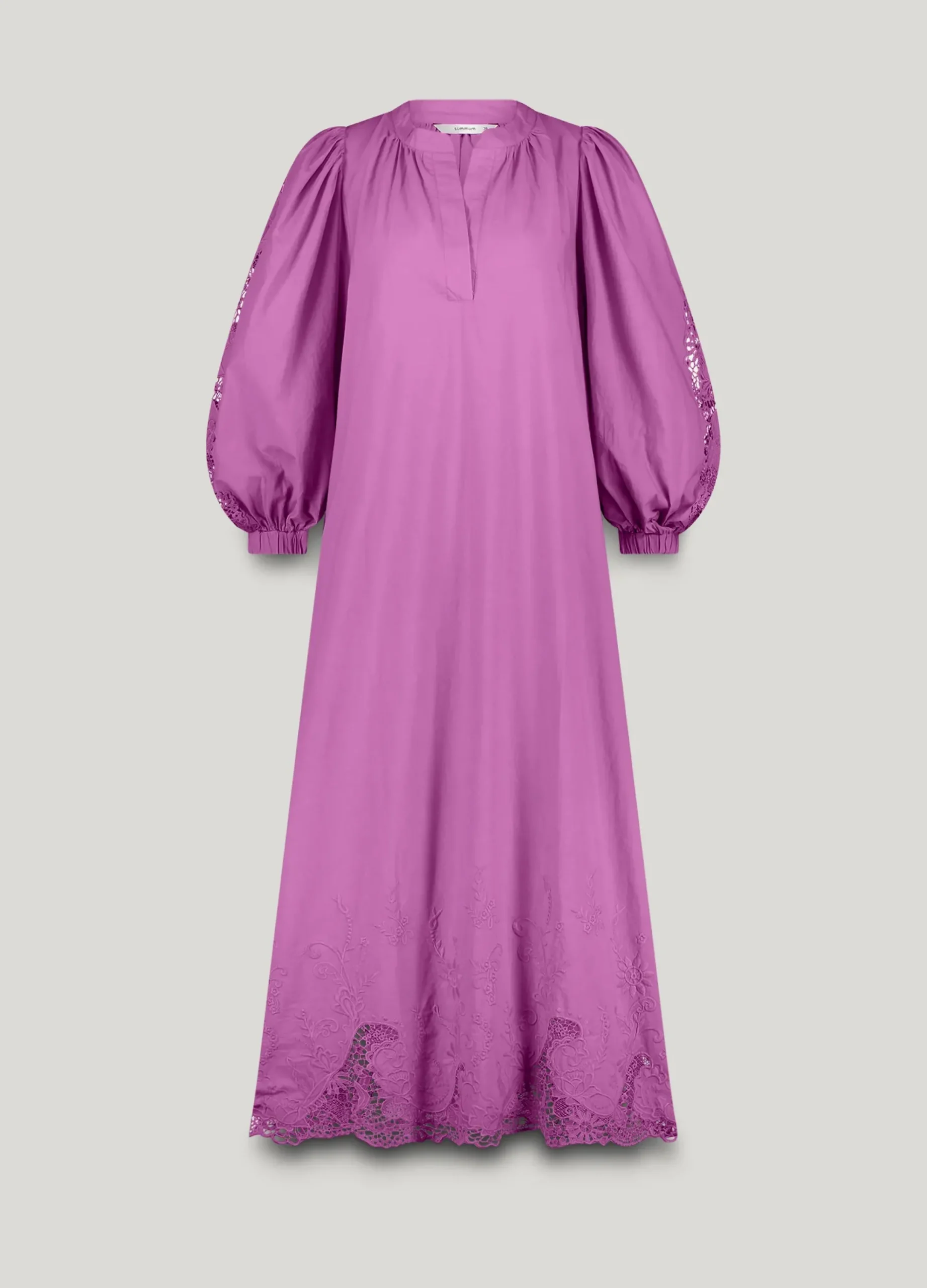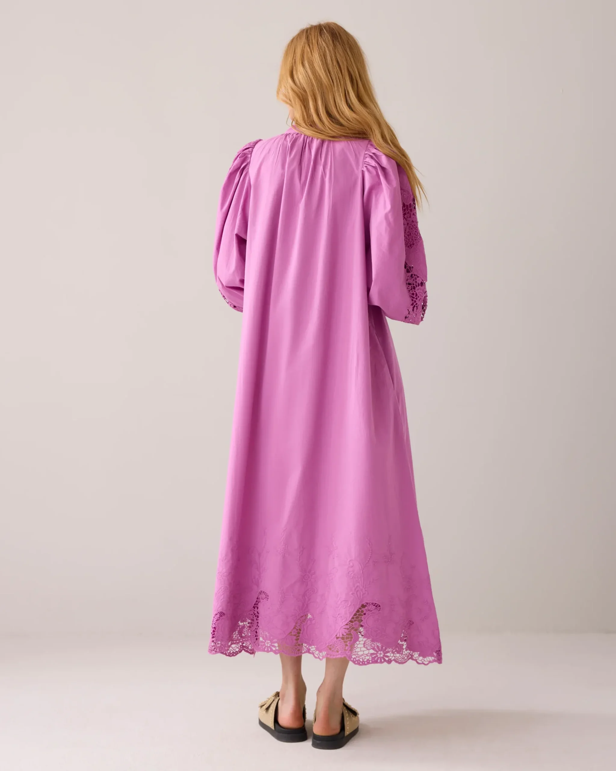 This ankle-length dress has a roomy fit and is made of airy cotton with lace and embroidery on the sleeves and at the bottom. The large puff sleeves and openwork details give this dress a feminine look and feel.
