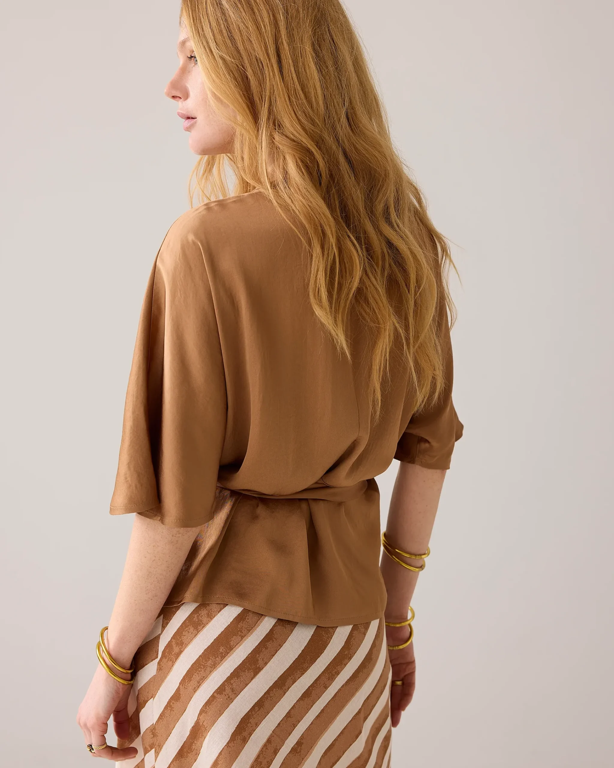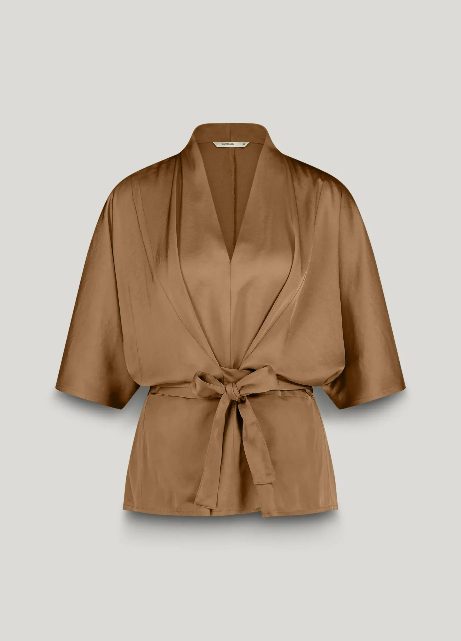 This flowy top has a fixed, wide belt. A bow fastening at the front creates a pleated detail that accentuates both your silhouette and the feminine V-neckline.