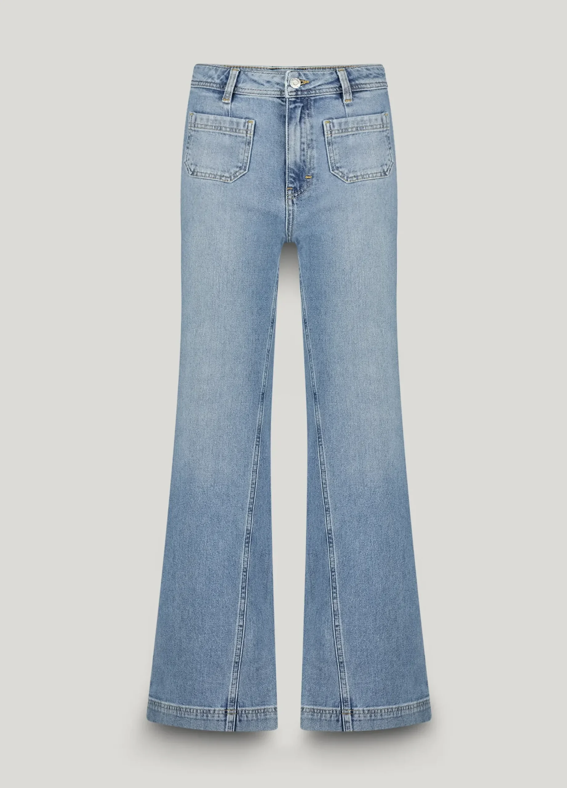 These high-waisted jeans have a fitted cut over the hips and flared legs. The jeans have a light vintage wash and are made of comfort stretch denim.