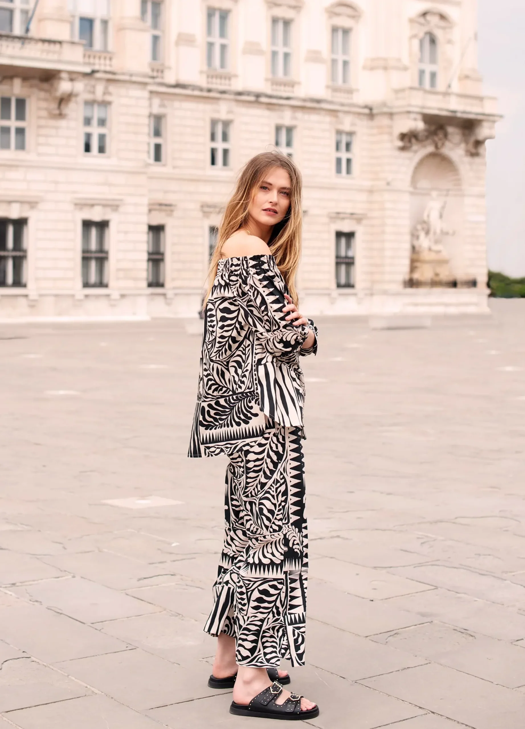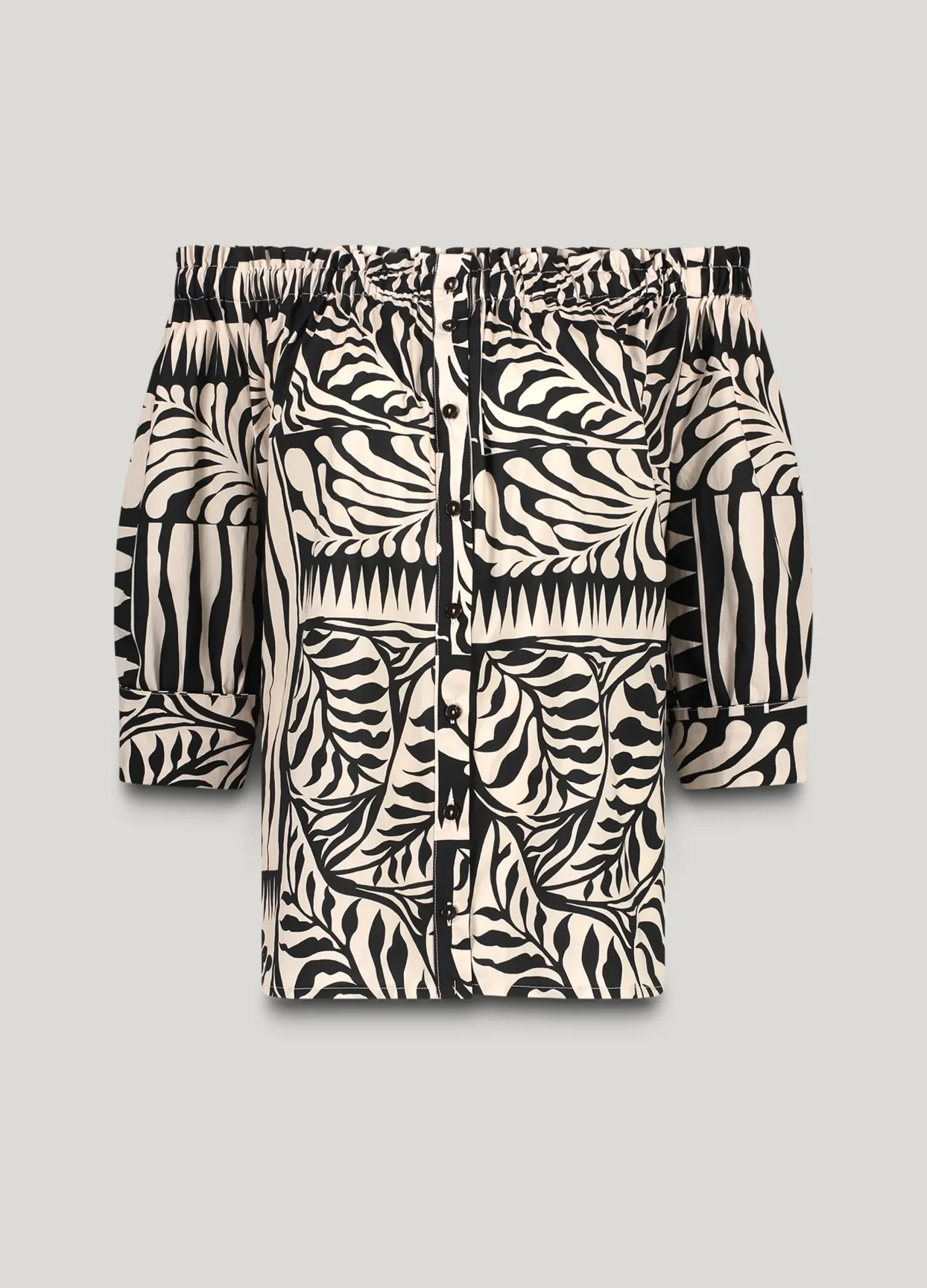 This versatile blouse can be worn off the shoulder or with a wide neckline. The blouse has a button-down fastening, wide cuffs and three-quarter sleeves.