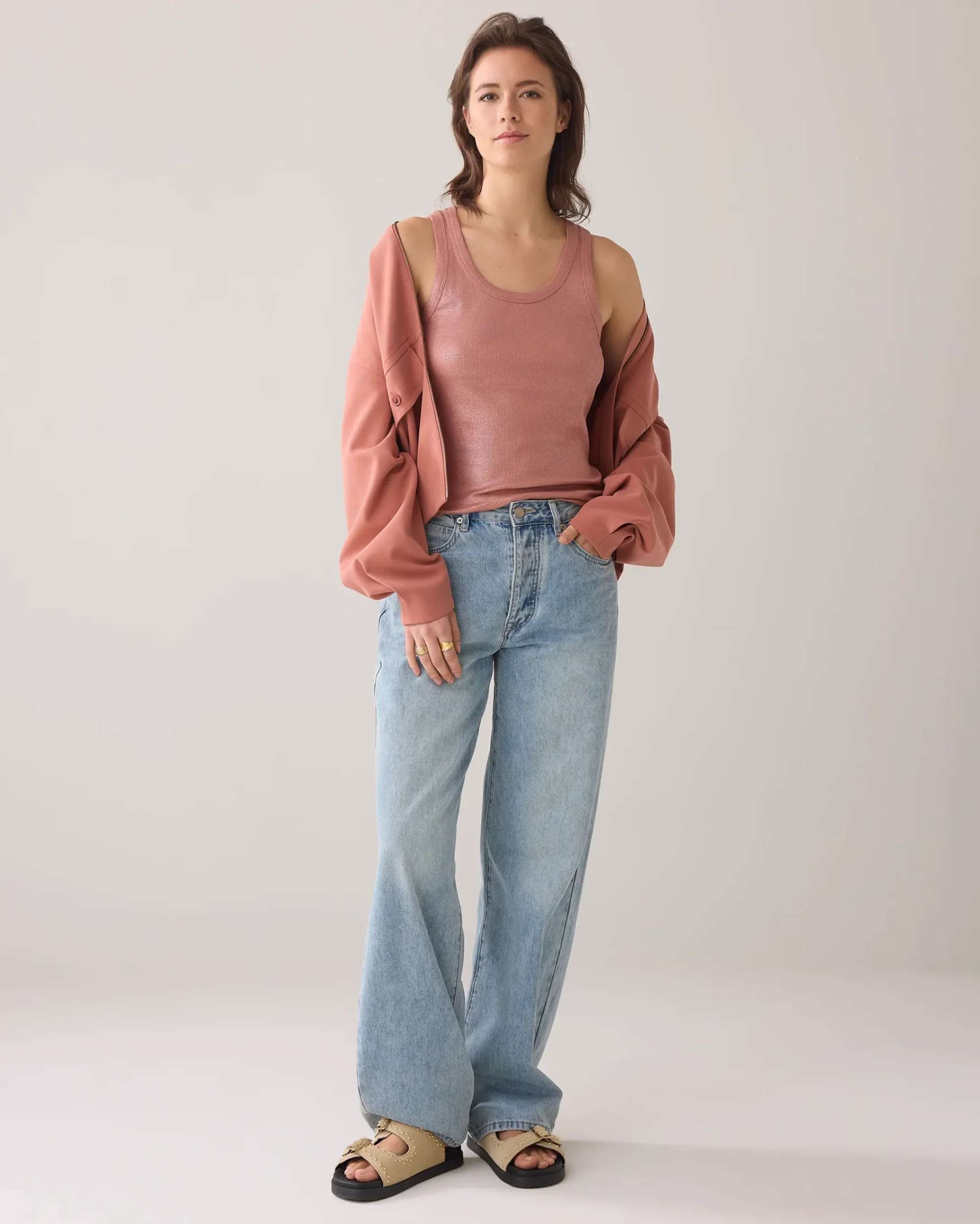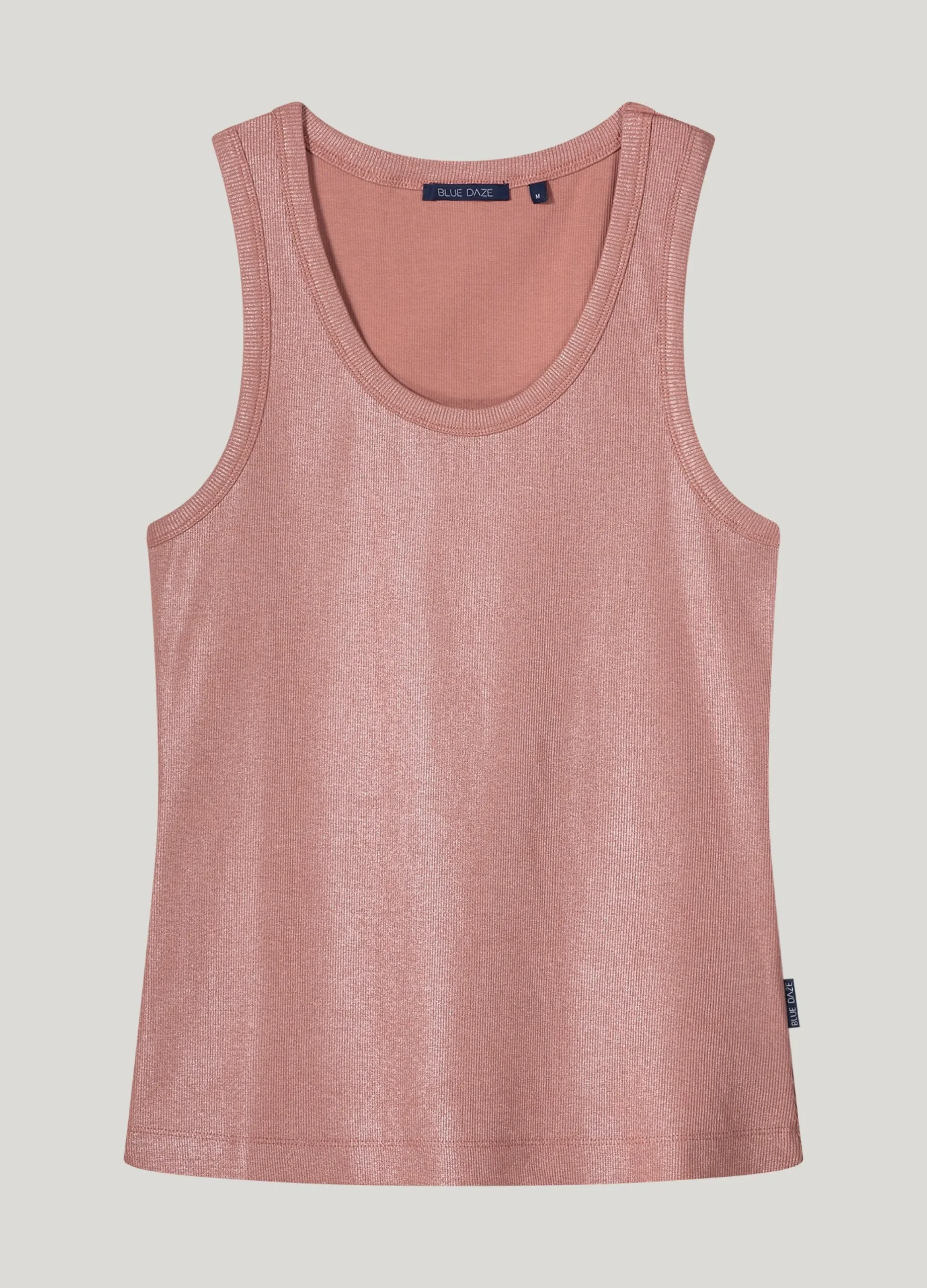 Tank top made of stretchy ribbed fabric. The top has wide-finished cuffs along the neckline and arms and an all-over shiny foil print.