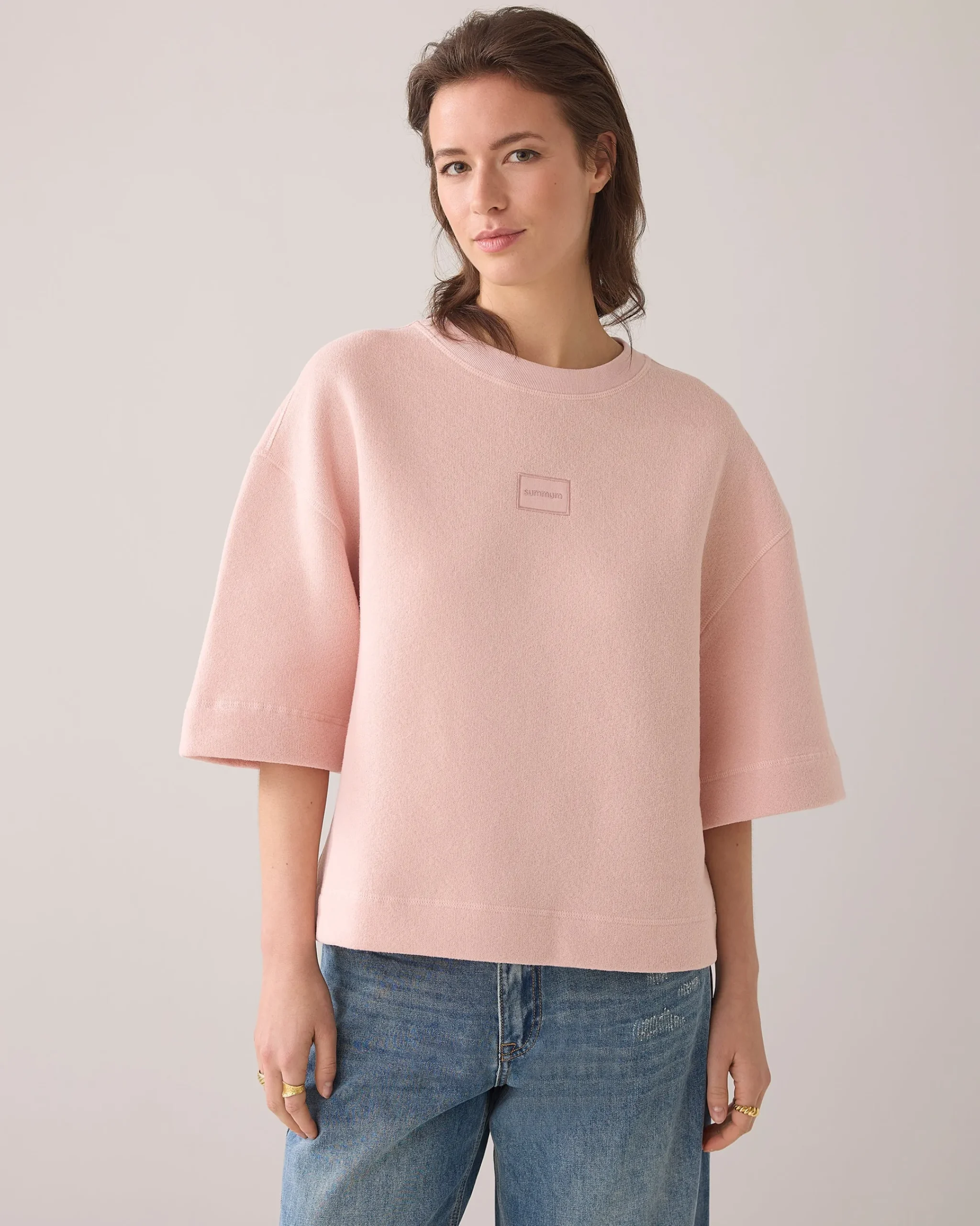 This jumper has a boxy fit and is made from a soft, comfortable sweatshirt quality. The lowered sleeve hem and subtle Summum logo embroidery at the centre front give the jumper a casual-chic look.