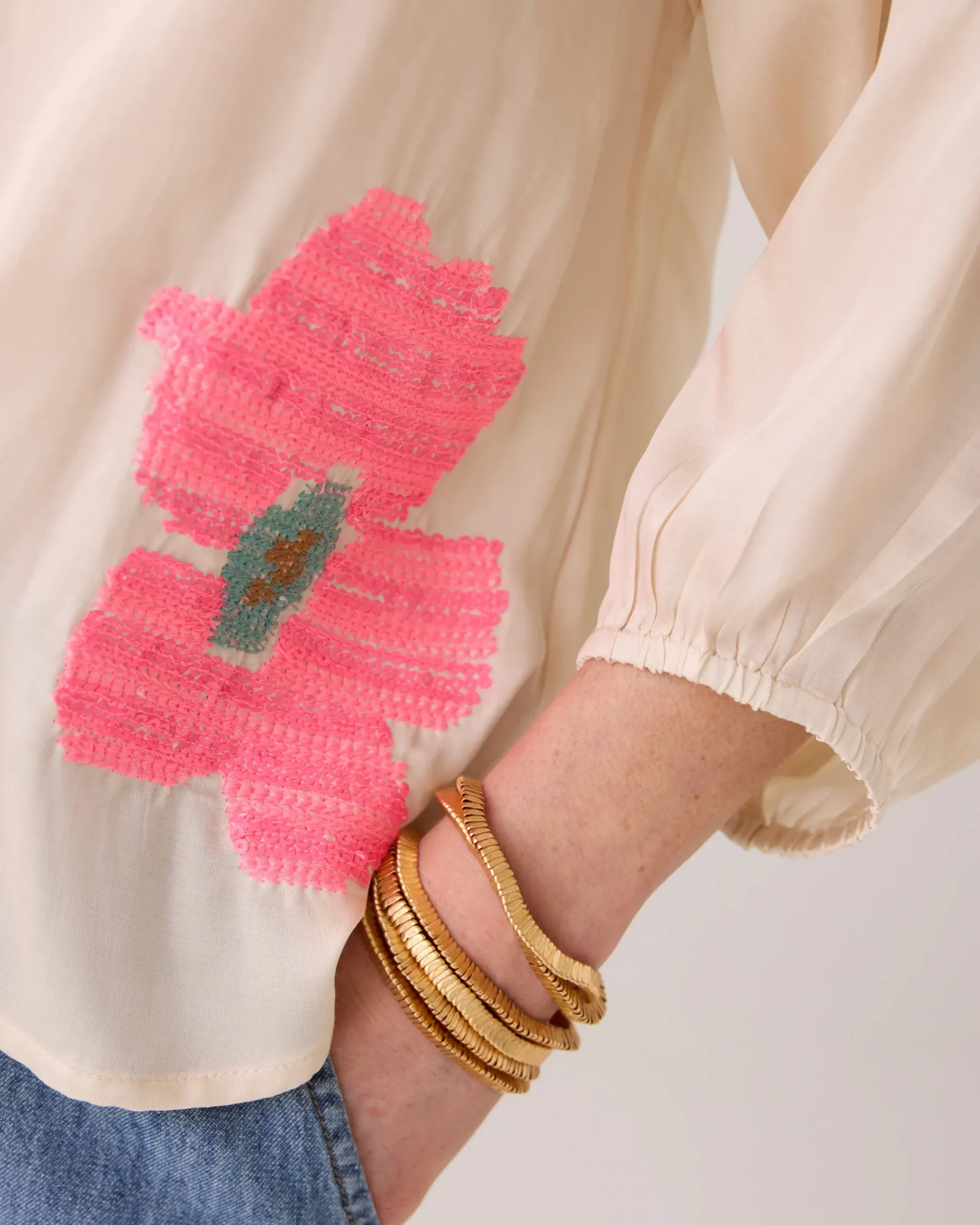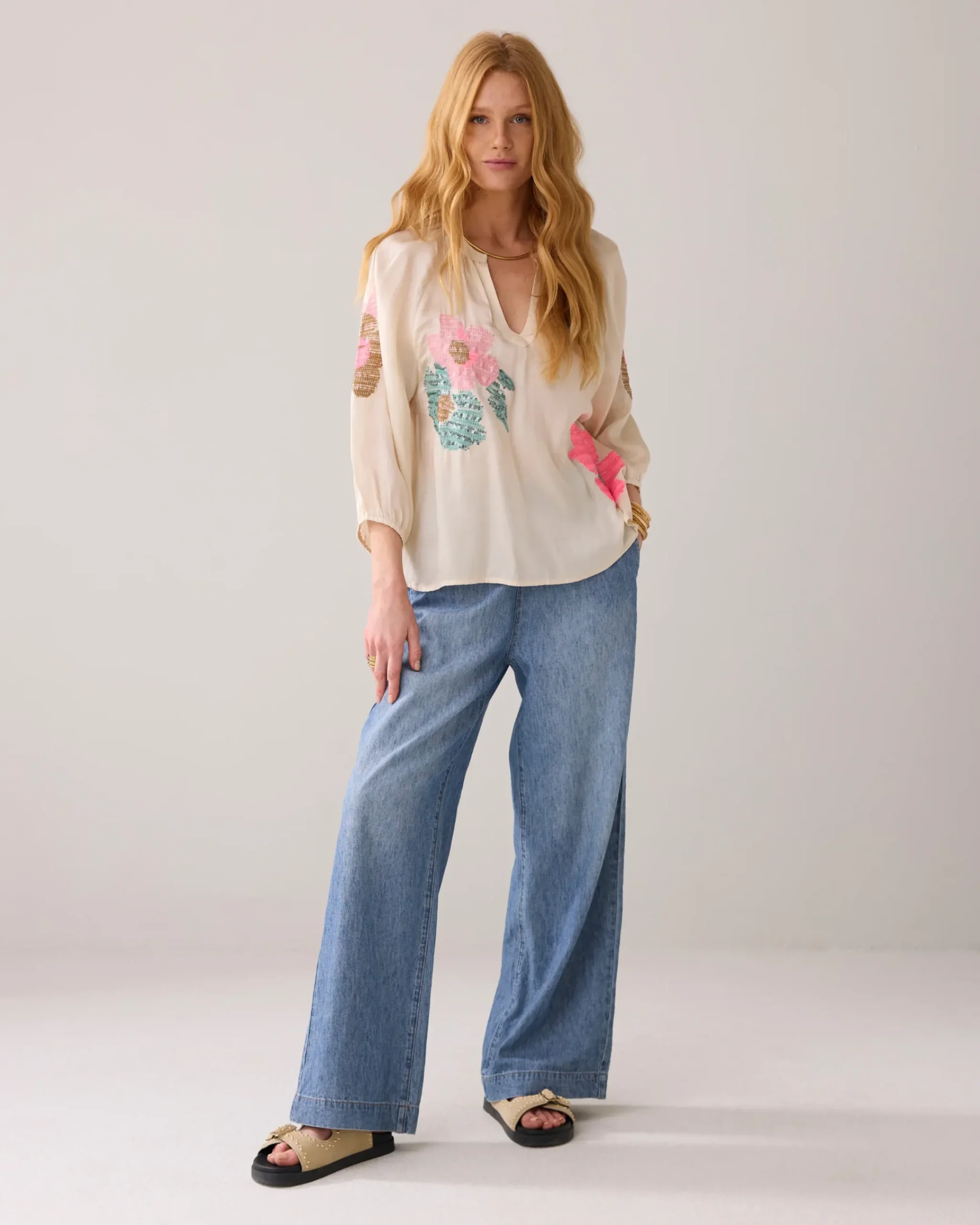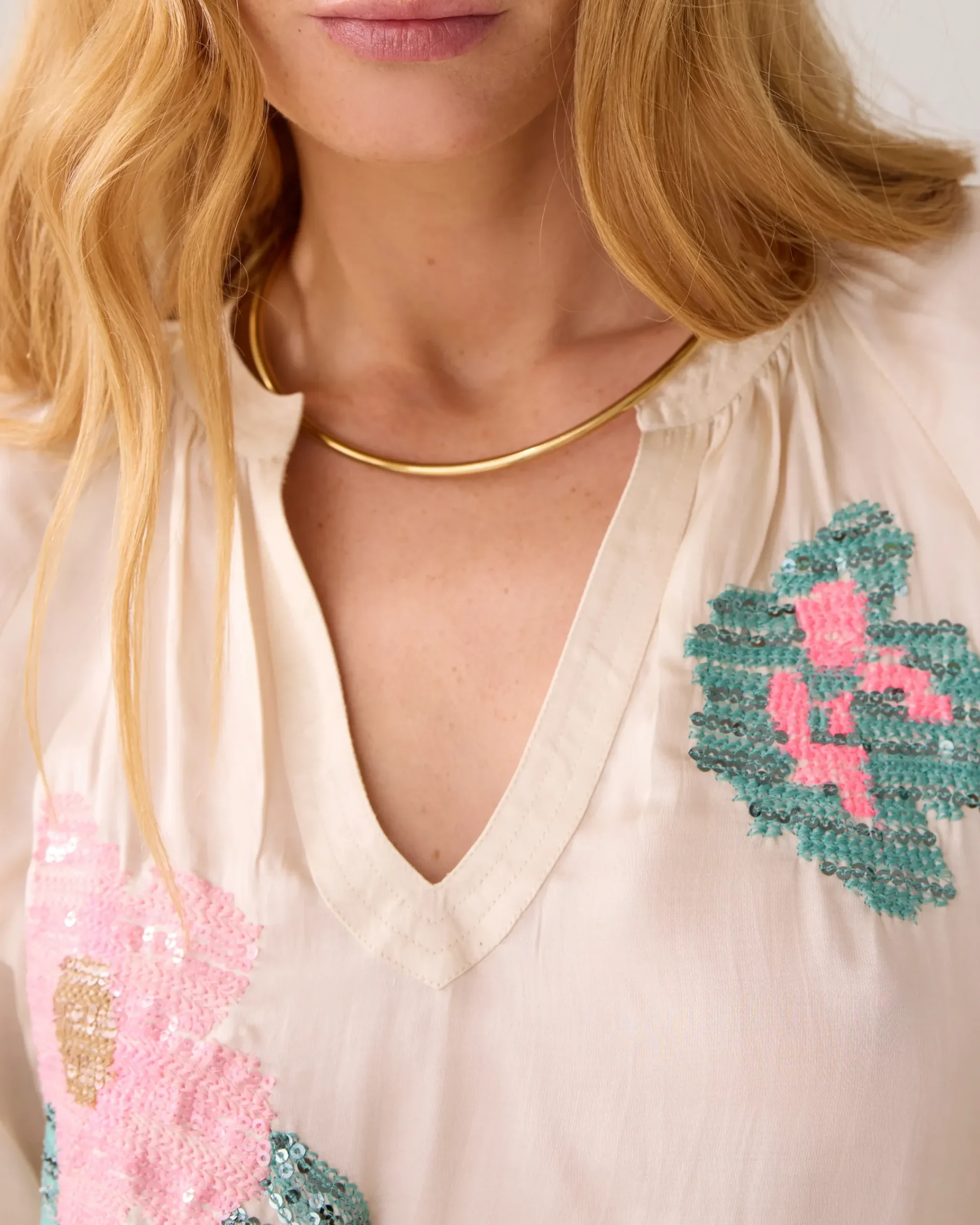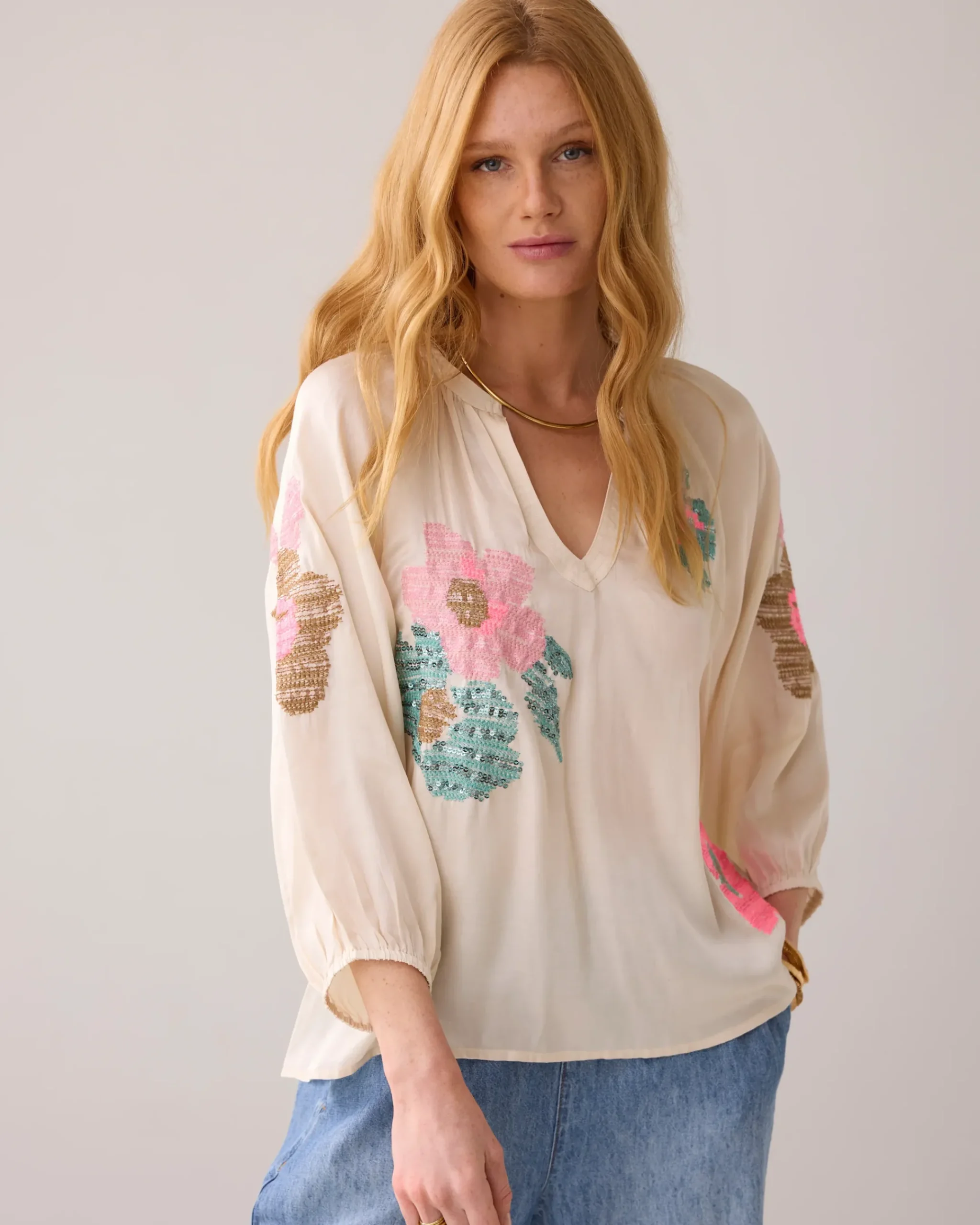 made of shiny viscose satin, this flowy top features an embroidered floral pattern with colourful sequins. The top has a slight A-line fit and three-quarter puff sleeves with elasticated cuffs.