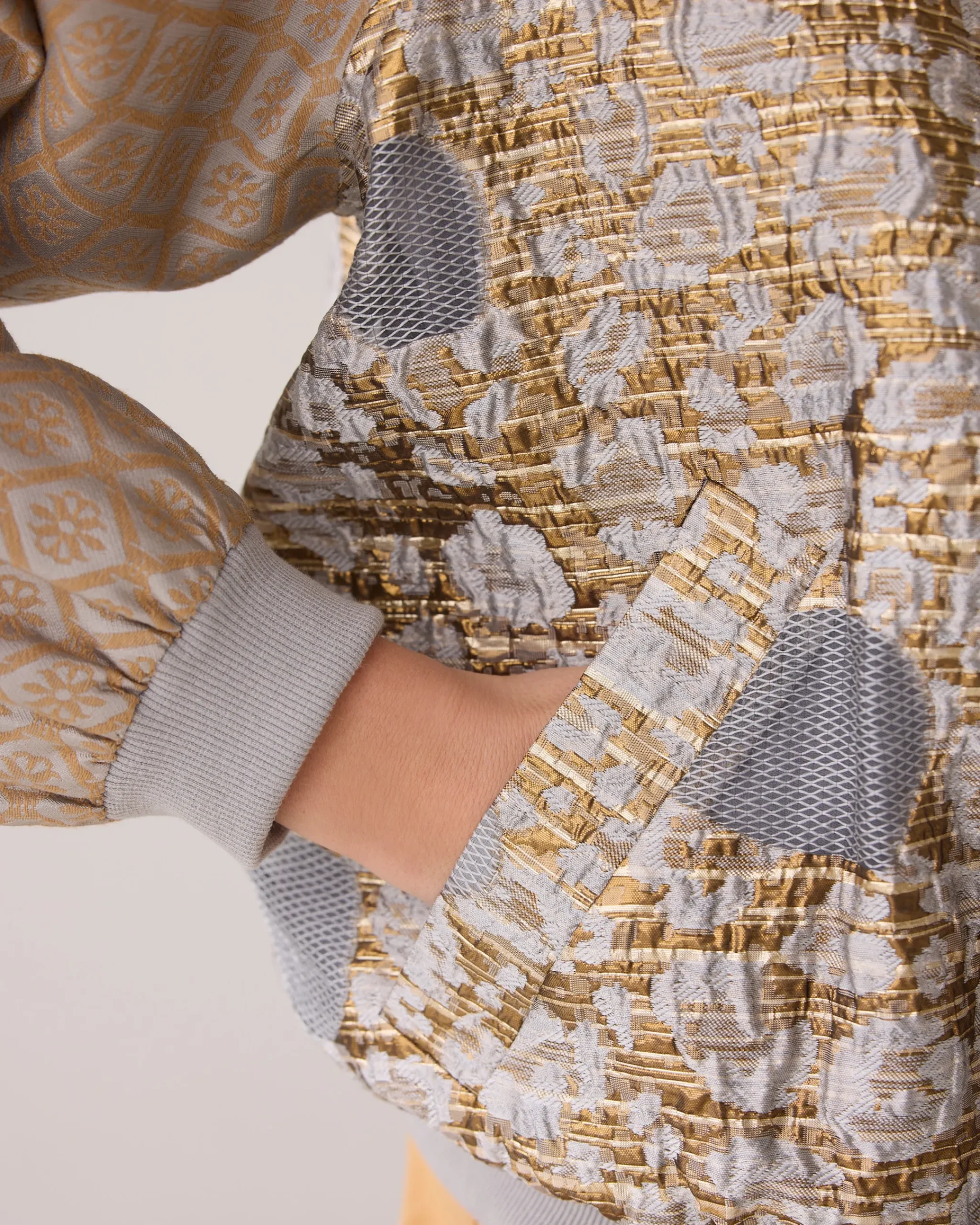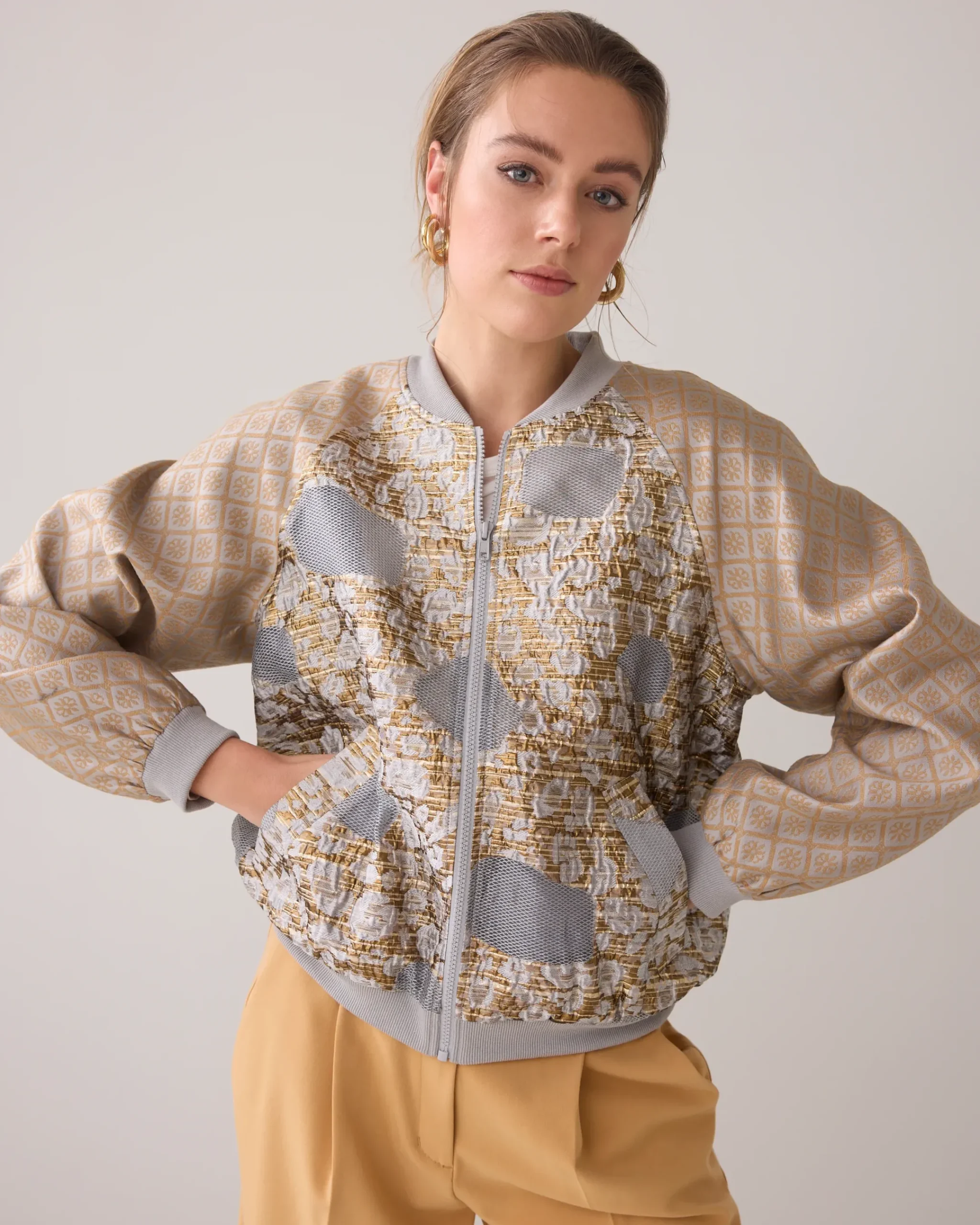 This bomber jacket has a round ribbed neckline and is made of two different jacquard designs. The jacket is lined, has long sleeves, a zip closure, elasticated cuffs and an elasticated hem.