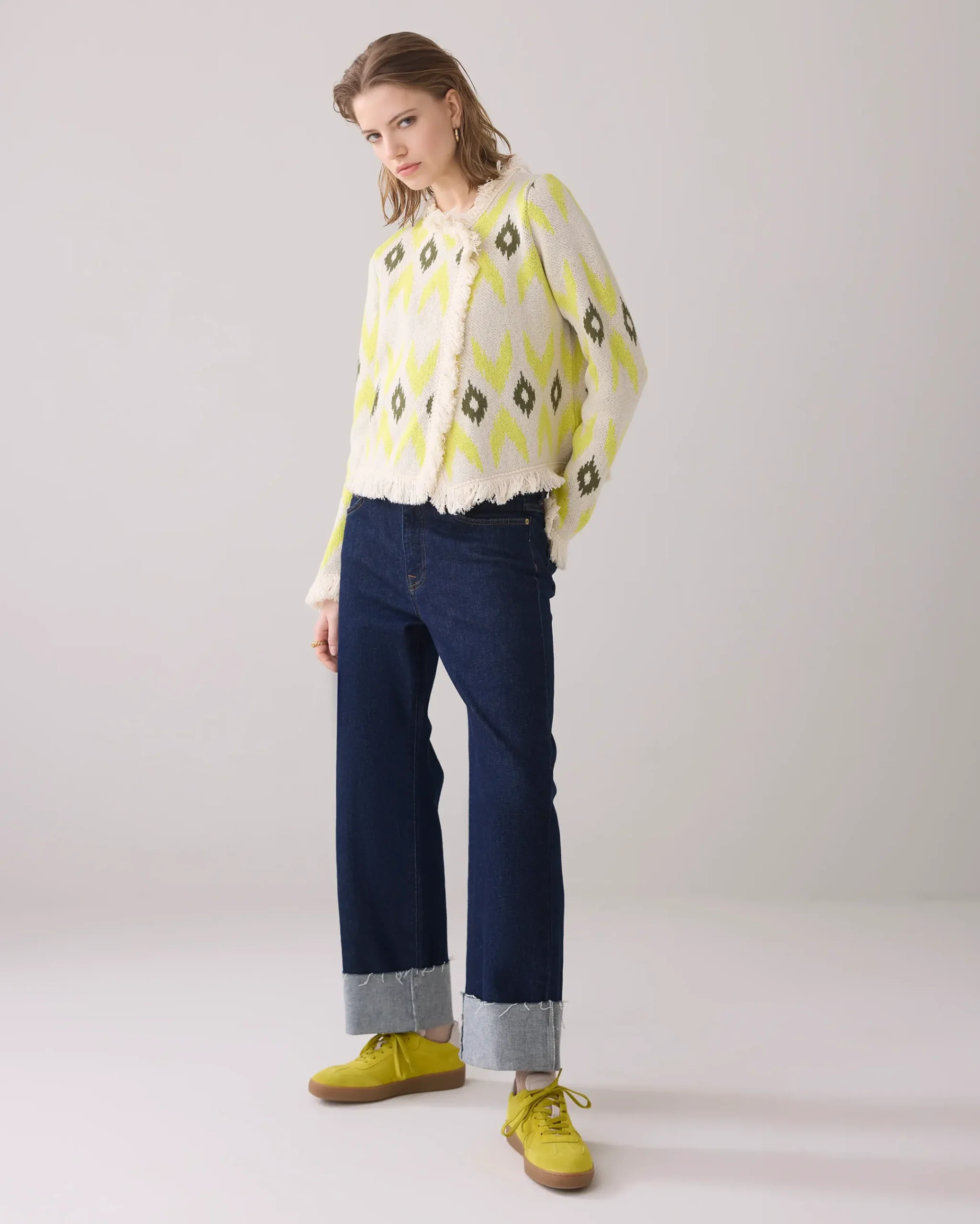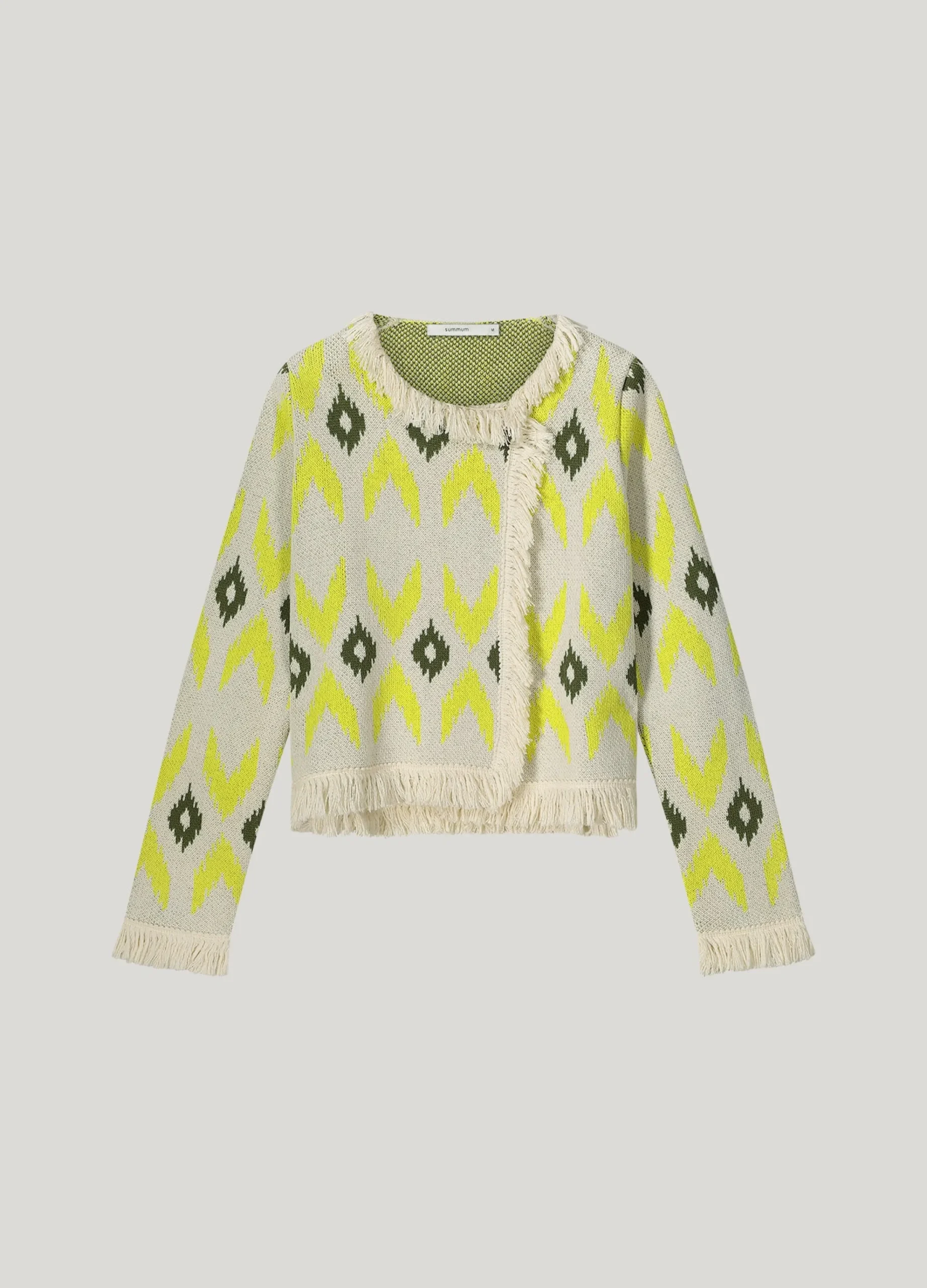 This jacket has a straight fit and is knitted in an Ikat jacquard pattern. The jacket has fringe along the neckline, cuffs and sleeves.