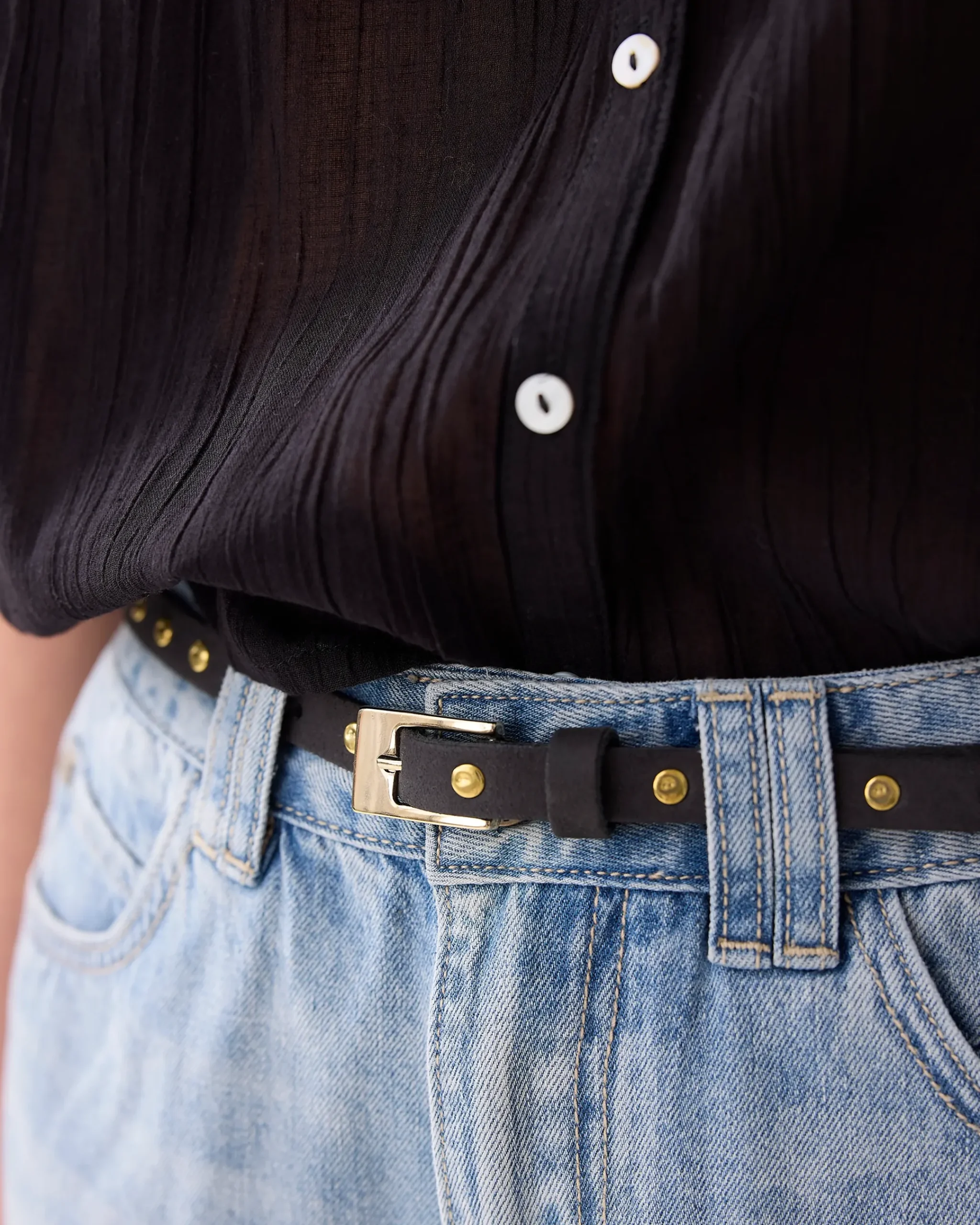 This narrow 15 mm leather belt is finished with flat studs and a gold buckle.