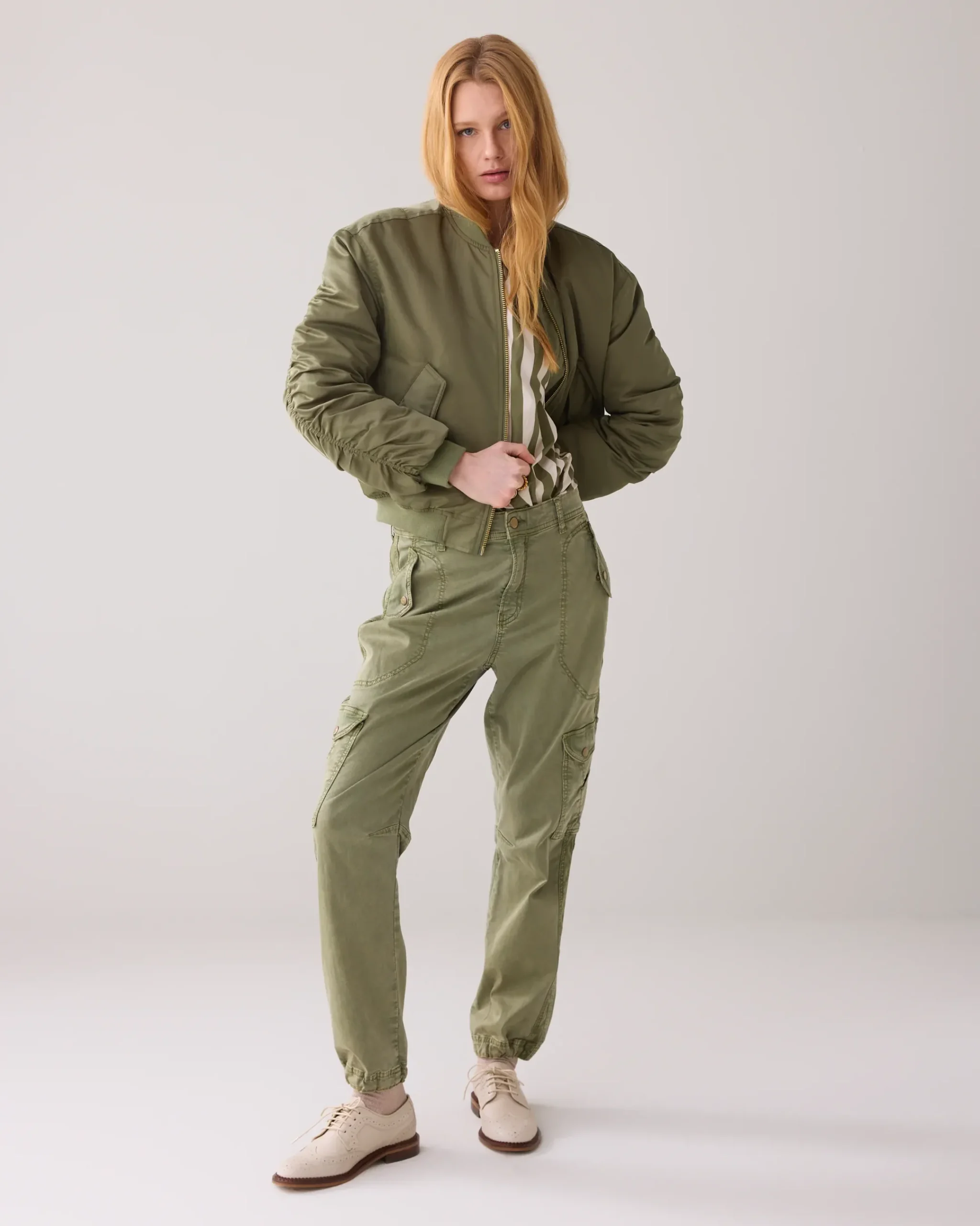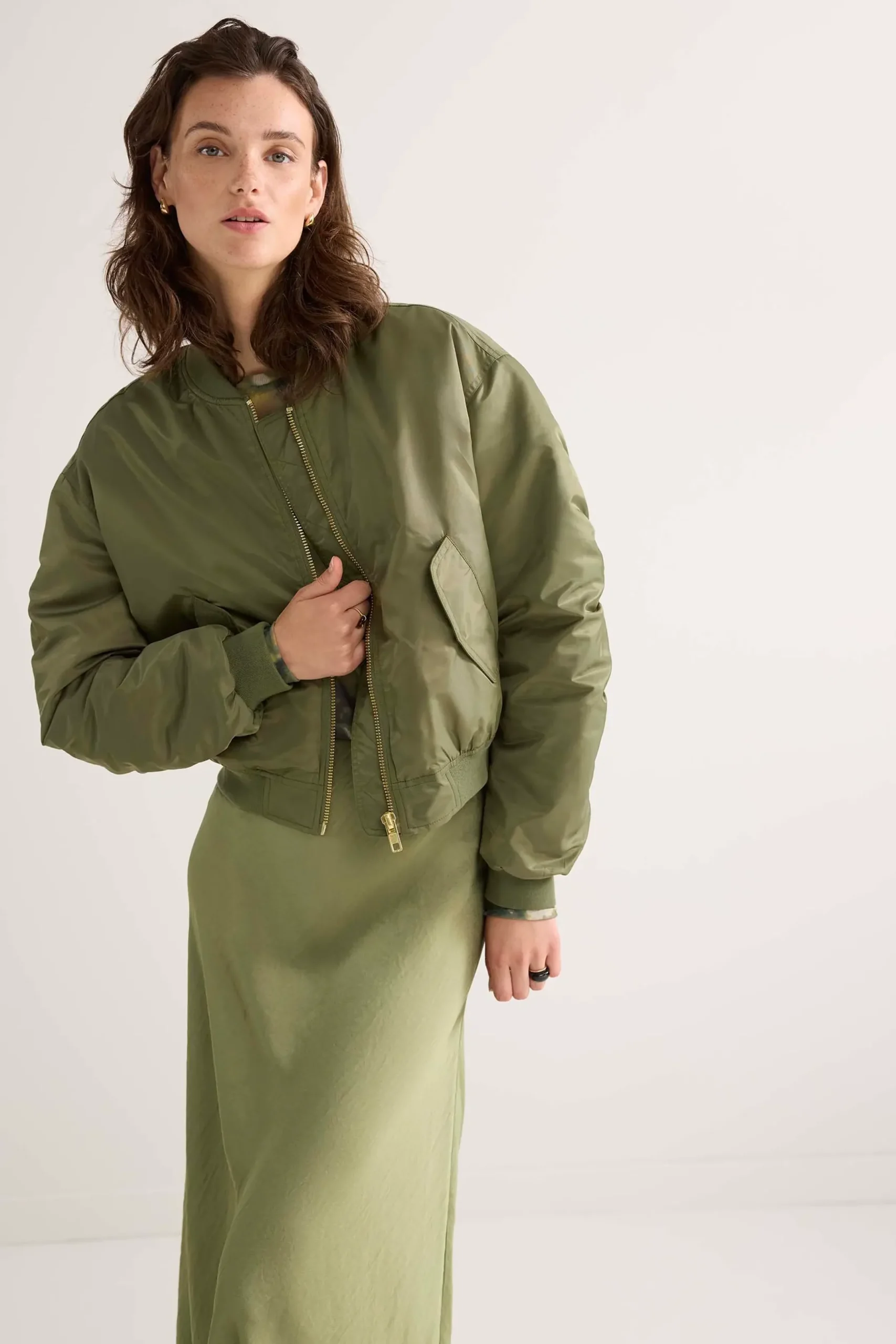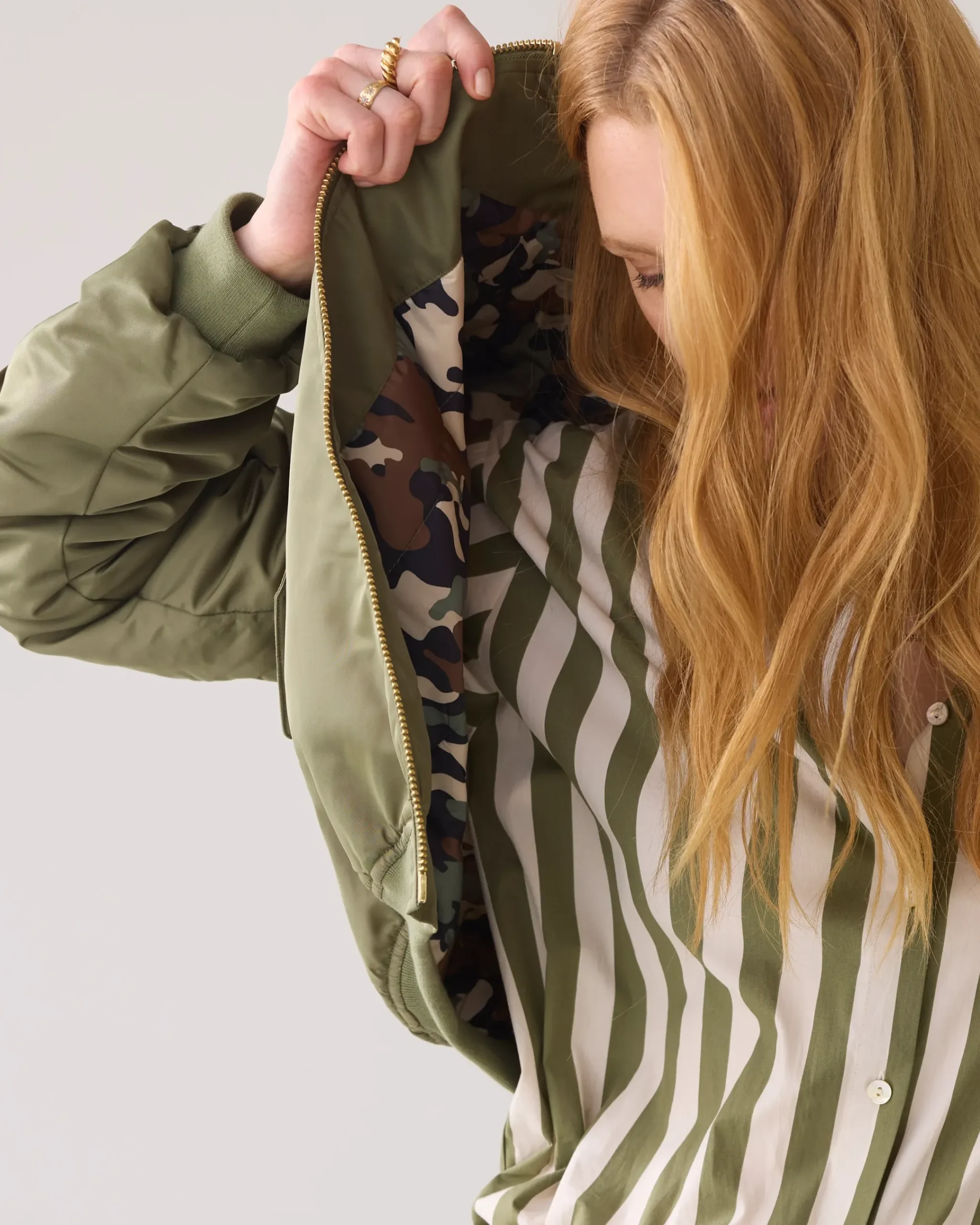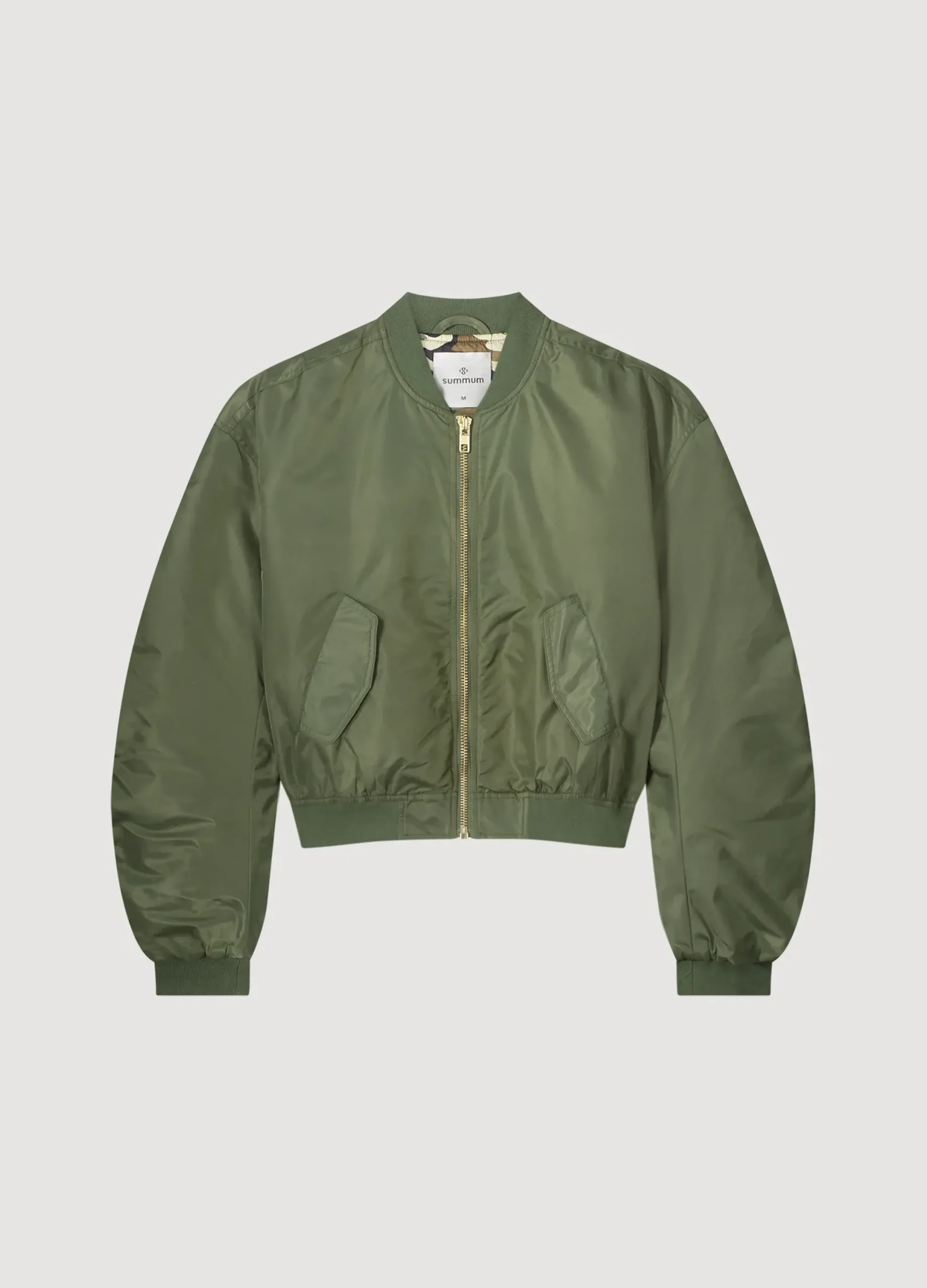 This bomber jacket has an eye-catching camouflage lining and pleasantly roomy fit. The jacket has flap pockets with press studs. The gold zip and pulled seams on the back of the sleeves add to the true bomber fit.