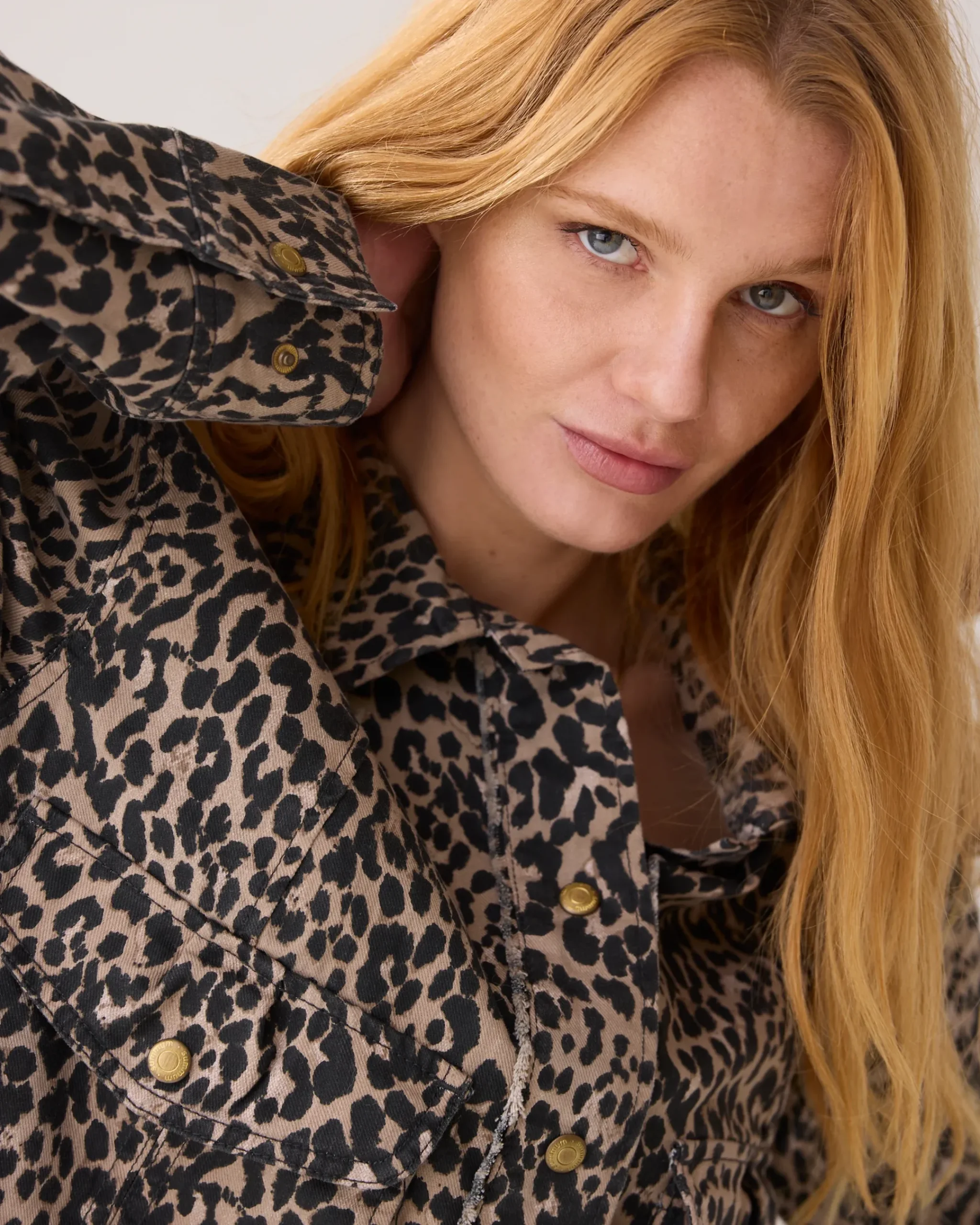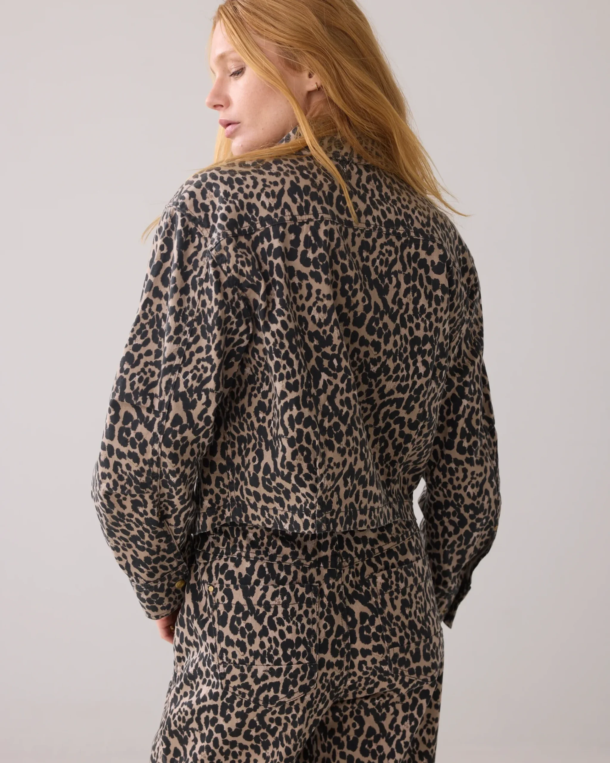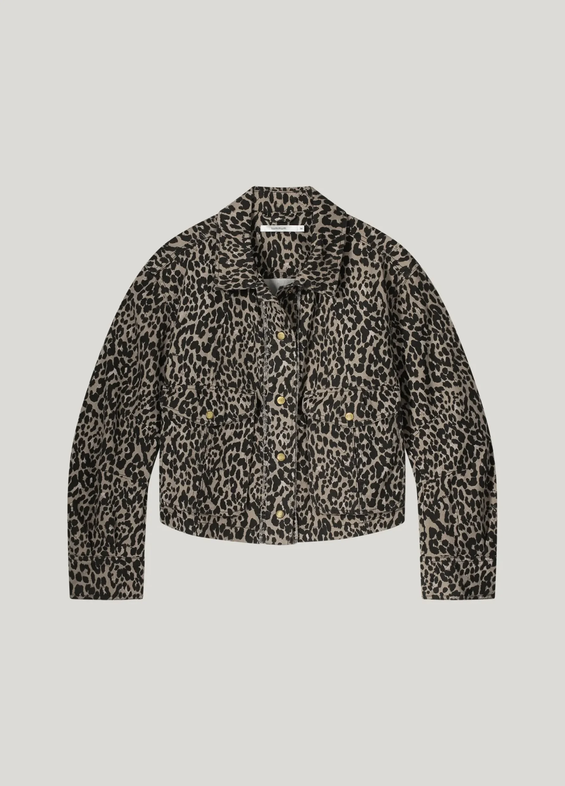 Short jacket with a boxy fit and eye-catching panther print. The jacket is made of stretch twill with eye-catching double pockets at the front.
