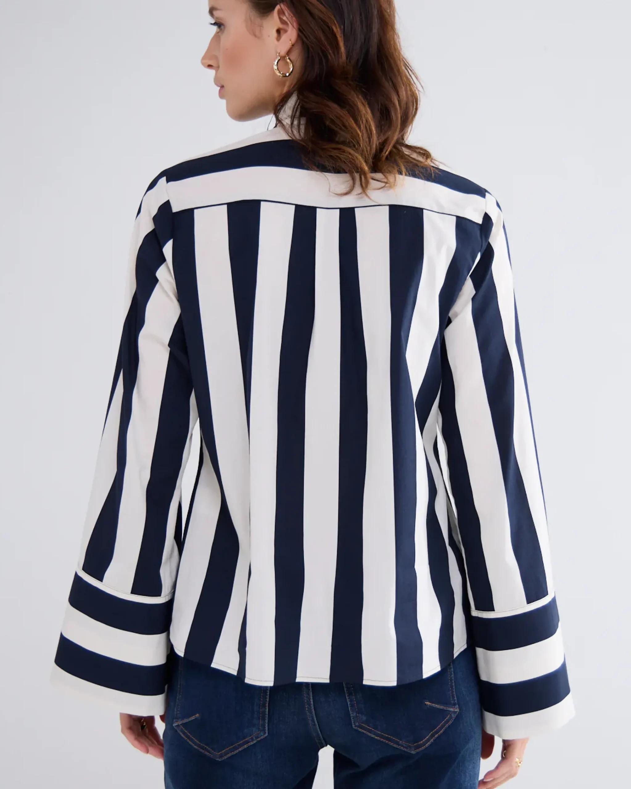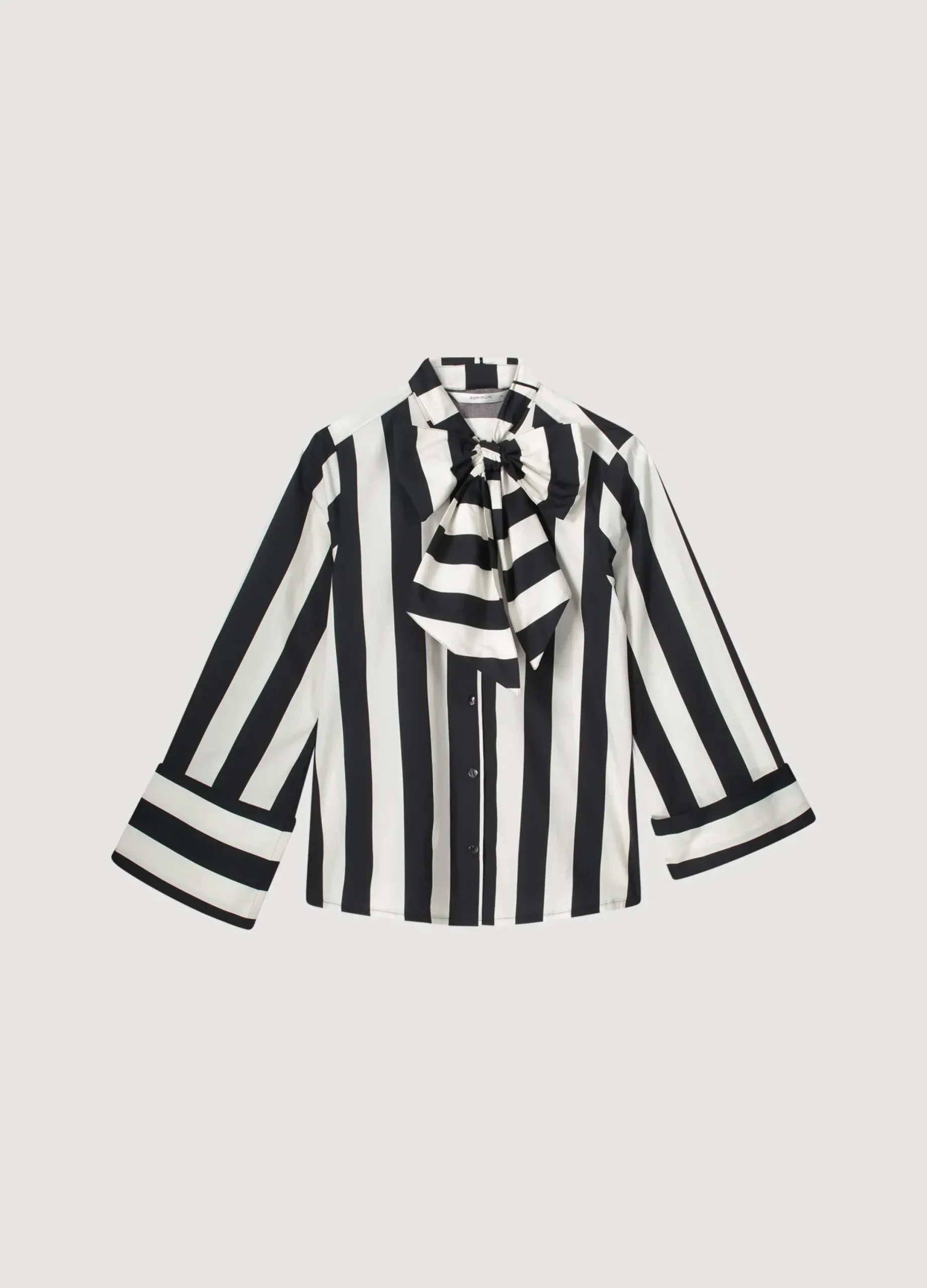 Striped blouse with stand-up collar and detachable large bow. Features distinctive horizontally striped cuffs.