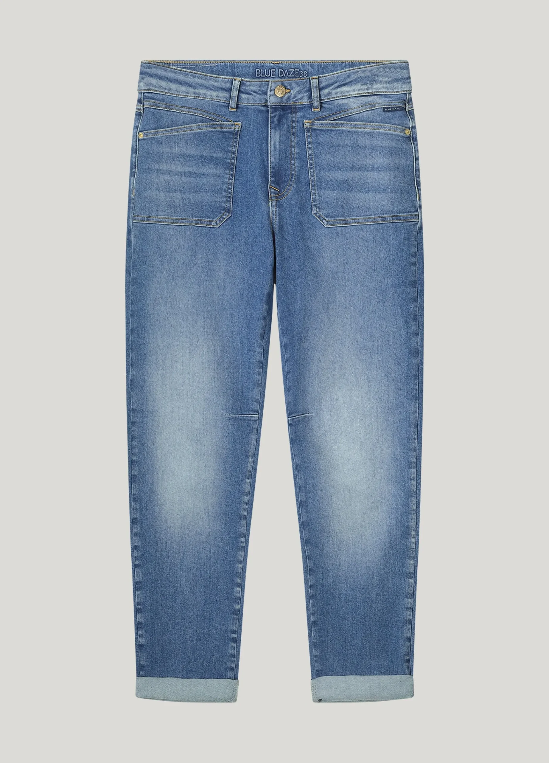 These tapered jeans are made of soft stretch denim and have a mid-rise waist. The tapered legs fall to the ankle.