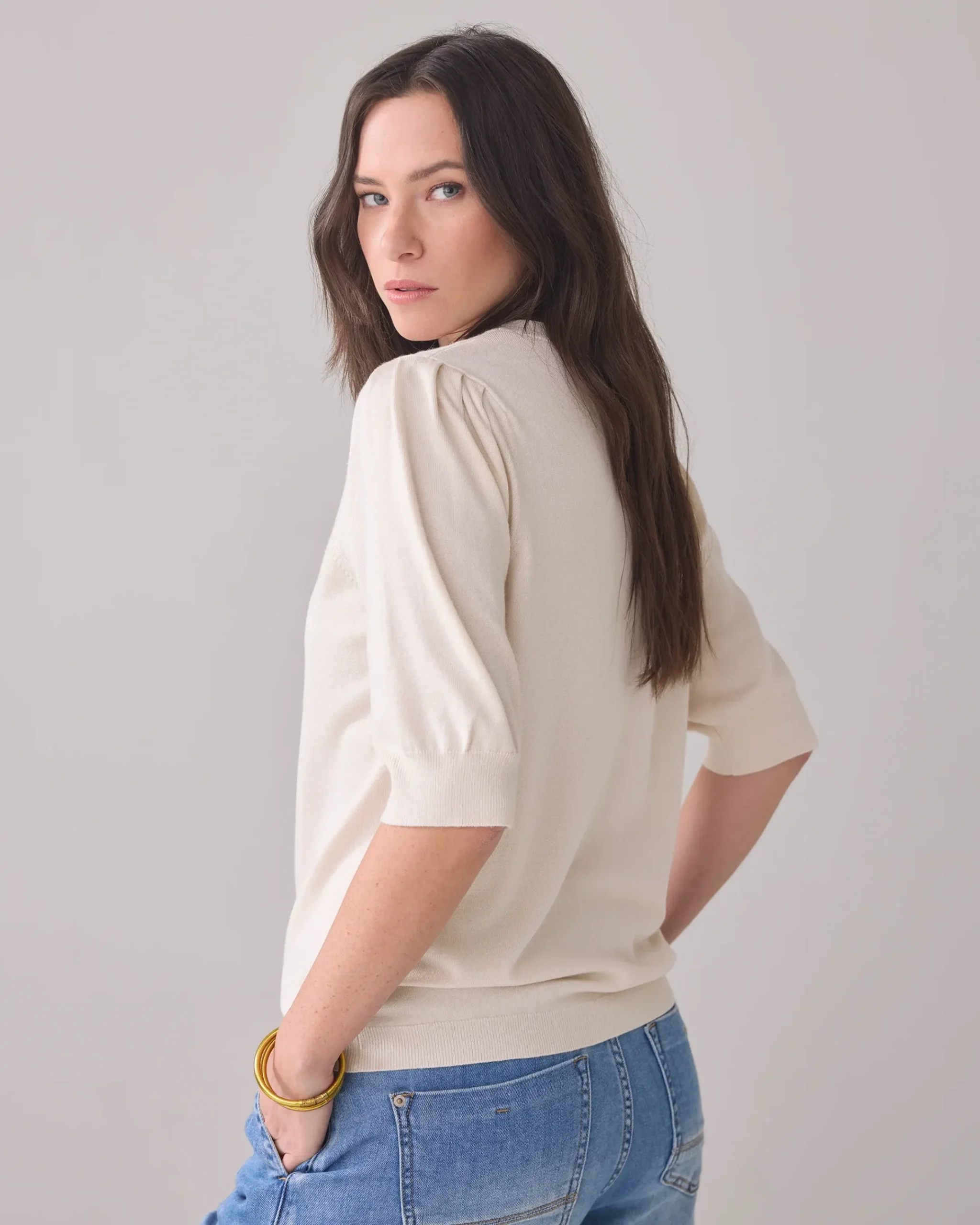 A basic that is actually too pretty to be called basic. Because the combination of soft viscose and light puff sleeves gives this ‘simple’ top a timeless and quirky look.