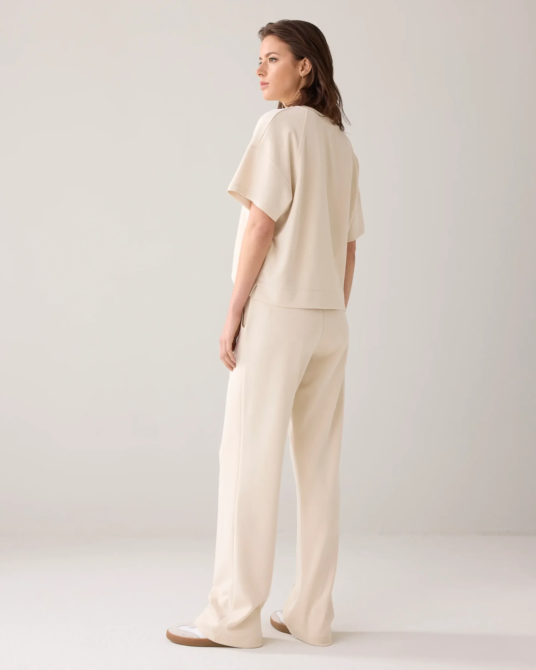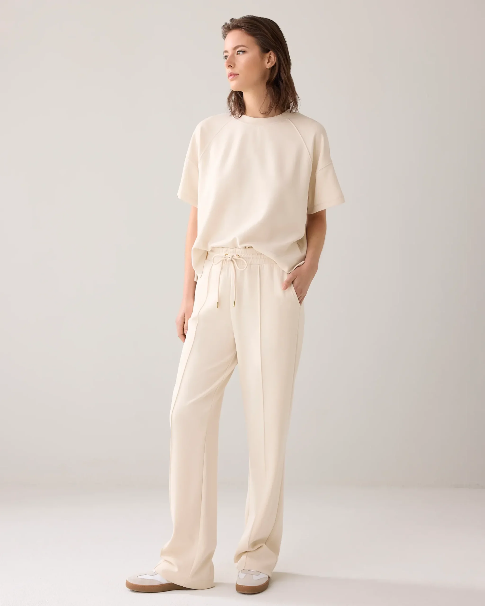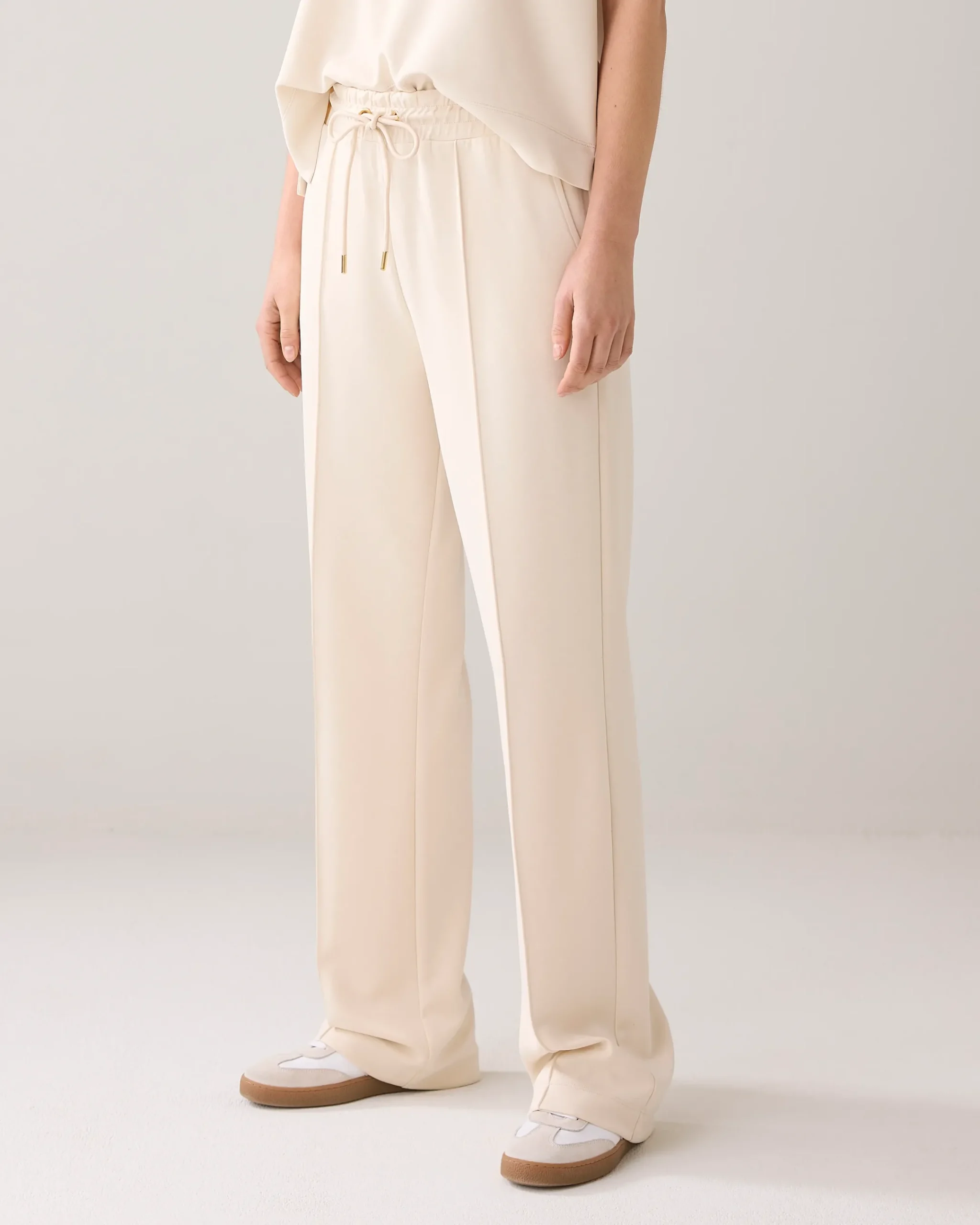 These soft jersey trousers have a relaxed, wide fit and a pintuck seam at the centre front. The trousers have a drawstring fastening with gold eyelets and cord ends.