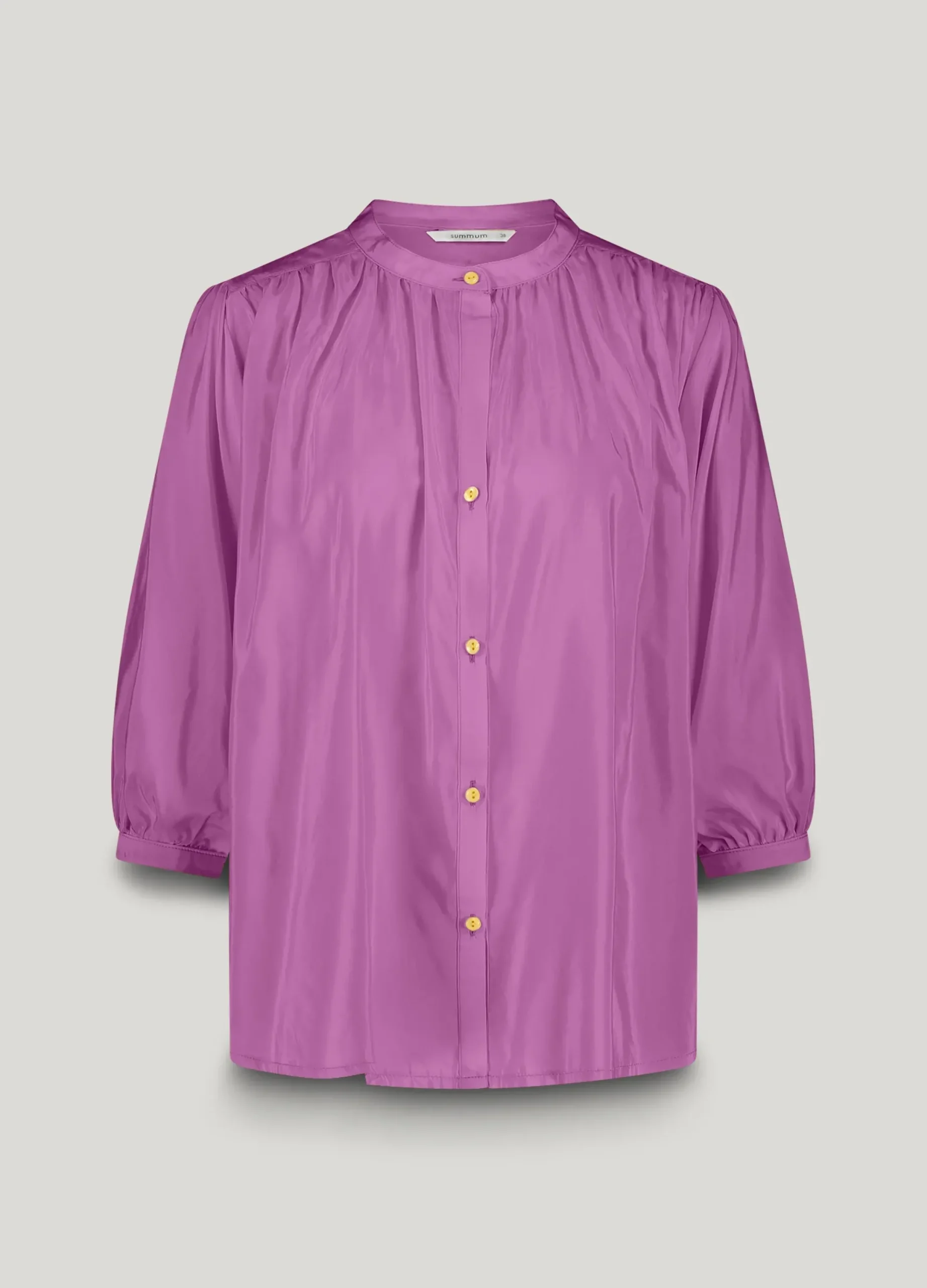 This airy blouse has a loose fit with a playful gathering on the shoulders and puff sleeves. The blouse has narrow shoulders and a stand-up collar.
