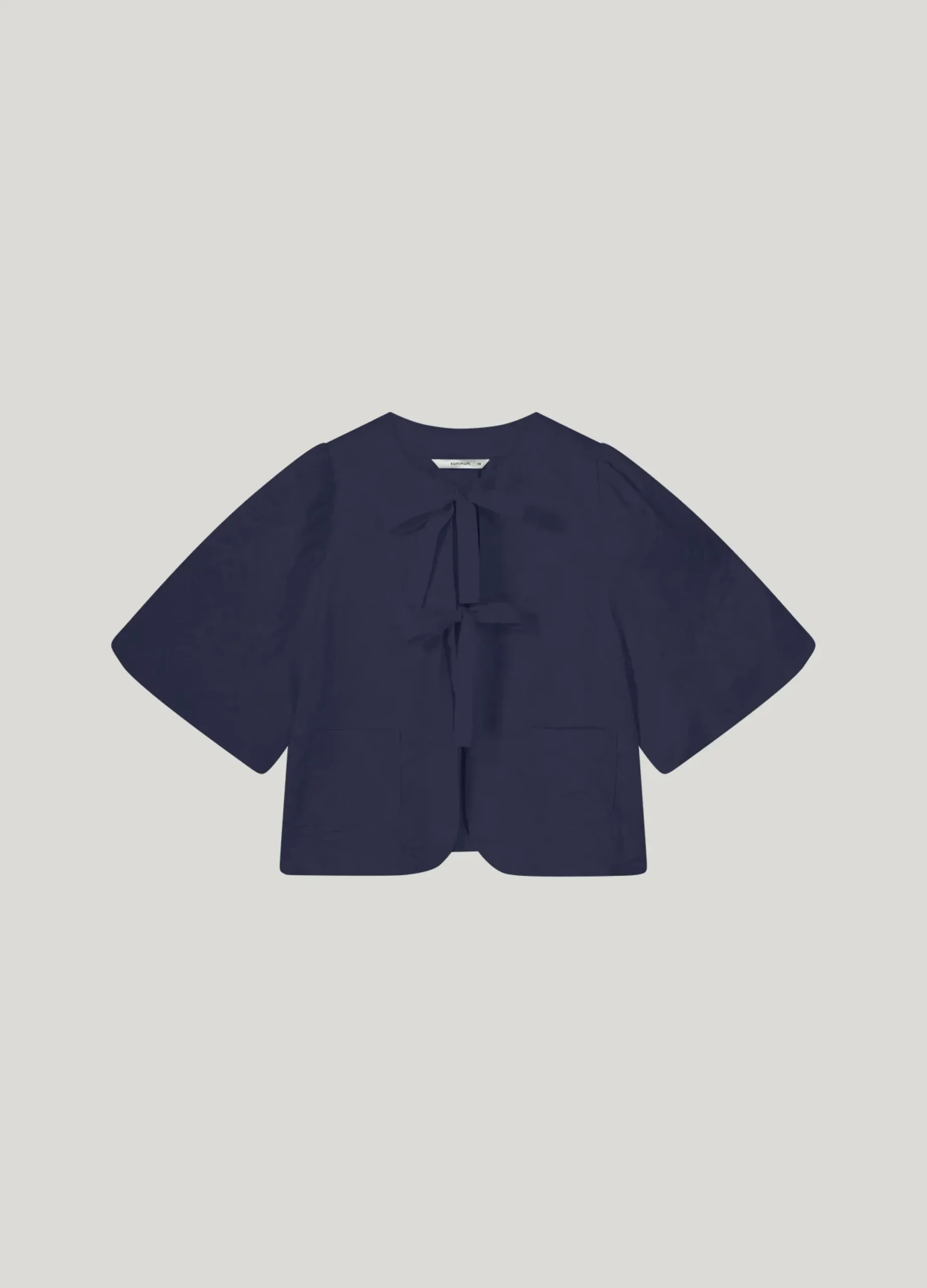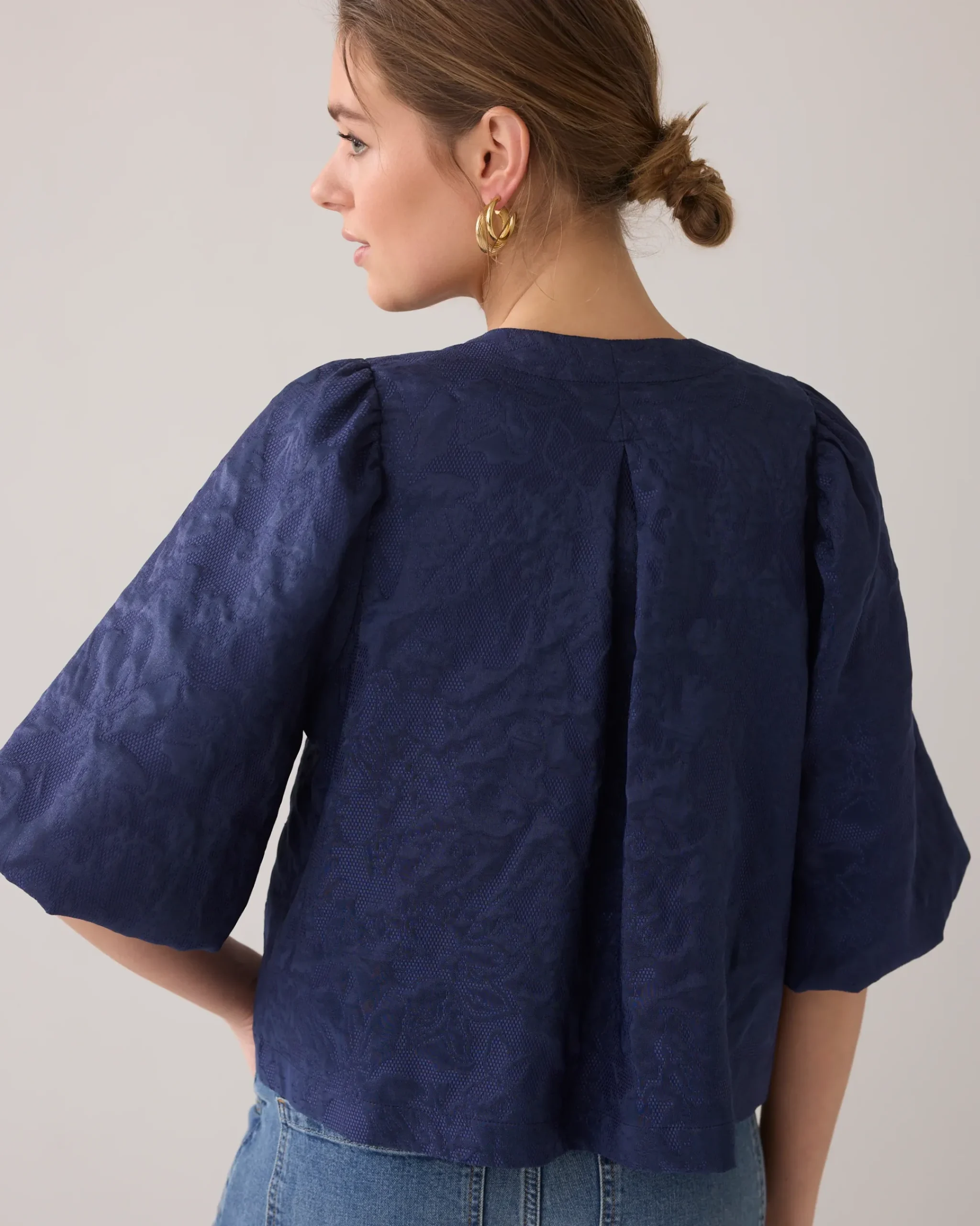 Made of a woven Jacquard fabric, this blouse jacket features short, lined balloon sleeves and a rib-strap bow fastening. The gathering at the back of the sleeves adds an extra balloon effect.