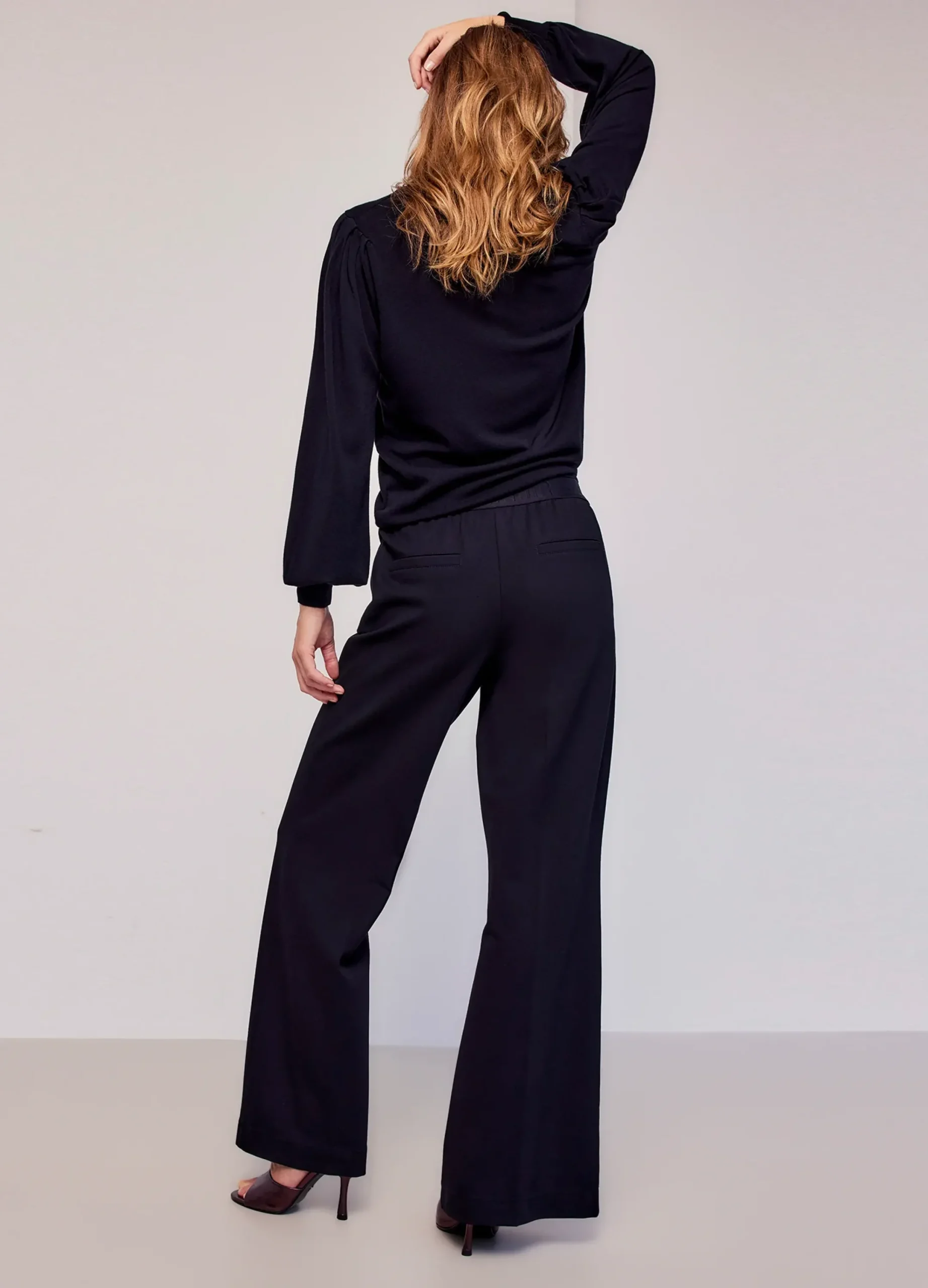 Wide-leg, boot-cut trousers with a permanent press fold, front slit pockets and stitched welt pockets at the back. The back of the waistband feature elastic with the Summum logo. Inseam is approximately 82cm for all sizes.