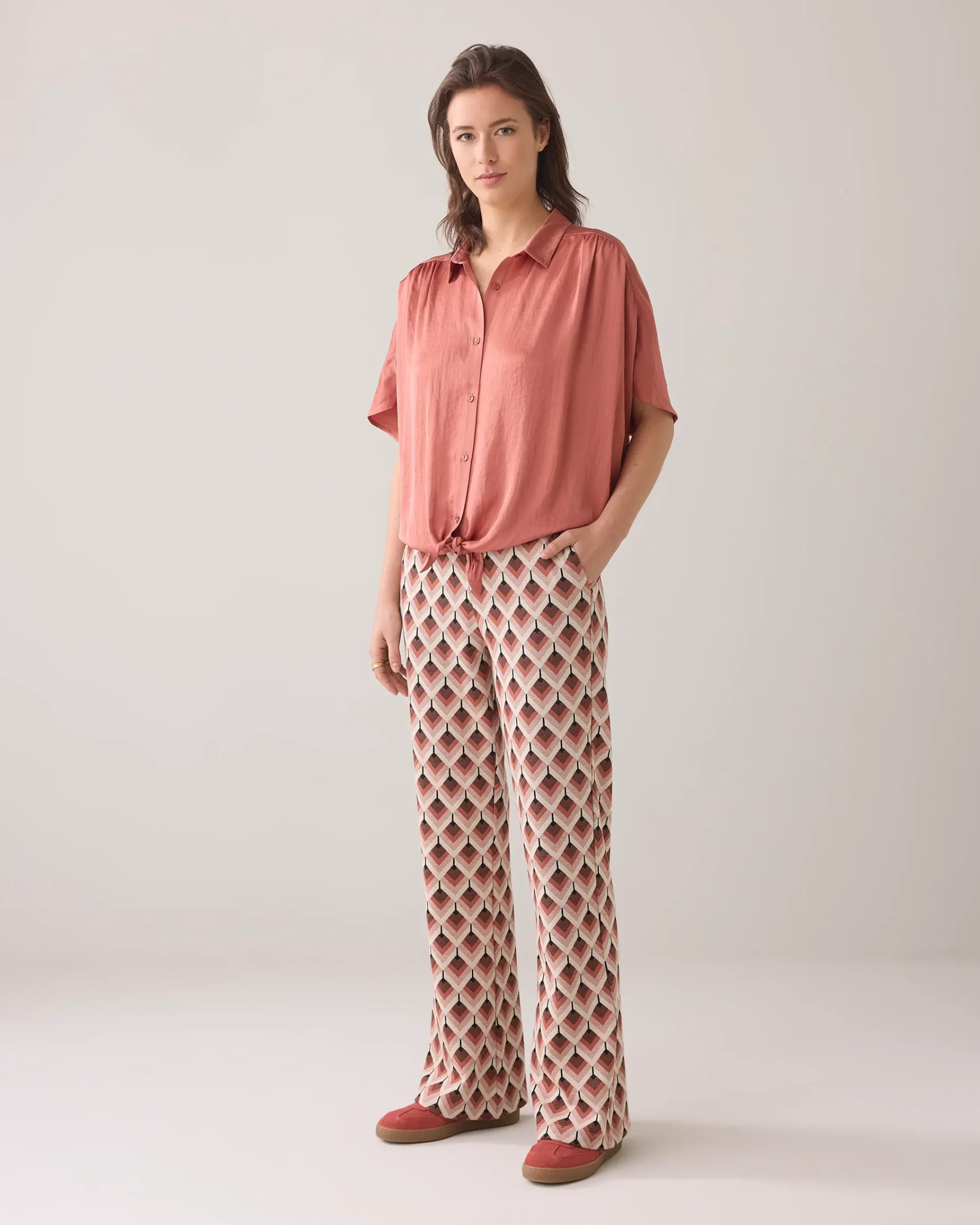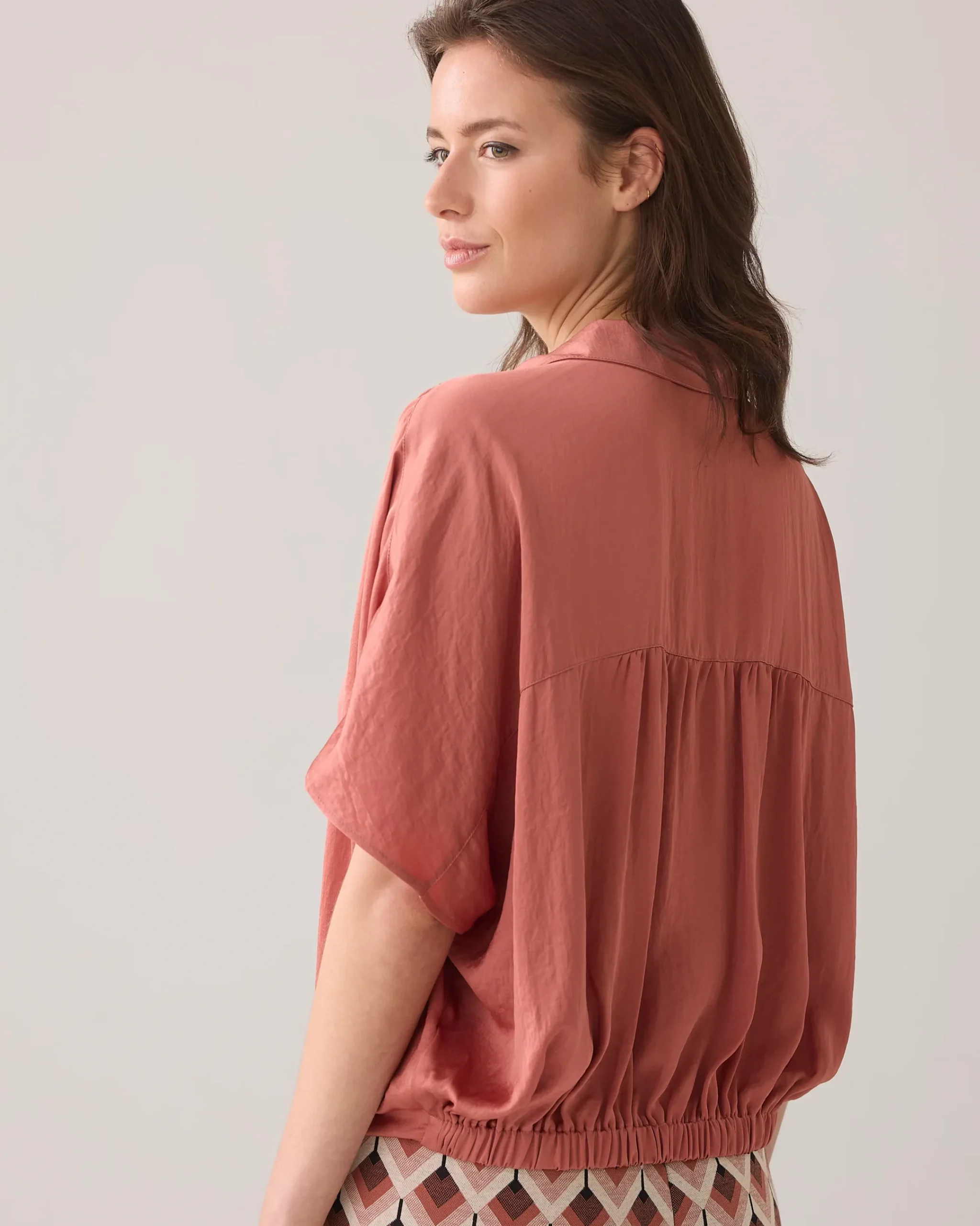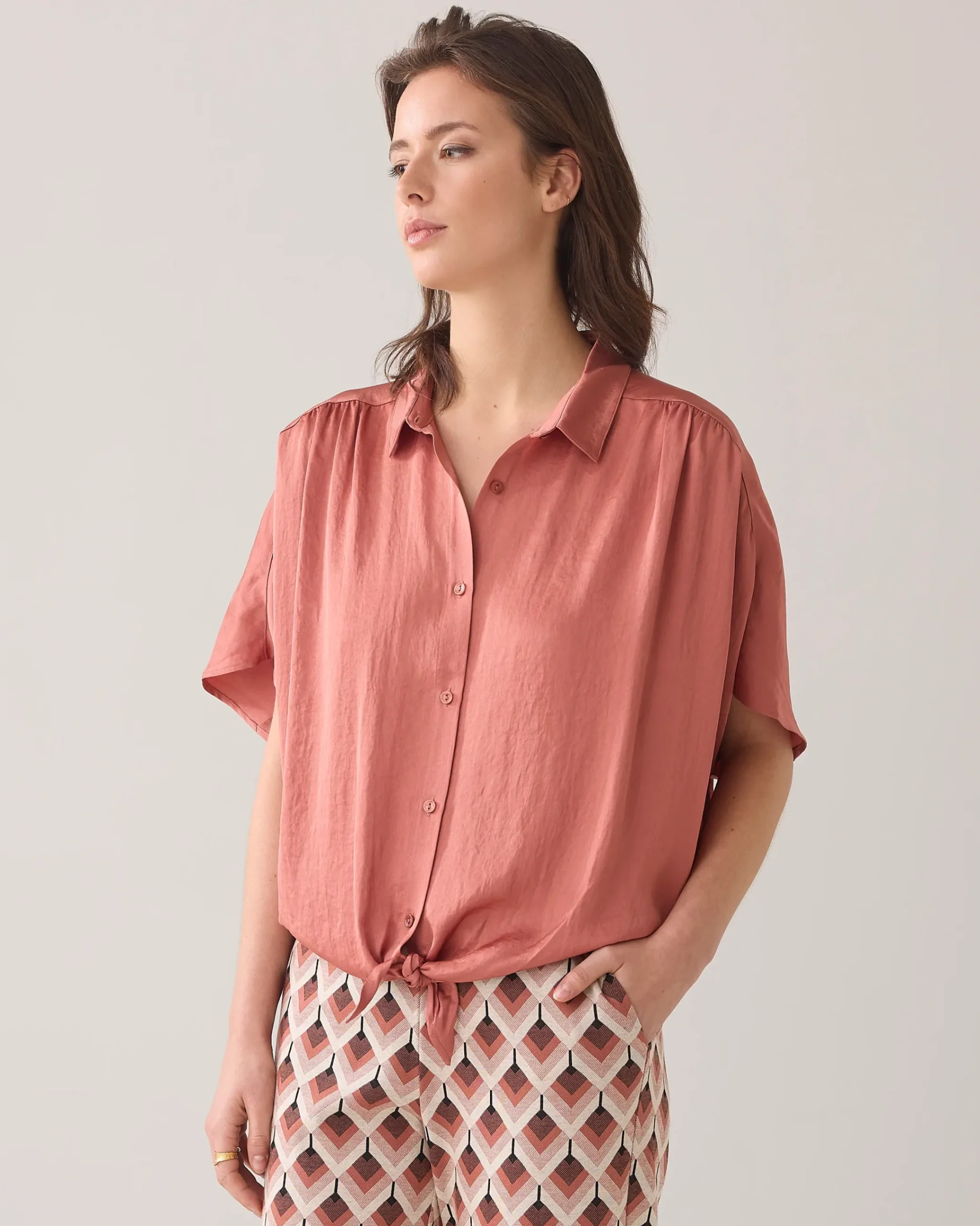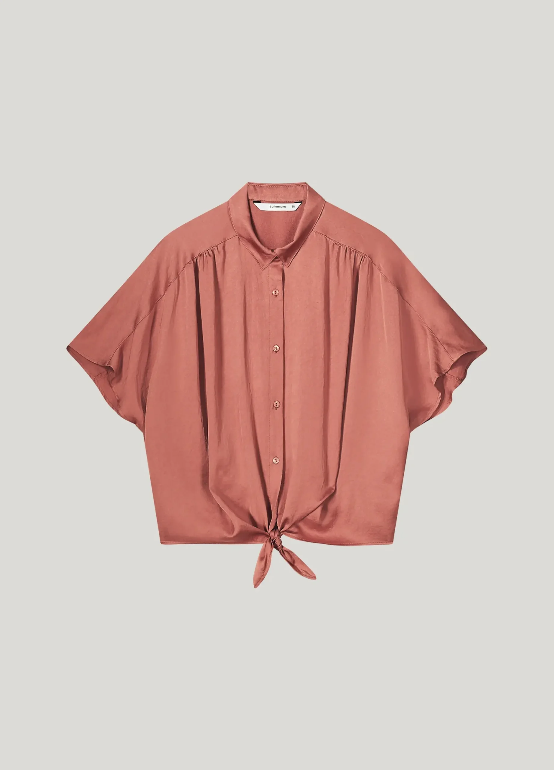 This blouse has a boxy fit and a bow detail at the bottom. The blouse is made of a supple satin-look fabric with crepe effect.