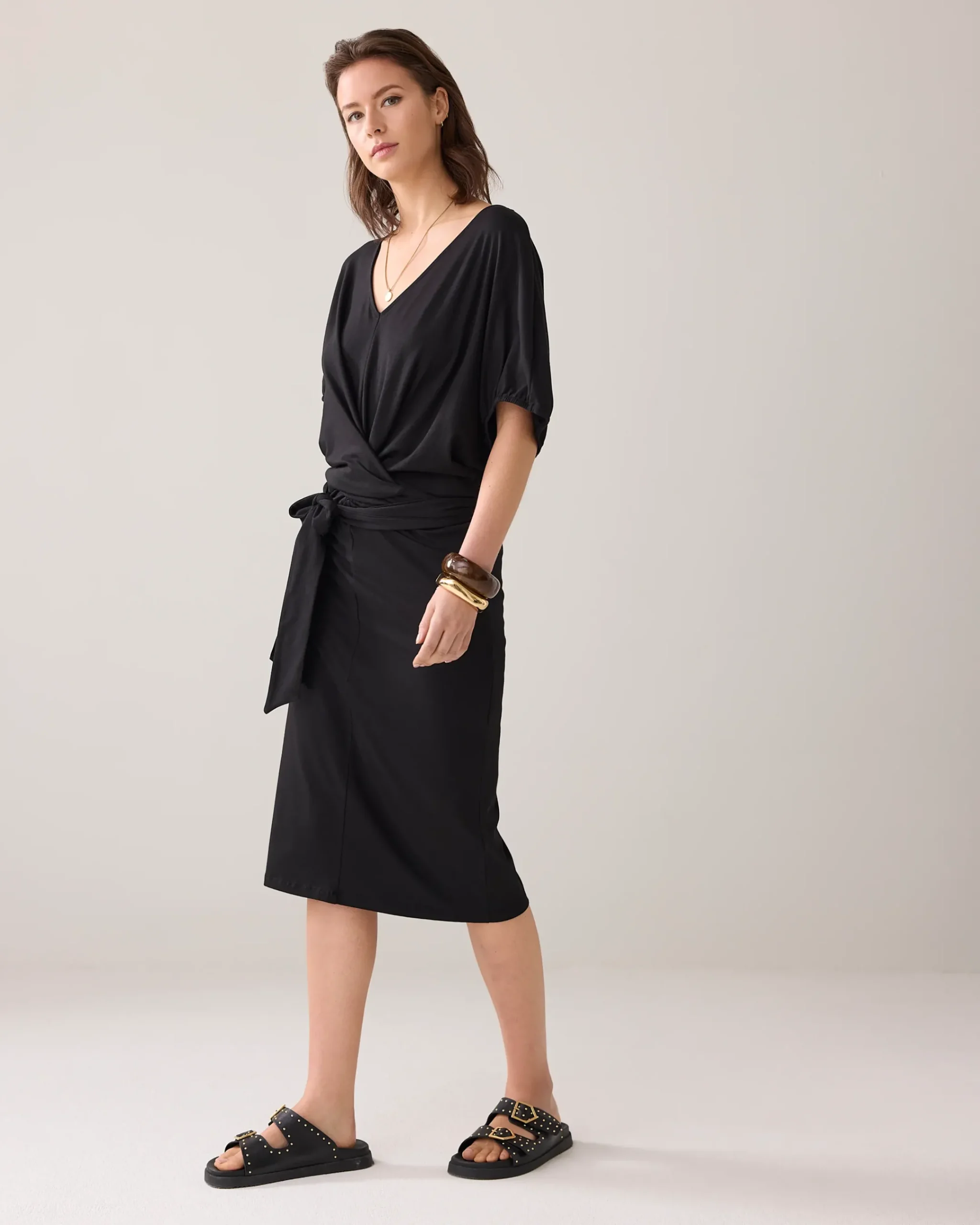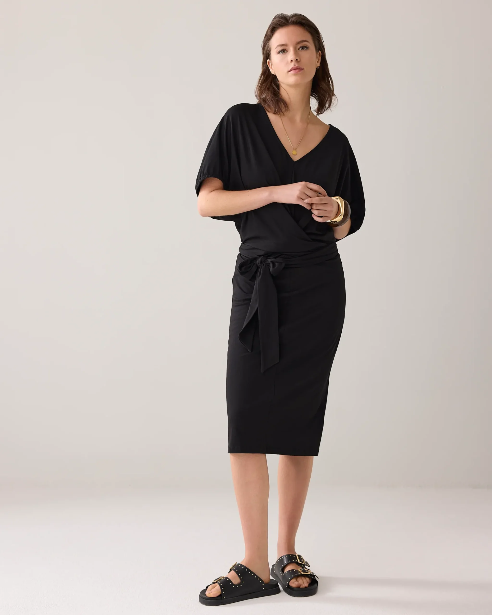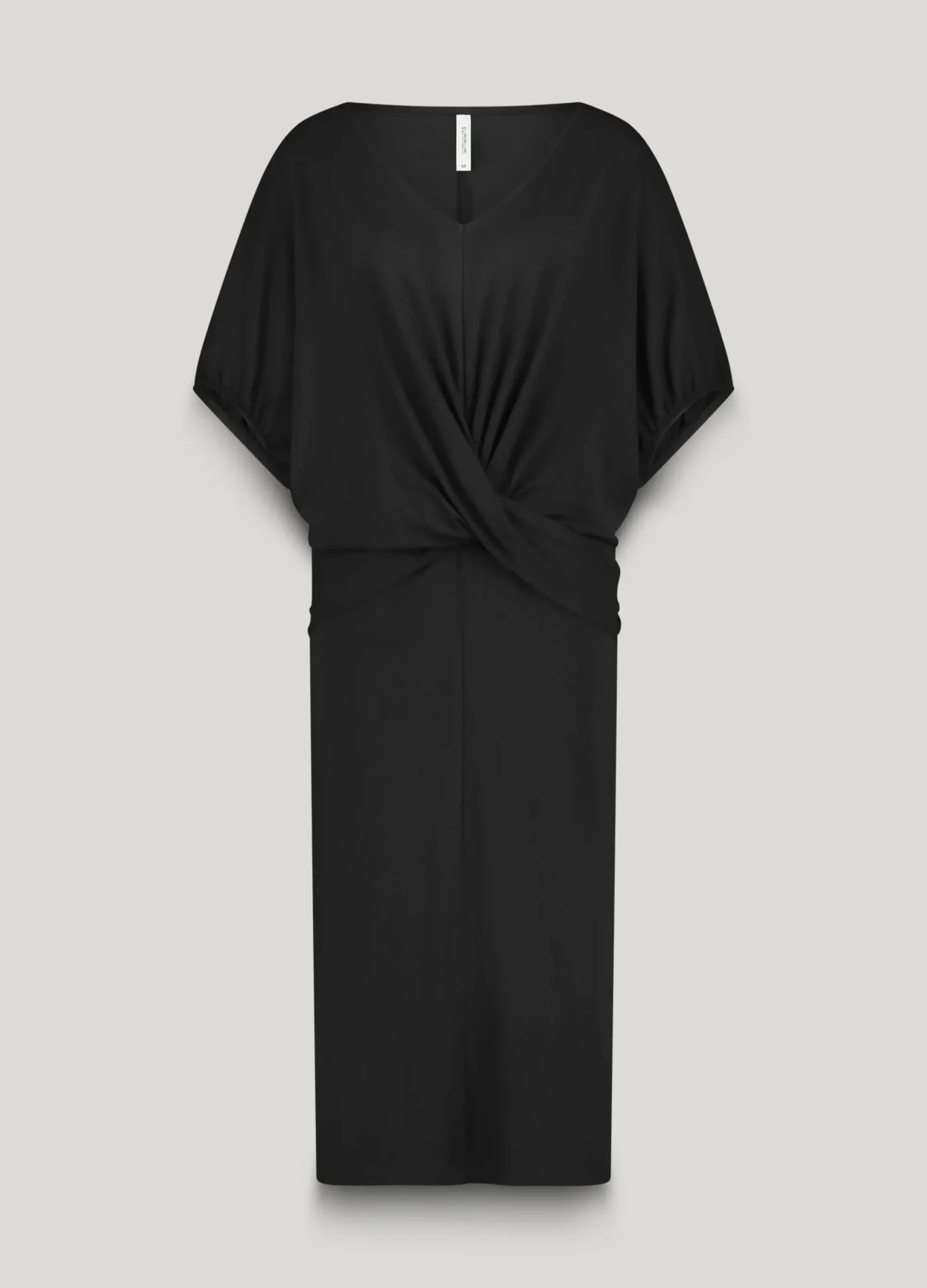This wrap dress is made of a supple jersey fabric. The dress has cropped sleeves with elasticated cuffs and a V-neckline for a feminine look. The draped detail on the dress creates a flattering silhouette.