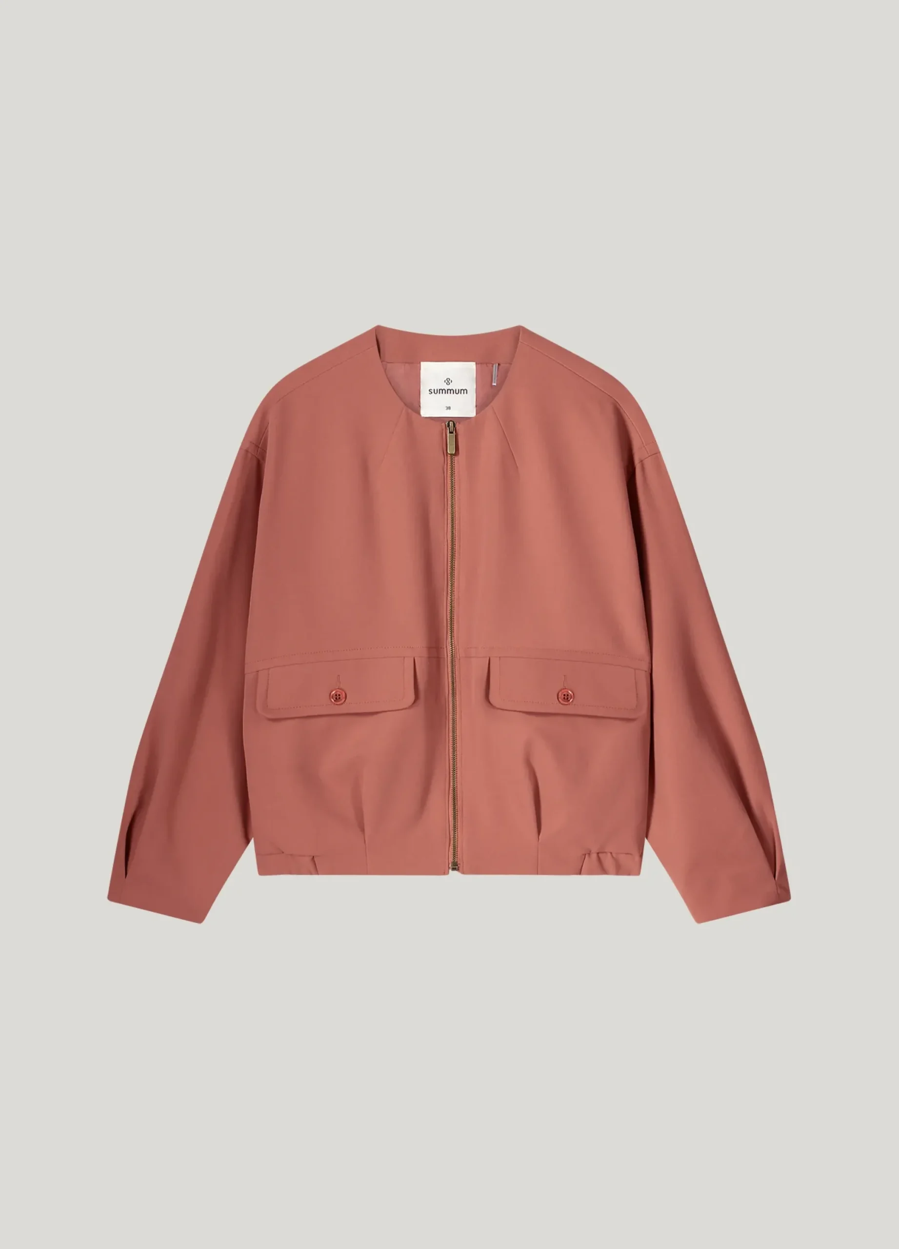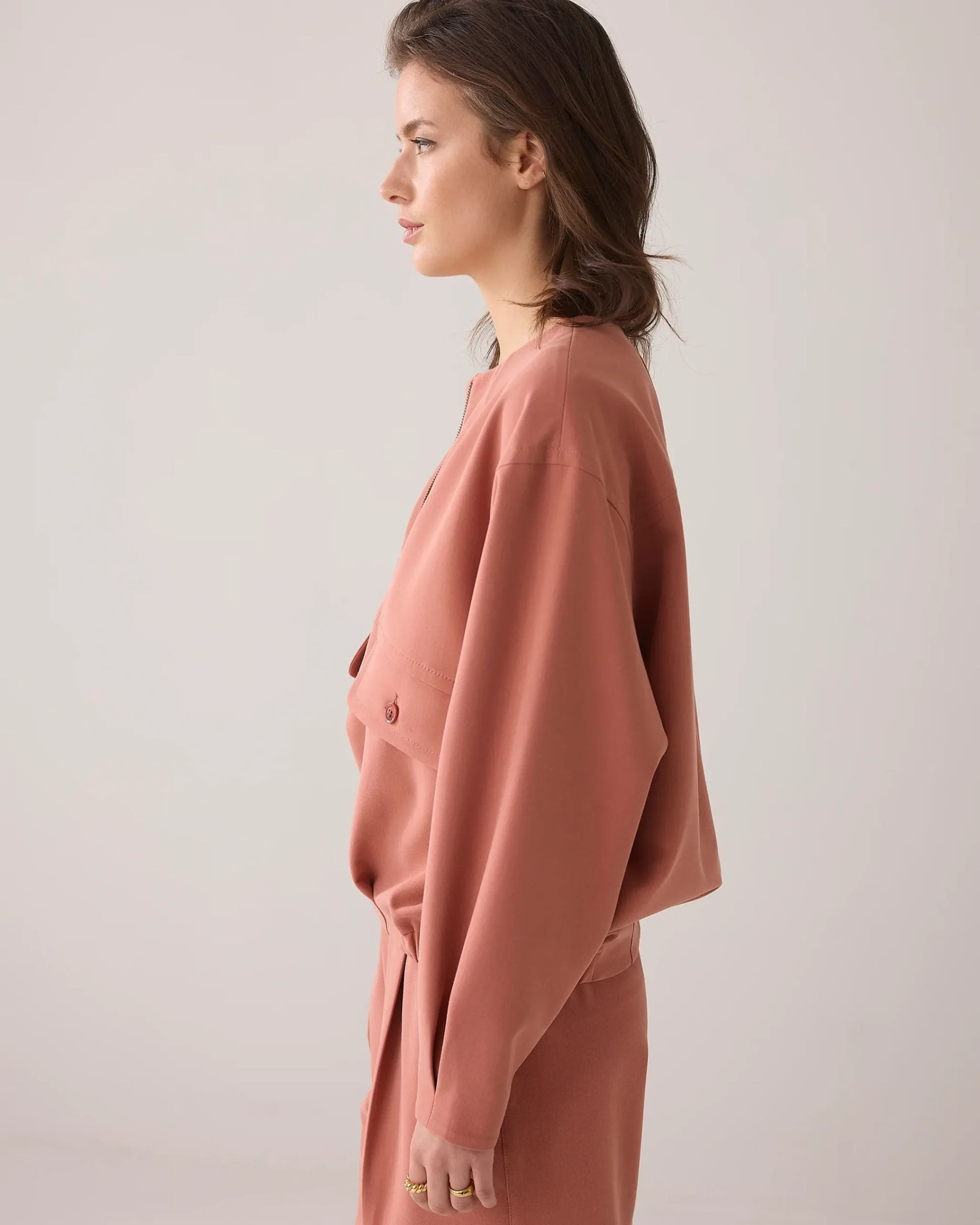 Bomber jacket with a roomy fit and elasticated side hem for a blousy effect. The jacket has front flap pockets and long sleeves with box pleats.