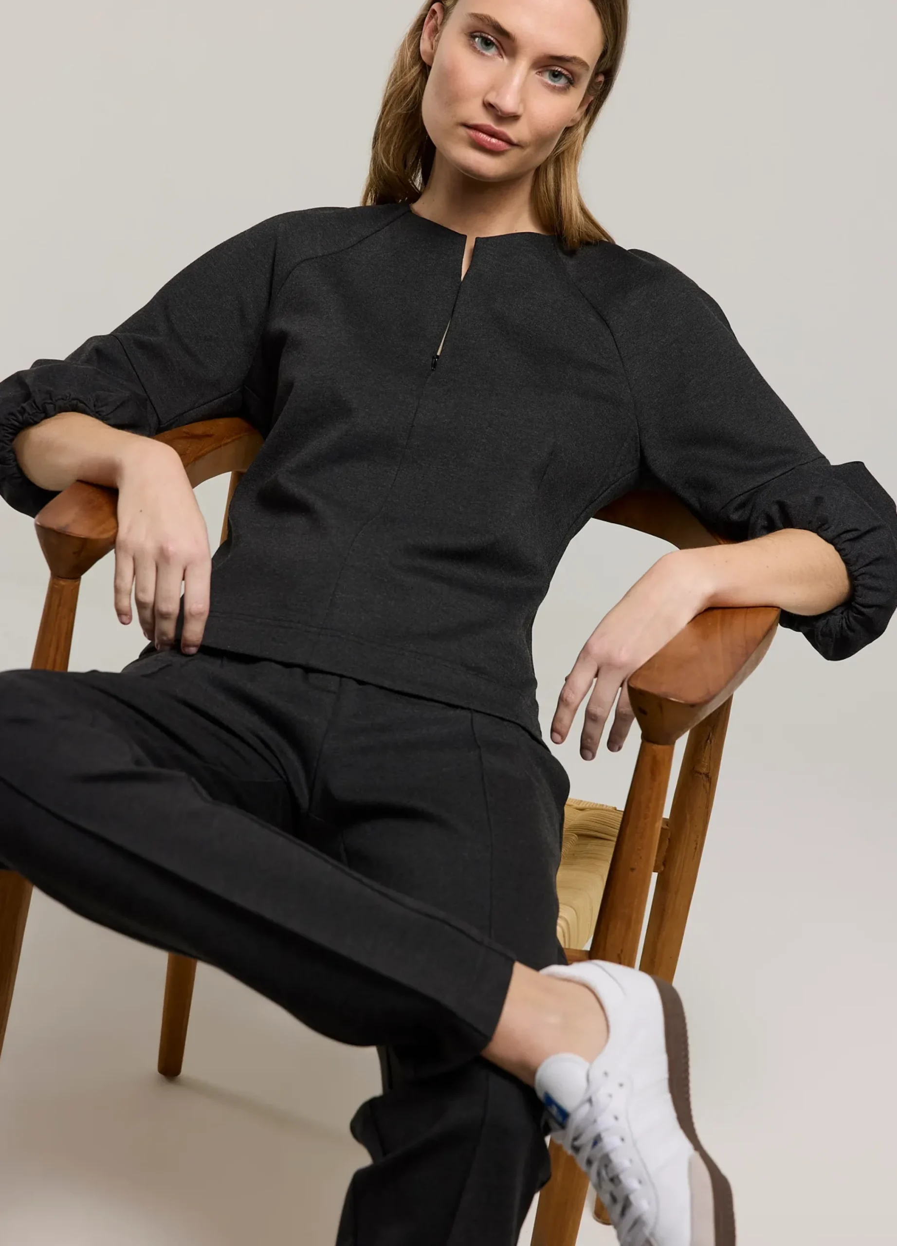 Fitted top with a round neckline and split with concealed zip. The raglan sleeves are flared at the bottom.