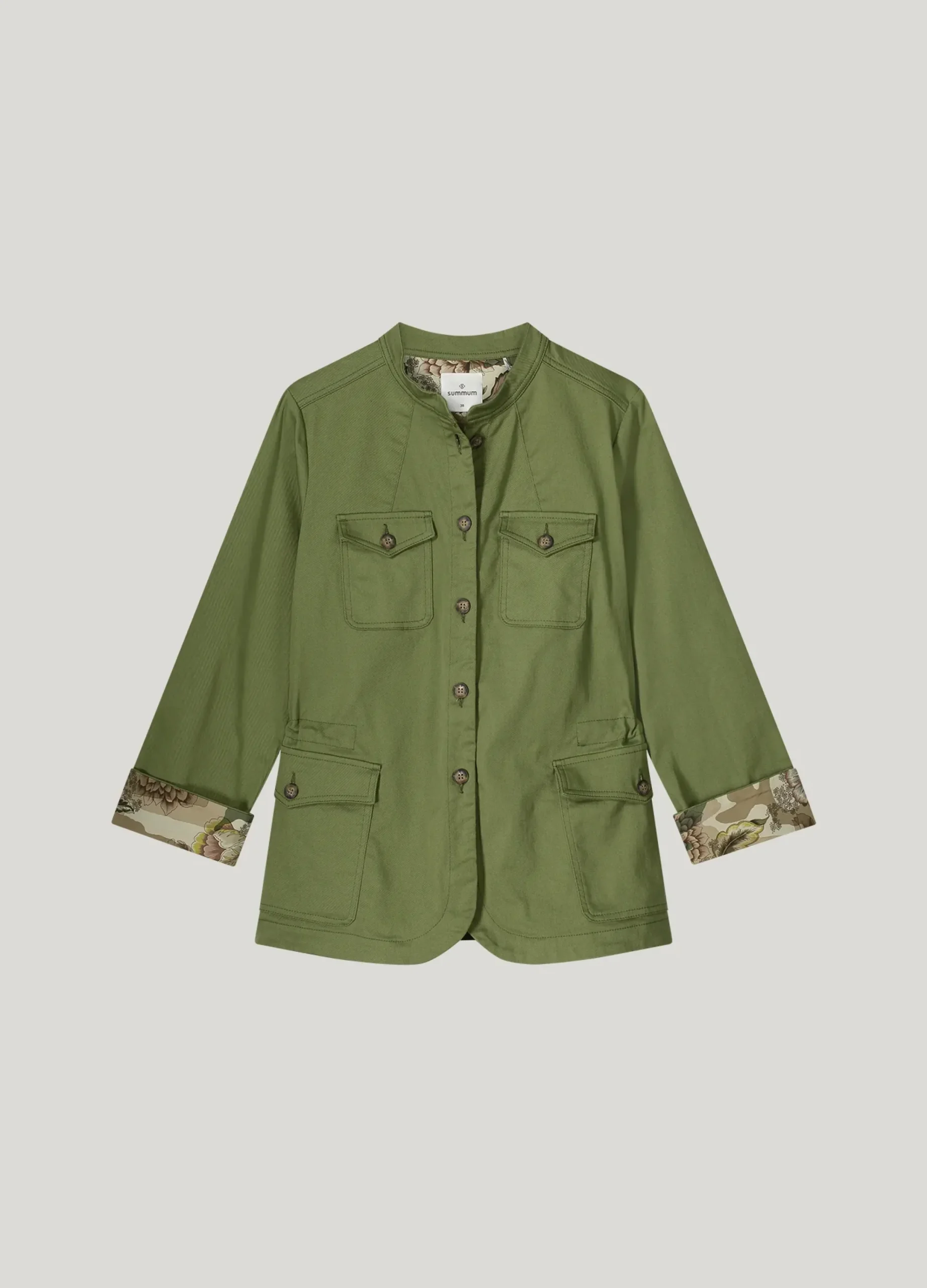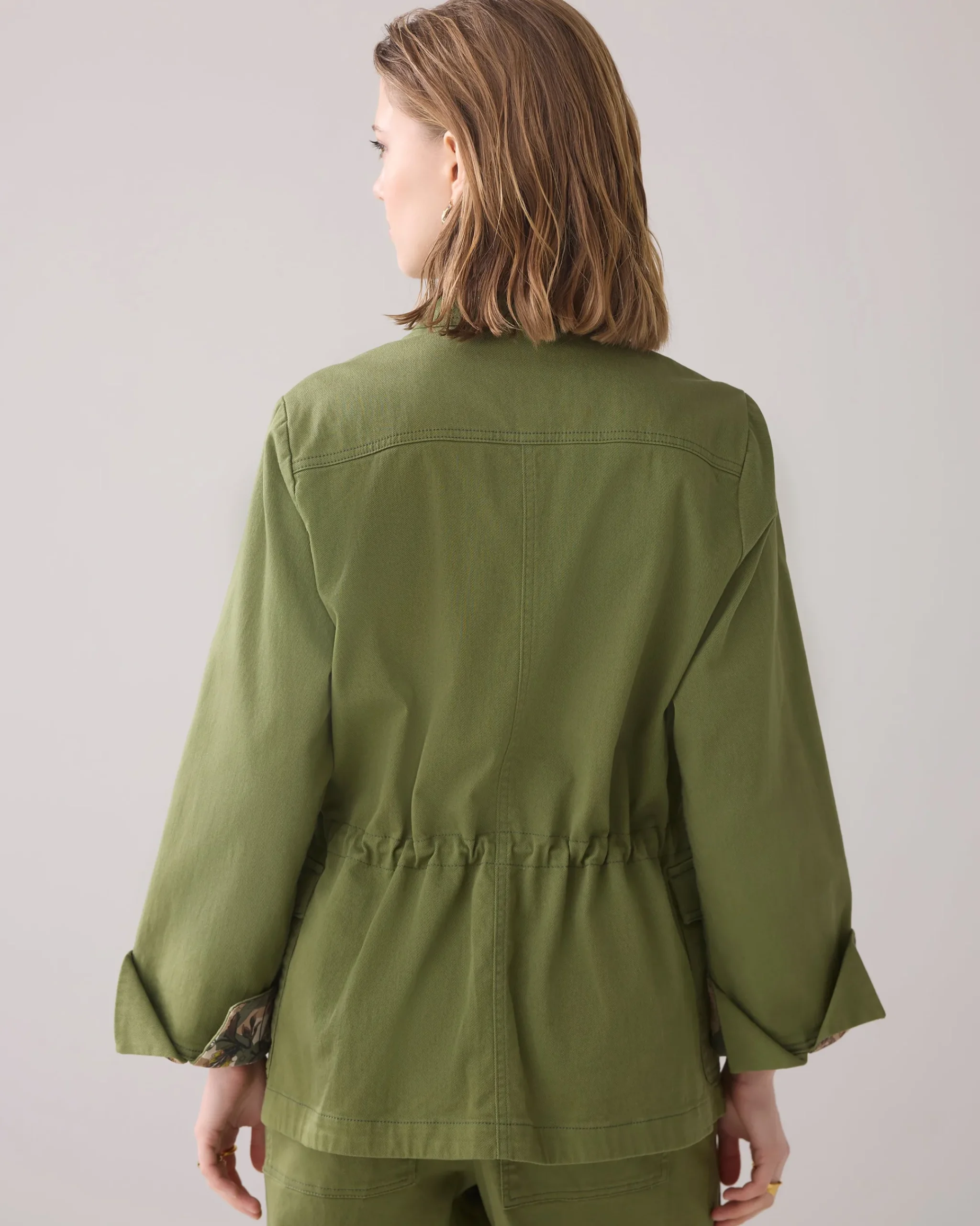 This safari jacket has an adjustable drawstring waist for a fitted effect. When you turn up the cuffs, the floral lining provides a nice contrast.