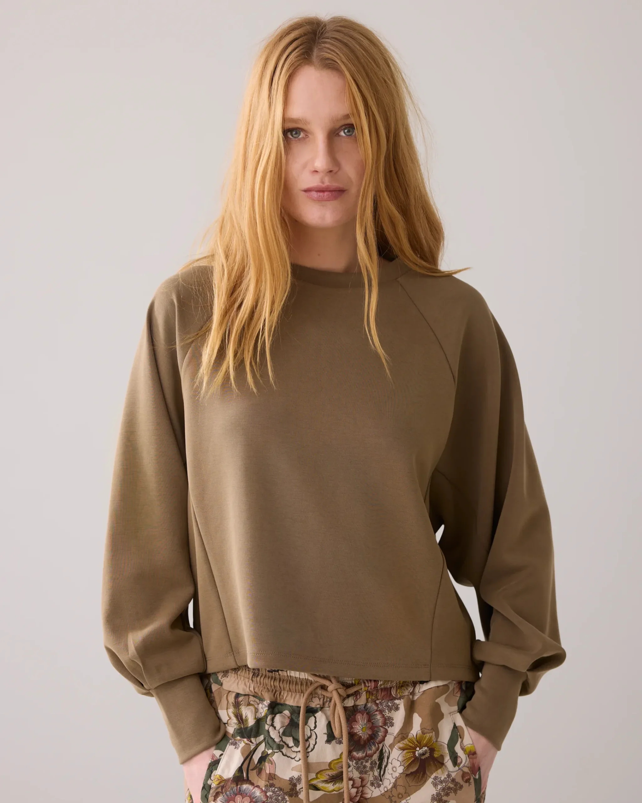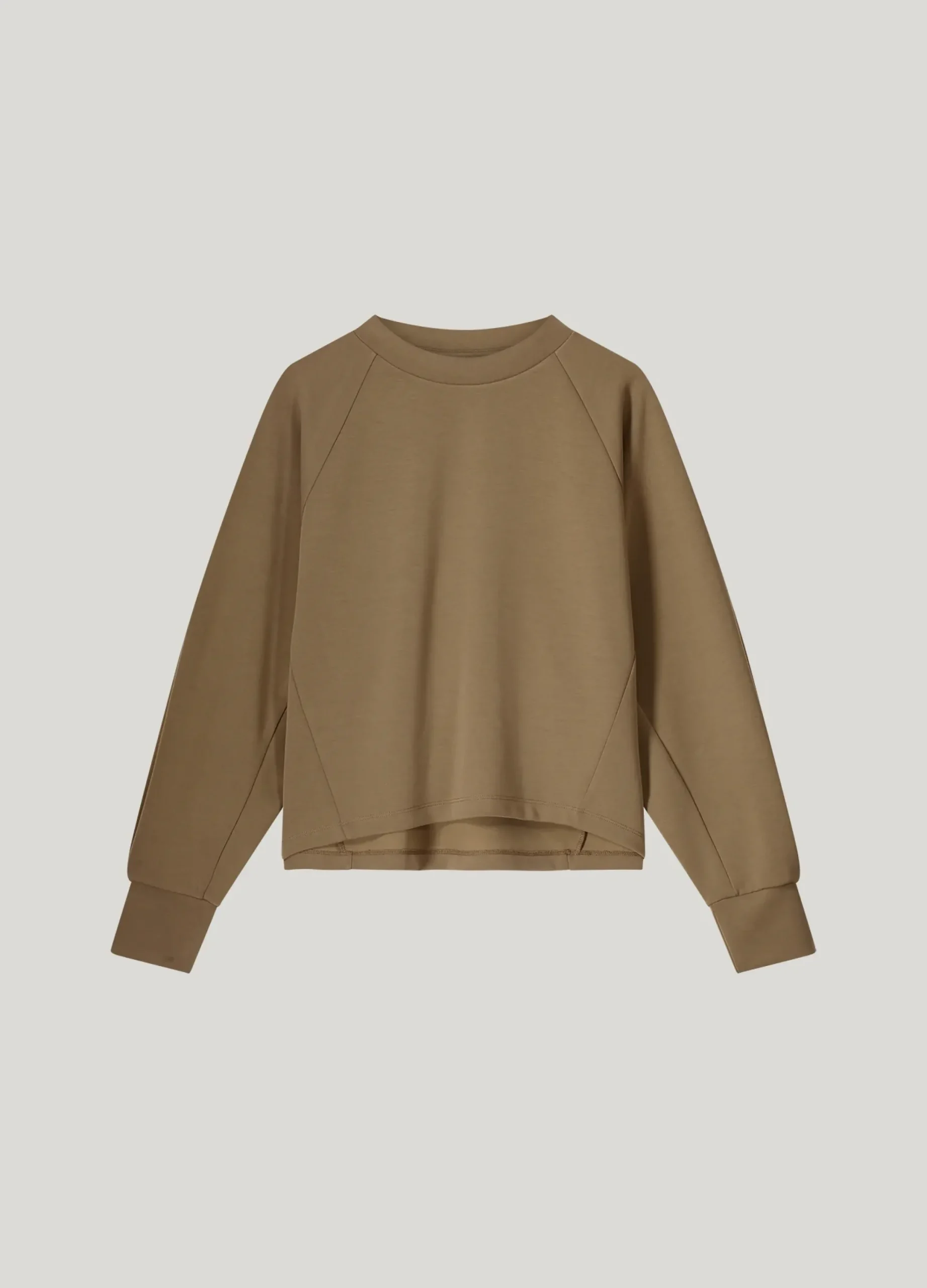 This jumper has a boxy fit with raglan sleeves and decorative seams. The wide, tapered sleeves and pleat detail at the cuffs give this jumper a casual look.