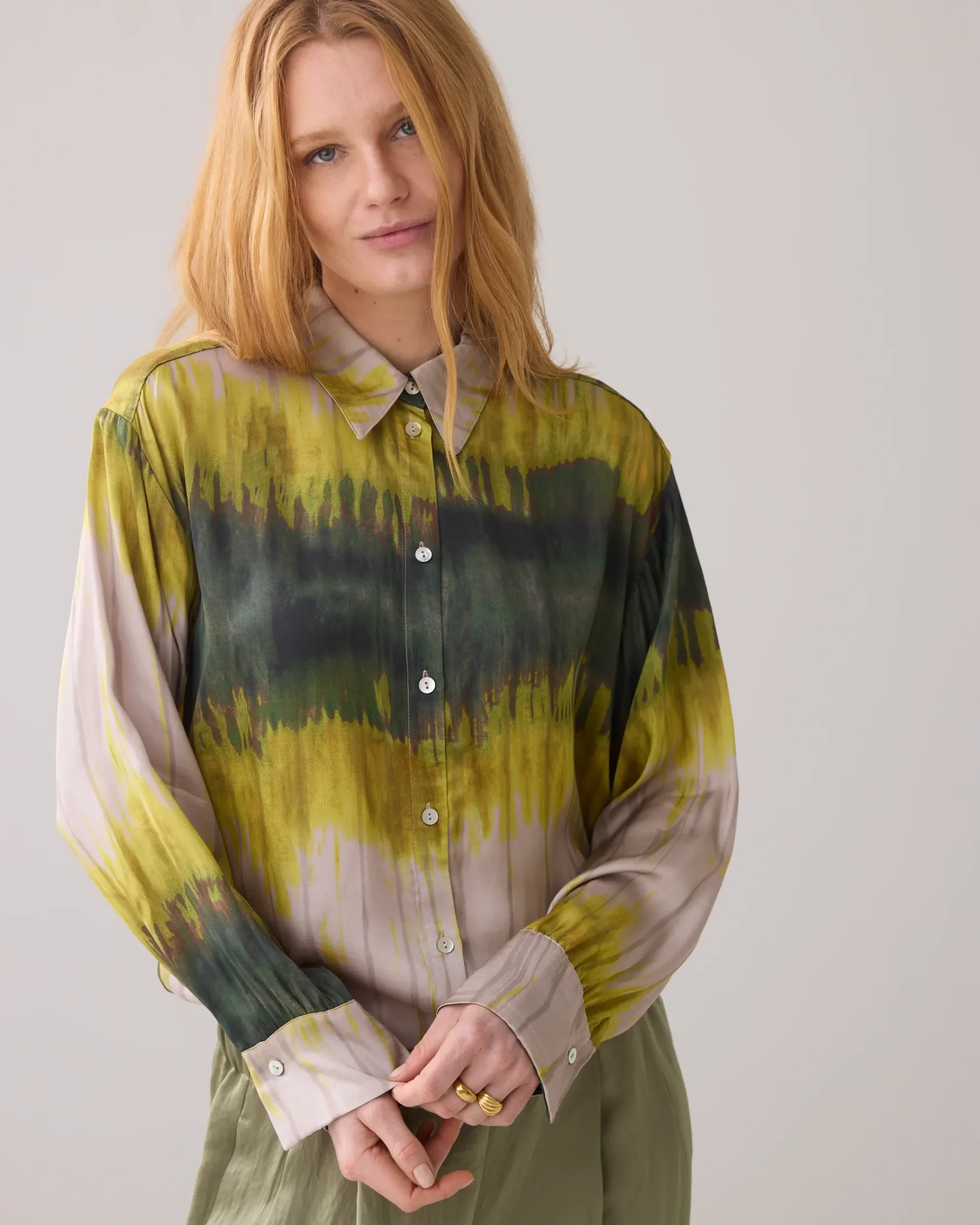 This loose-fitting shirt blouse is made of shiny Ecovero fabric with a tie dye print in a stripe pattern. The box pleat at the back ensures a nice fit. The random placement of the print makes each blouse unique.