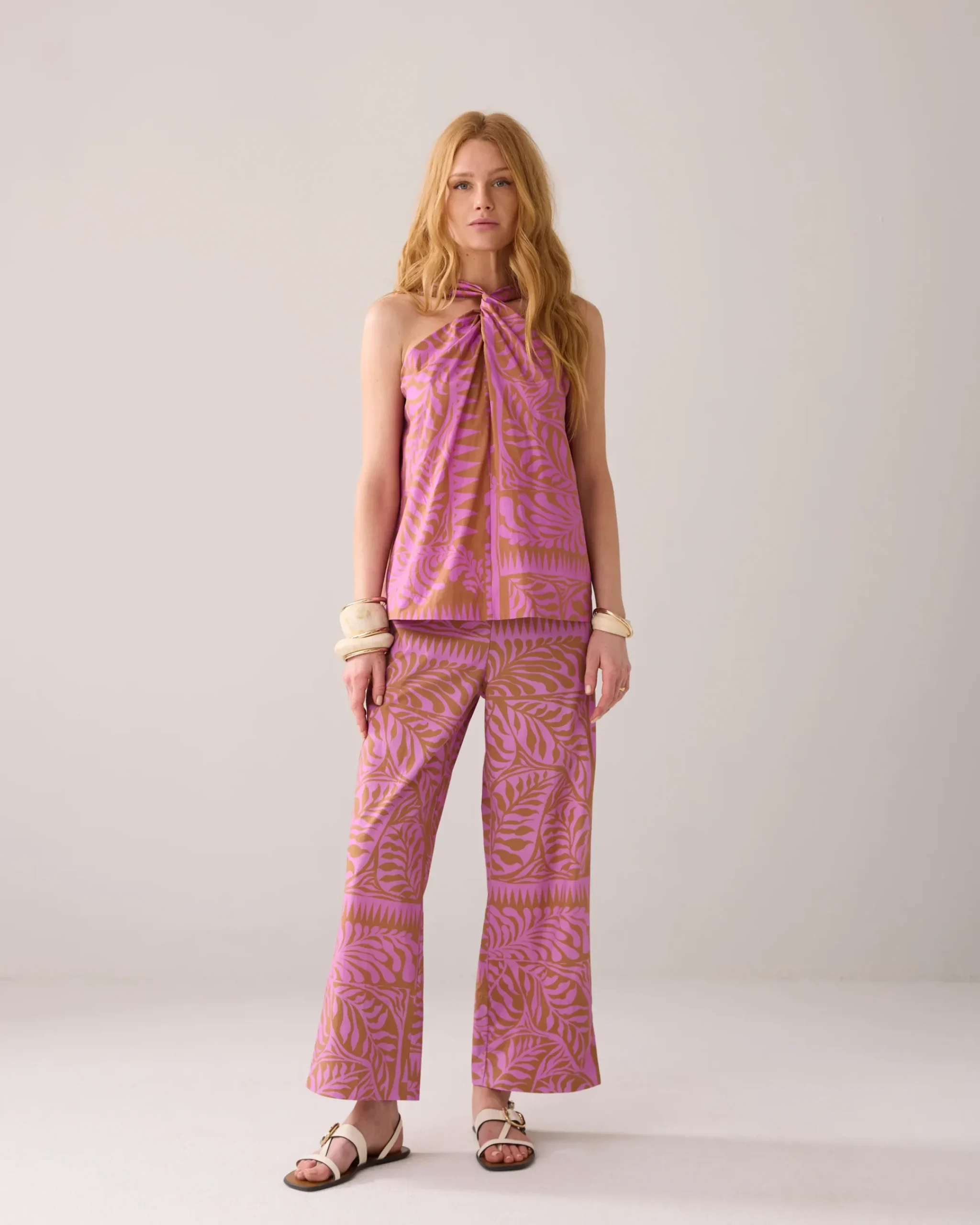 This top has a striking twisted neckline and a subtle A-line fit. The top has a drawstring fastening at the neck.