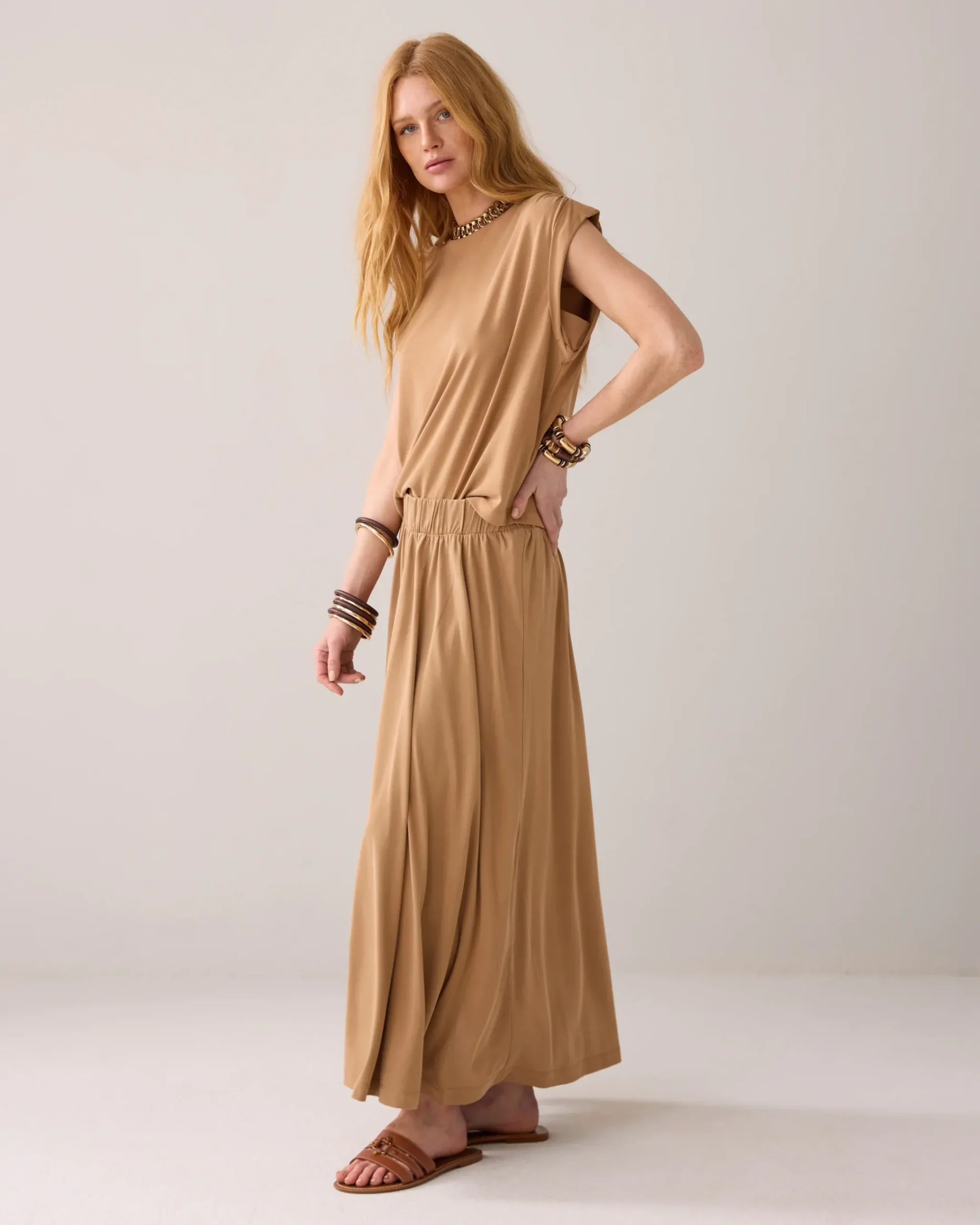 This flowy skirt is made of soft, washed modal jersey and has a comfortable elasticated waistband. The skirt has a wide fit.